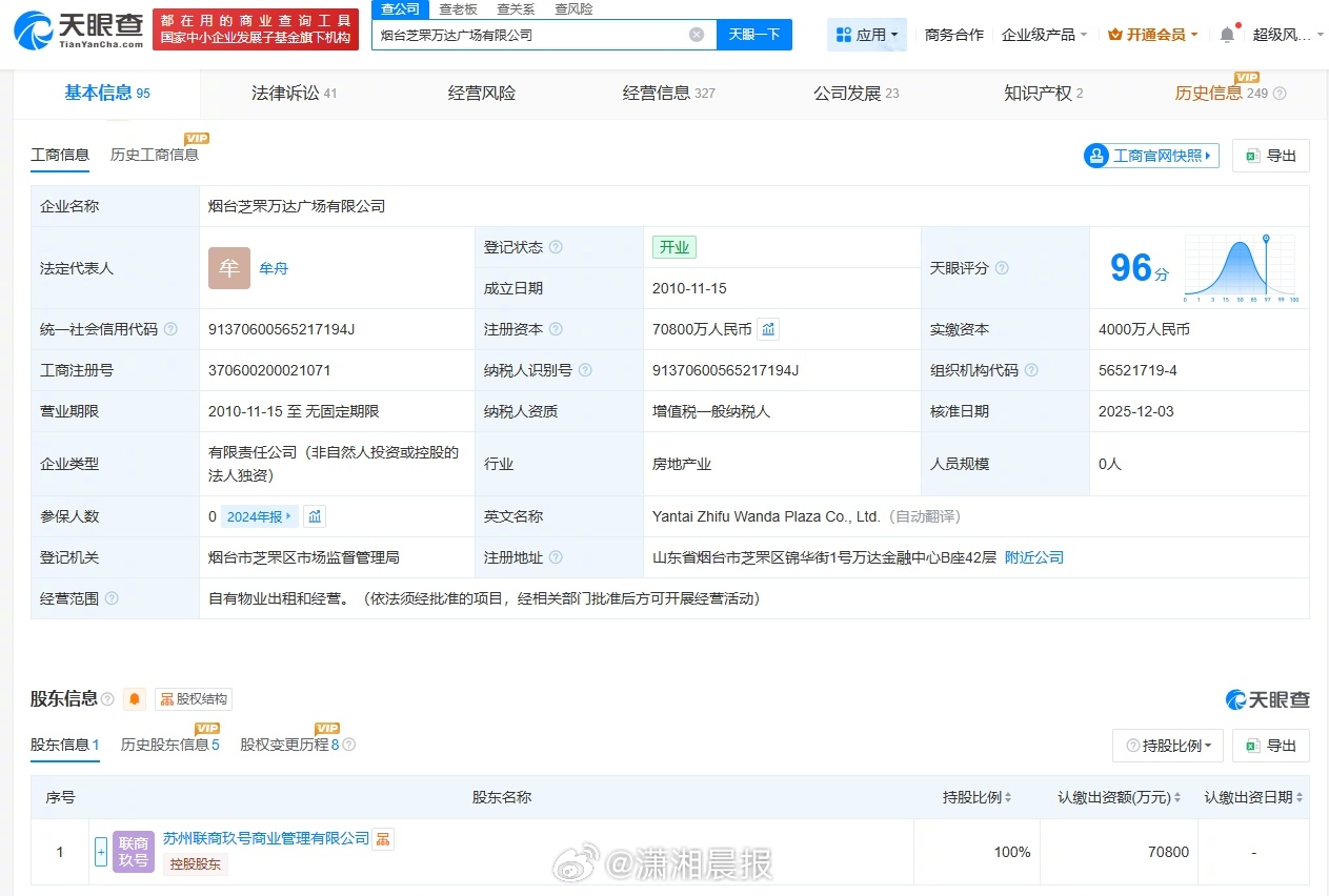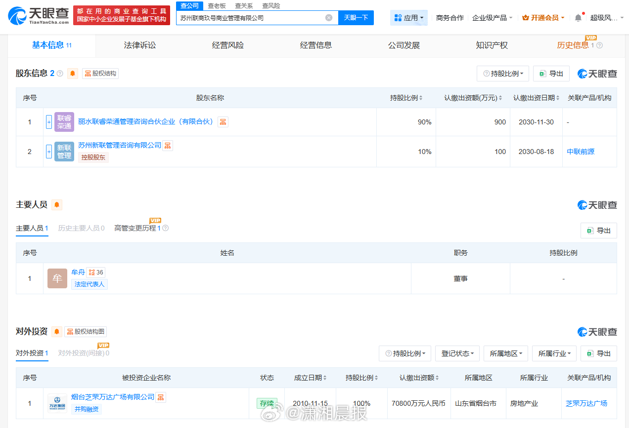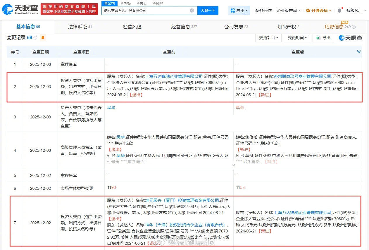 #万达赎回万达广场后又转让#【#万达再次转让烟台芝罘万达广场#】查询天眼查工商信息发现,12月3日,烟台芝罘万达广场有限公司再次发生工商变更,上海万达锐驰企业管理有限公司退出股东行列,新增苏州联商玖号商业管理有限公司全资持股,同时法定代表人、主要人员也发生变更。变更记录显示,12月2日,该公司原股东坤华(天津)股权投资合伙企业(有限合伙)、坤元辰兴(厦门)投资管理咨询有限公司退出,由上海万达锐驰企业管理有限公司全资持股。苏州联商玖号商业管理有限公司成立于今年8月,法定代表人为牟舟,注册资本100万人民币,经营范围包括商业综合体管理服务、企业管理咨询、经济贸易咨询等。股东信息显示,该公司由浙商金汇信托股份有限公司旗下丽水联睿荣通管理咨询合伙企业(有限合伙)和苏州新联管理咨询有限公司共同持股。此前,浙金信托旗下苏州联商柒号商业管理有限公司已接手大连统南企业管理有限责任公司、大连万颛企业管理有限公司。