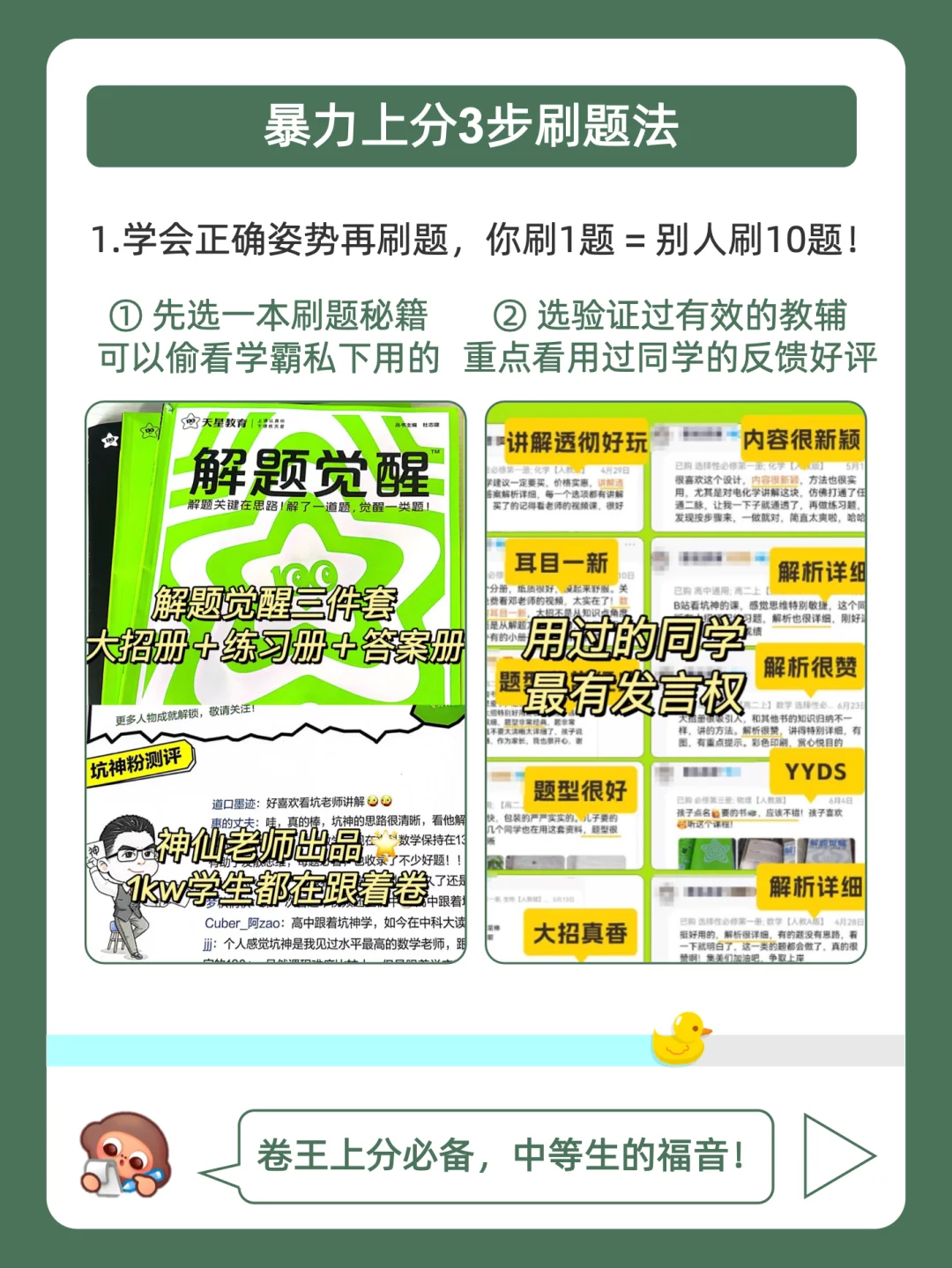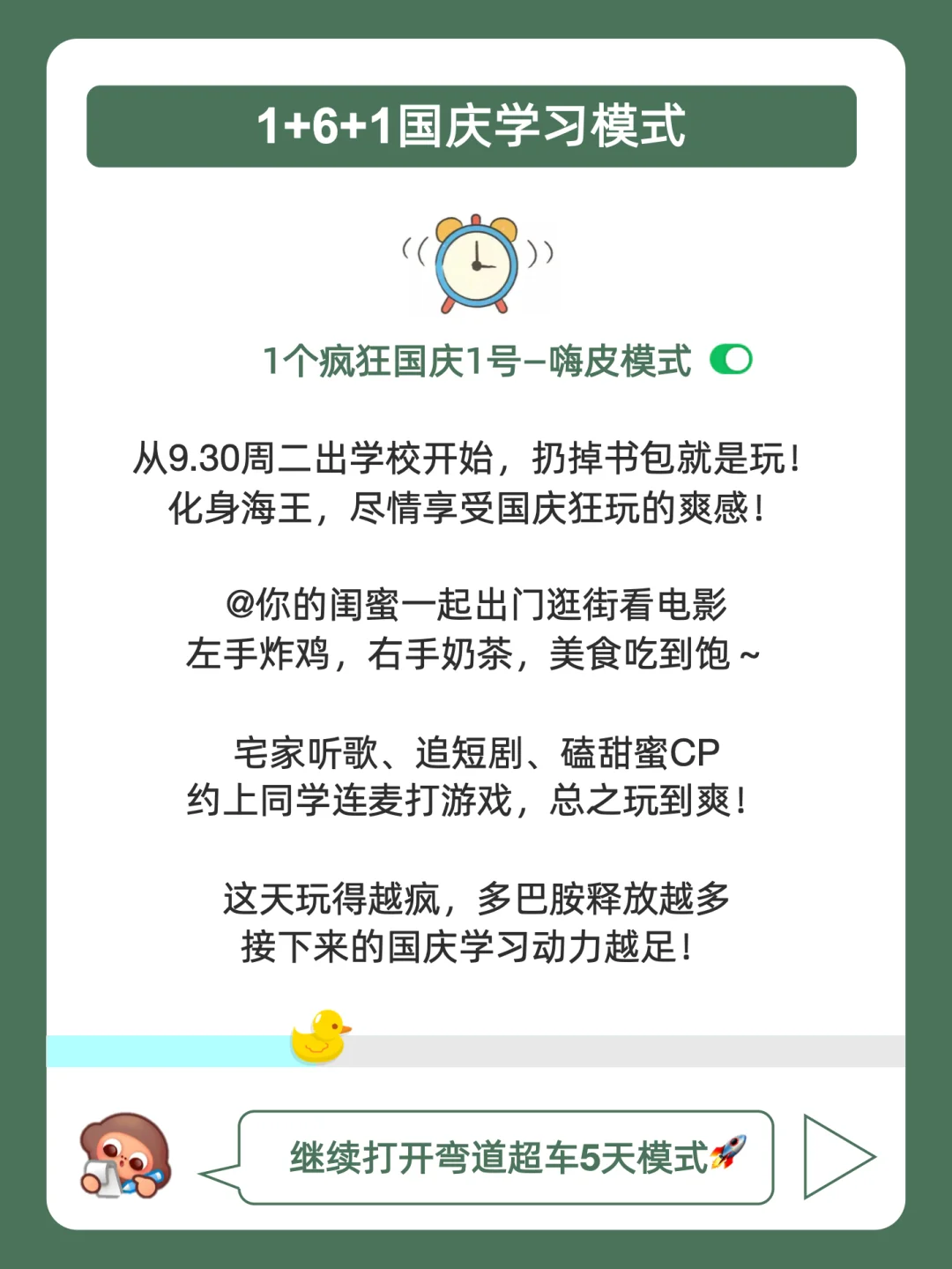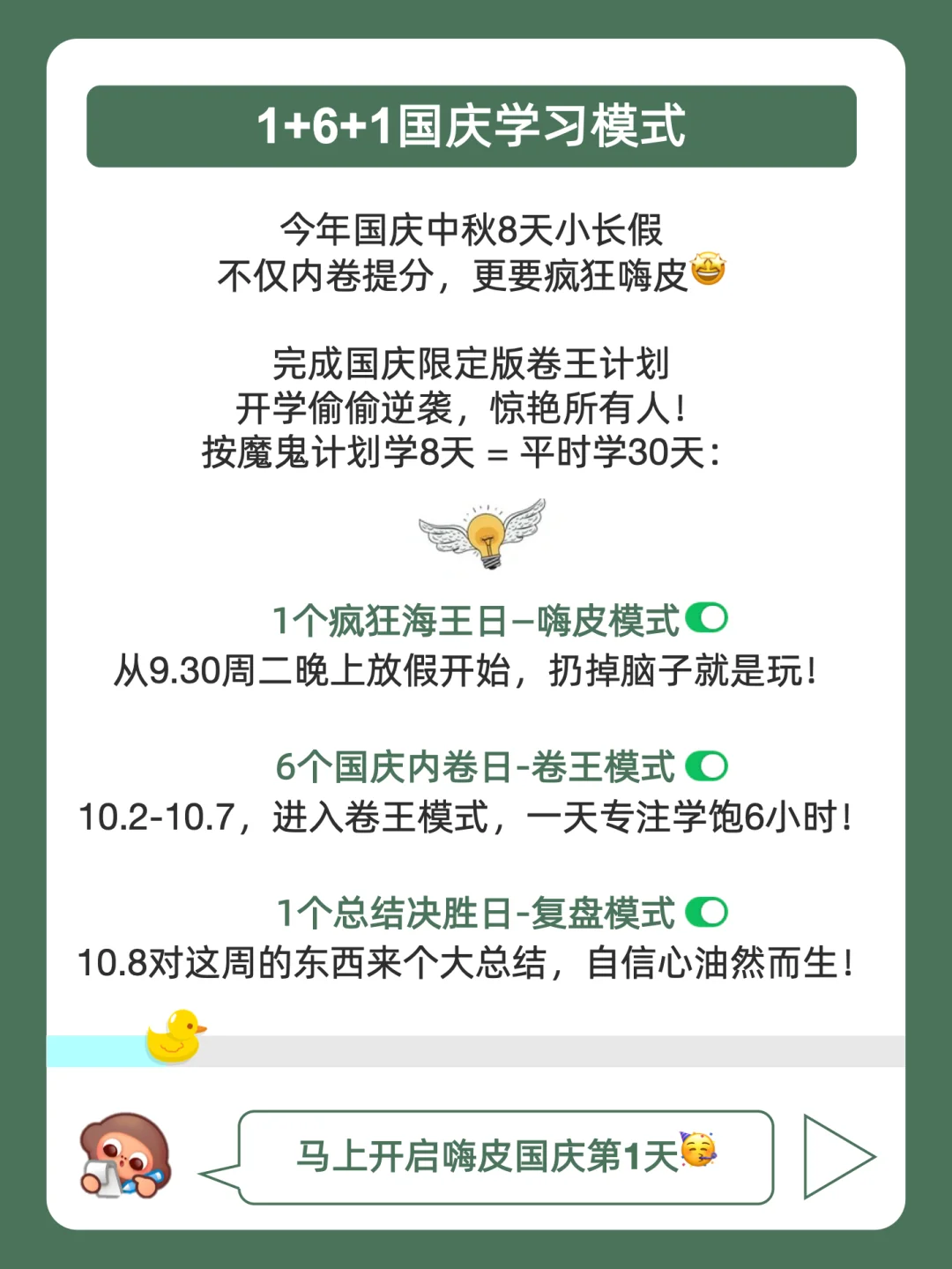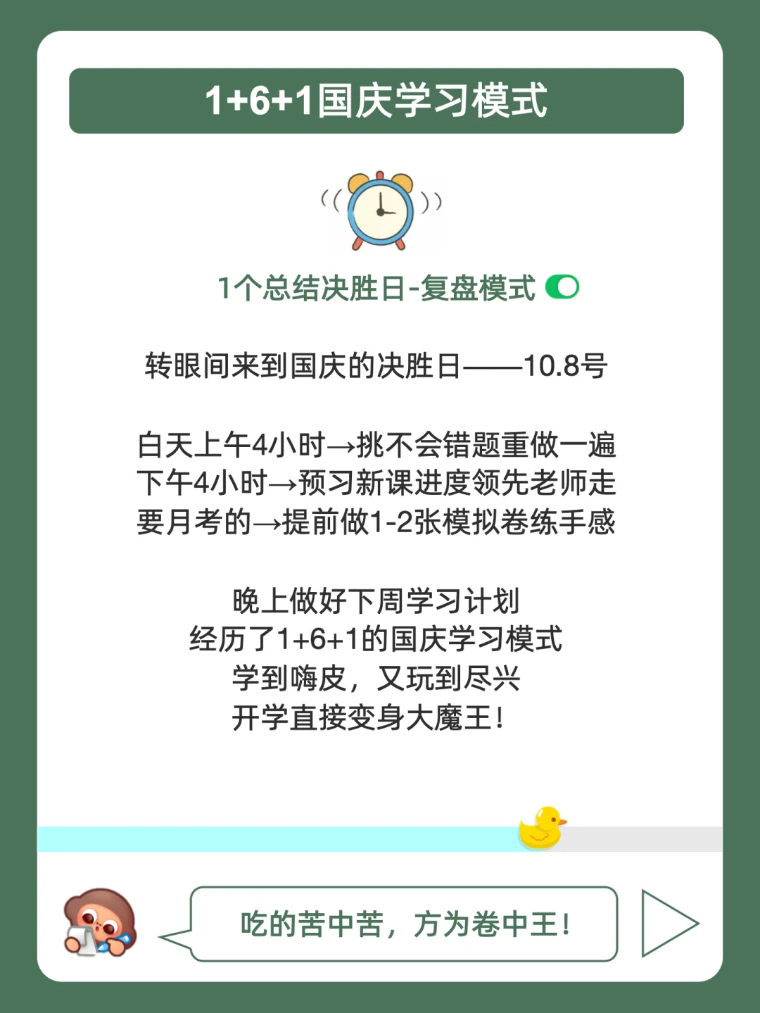 [赞R]国庆迷茫不用怕,鸭鸭带你做卷王!\n.\n[向右R]拿下这篇国庆\"1+6+1\"计划表,学嗨玩爽就在于此!\n.\n刷题时可以用学霸同款《解题觉醒》,题型新颖、大招解题方法好用,提分嘎嘎牛,适合中等及以上学生党都可以用!赶紧学起来,趁国庆8天假期狠狠复习,开学月考直接一鸣惊人!\n.\n🐣我是鸭鸭,持续分享更多学霸秘籍,陪宝子们学习开窍。考试开挂!\n