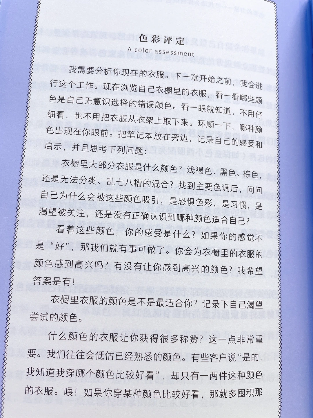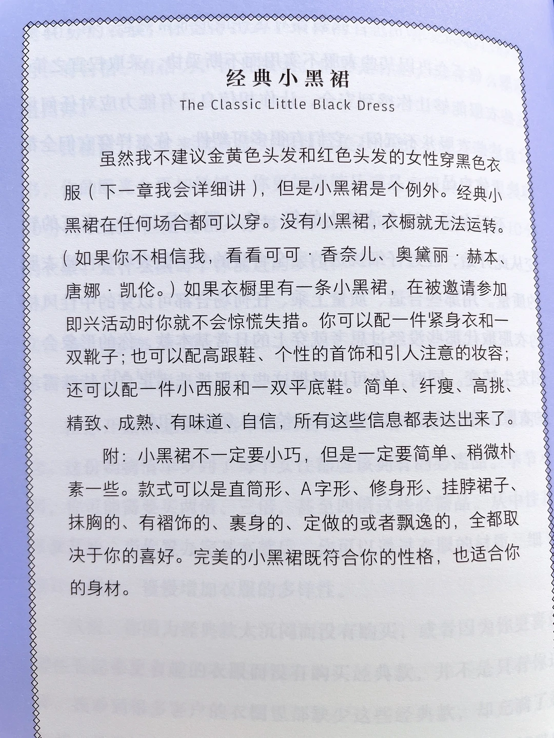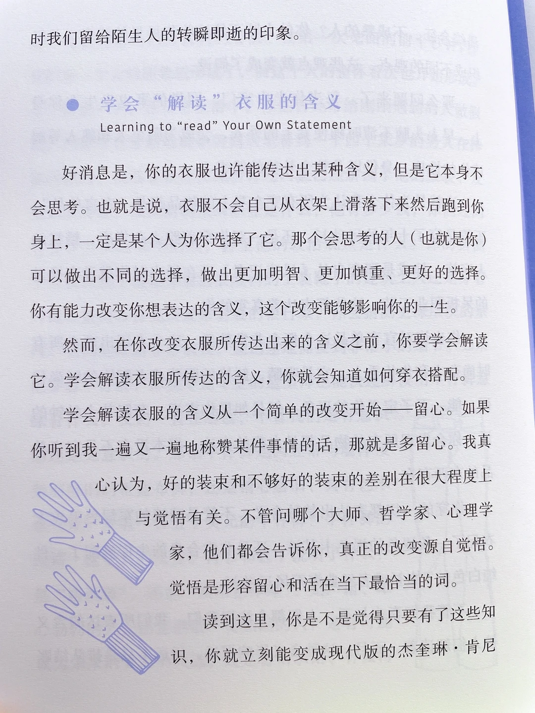 拿到这本书一两天就读完了,特别的实用。读起来也很轻松。书本里很多穿衣搭配的新型理念,附加很多手绘的插画会加深我们的阅读印象。书本主要想告诉我们怎样了解自己的优点、怎样利用色彩、以及怎样表达穿搭的意义,可以说是授人以渔