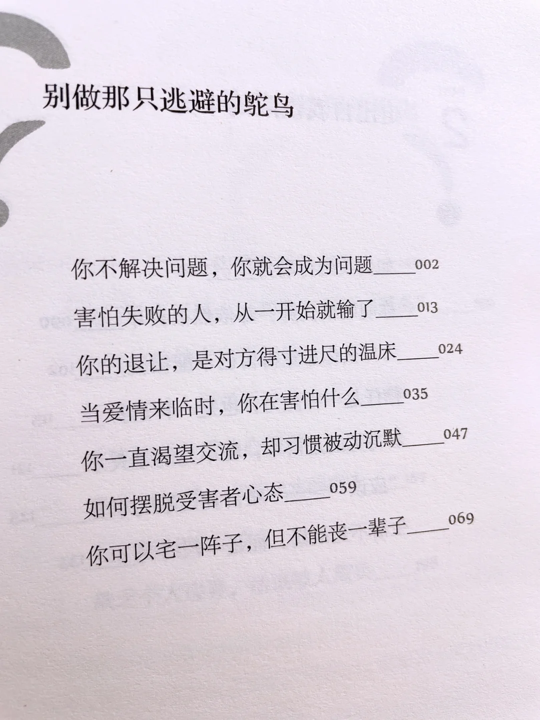 最近对心理书籍疯狂着迷,有一种去考心理咨询师的想法[黄金薯R],一直觉得自己有点回避型人格,最近刚好读到这类型的书,真的被拯救到,其实绝大多数人都会存在这种回避心理,程度不同而已,有时候自己也不知道在害怕什么!