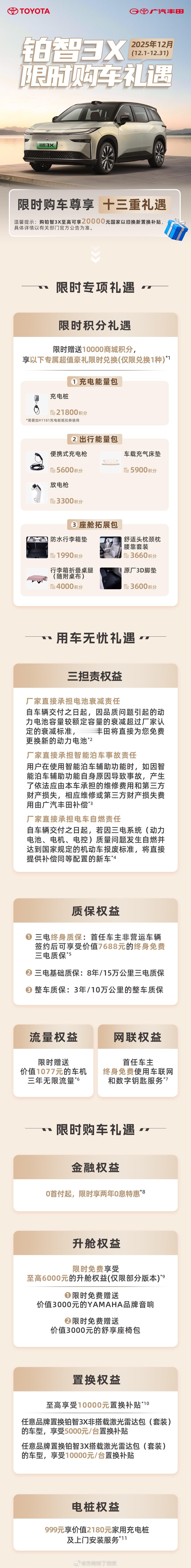 广汽丰田11月销量64905台铂智3X连续两个月销量破万刚扒完广丰 11 月销量数据,属实有点惊喜。11月单月销量64905台,1-11月累计都冲到704024台了,同比还保持正增长,这势头是真稳!其中最亮眼的当属铂智3X,连续两个月销量破万,11月直接交付10010台,上市才8个月累计交付超6.2万台,这爆款体质没跑了。能持续圈粉,除了大厂品质兜底,广丰这用户思维是真到位——11月30日刚推了年内最大规模OTA,新增车头泊入、AI大模型、CarPlay这些实用功能,直击用车痛点,迭代速度完全不输新势力。更让人安心的是厂家的"三担责"承诺:电池自燃、智能泊车辅助事故、电池衰减都担责,用车顾虑直接打消。照这节奏,广丰12月冲击77万辆产销目标,大概率稳了。你们觉得铂智3X能一直保持爆款势头吗?