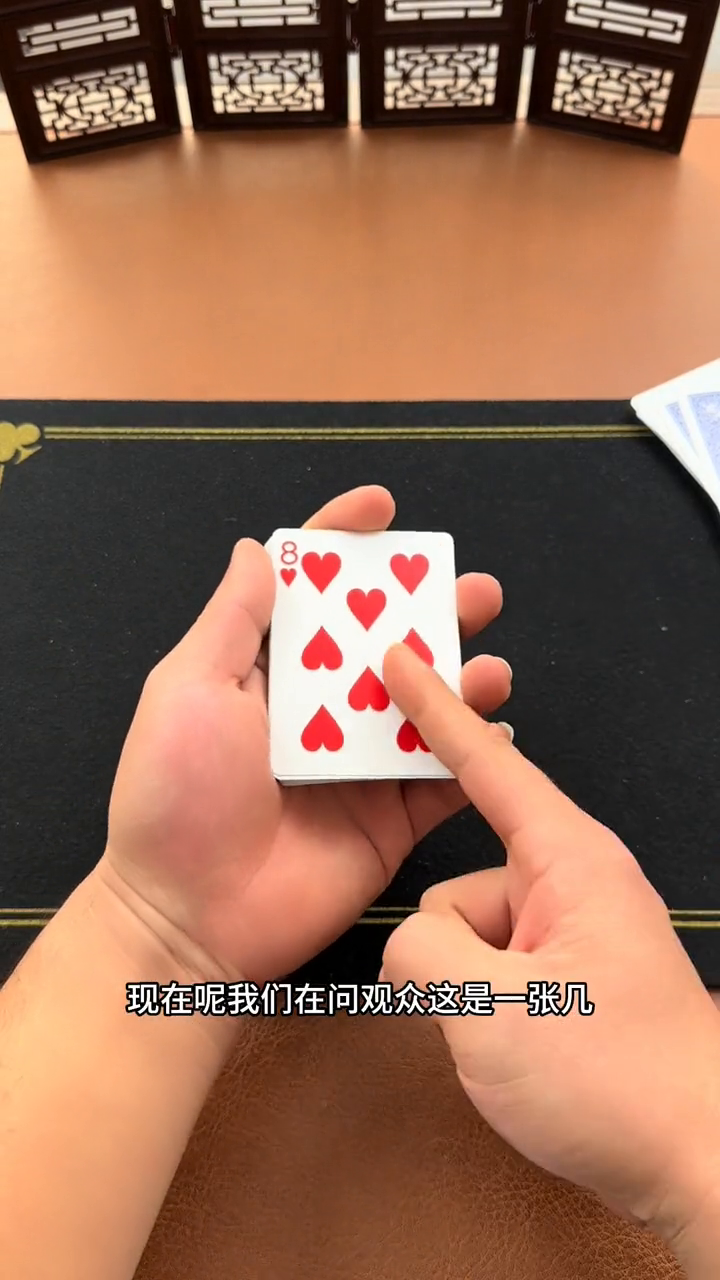 ·这个时候第一个效果就出来了,问观众这张牌是你选的牌吗?观众肯定说不是。现在再问观众这是一张几?观众说这是一个8,现在给它放到一边。接下来往下数上8张牌,也可以让观众自己去数,都是可以的。第八张牌给到观众,肯定就是他选的那一张牌方块,老k。
