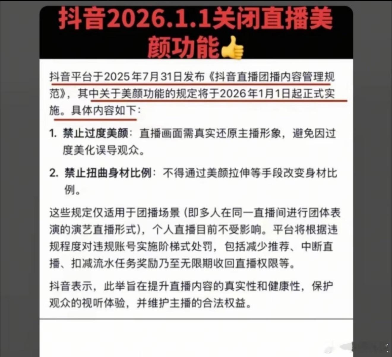 抖音直播 禁止过度美颜又断章取义,人家明确了只针对团播,不知道还以为个人直播也不能过度美颜,并且也不是完全禁止美颜功能,而是对“过度修饰”进行规范。有些说什么开美颜就FH,怎么可能,平台不会自断臂膀的。 团播 美颜拉腿其实这些团播也有对策,加大化妆力度和灯光效果,这种怎么破?