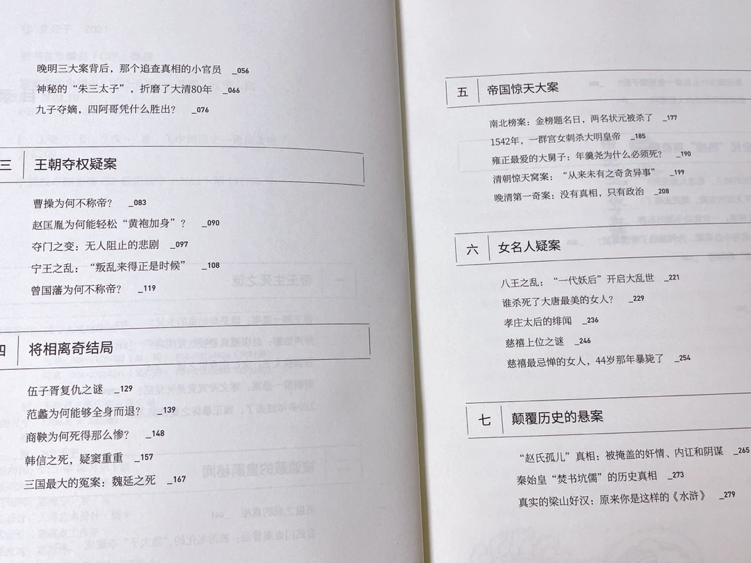 全书有8 个章节,分别以“帝王的生死之谜”“被遮蔽的皇嗣秘闻”“王朝夺权 疑案”“将相结局奇案”“帝国惊天大案”“女名人疑案”“颠覆历史的悬案”“全民‘热搜’的离奇案”为主题,选取了 40 个历史疑案,从先秦到晚清,上至帝王将相,下至三教九流,糅合史学、考古学、医学以及法学等多元学科视角,运 用吊线跟踪、混合洗牌等刑侦手法,大胆推测、小心求证,穿越千年迷雾,为读者还原历史真相