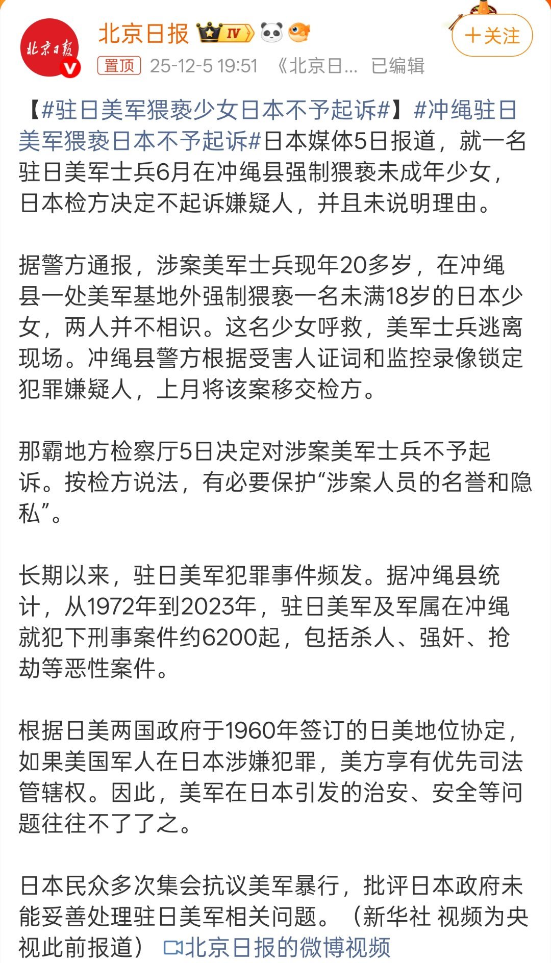 驻日美军猥亵少女日本不予起诉这不妥妥的中华民国再现吗?内战时,驻中国美军强奸中国女大学生,当时的国民政府也无动于衷,最后引发游行示威。不过,对于日本这个国家来说,一切都是它应得的,它不开启二战,就啥事都没有。老张杂谈
