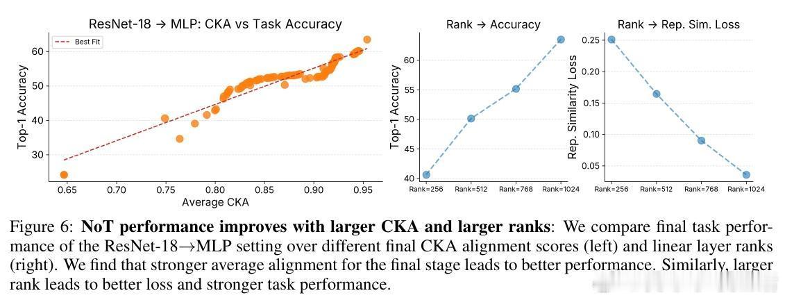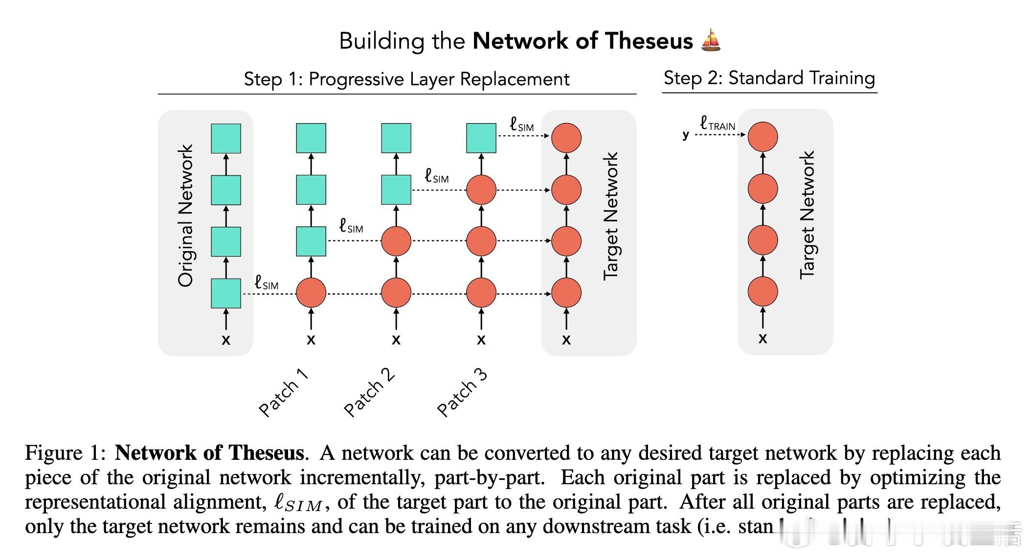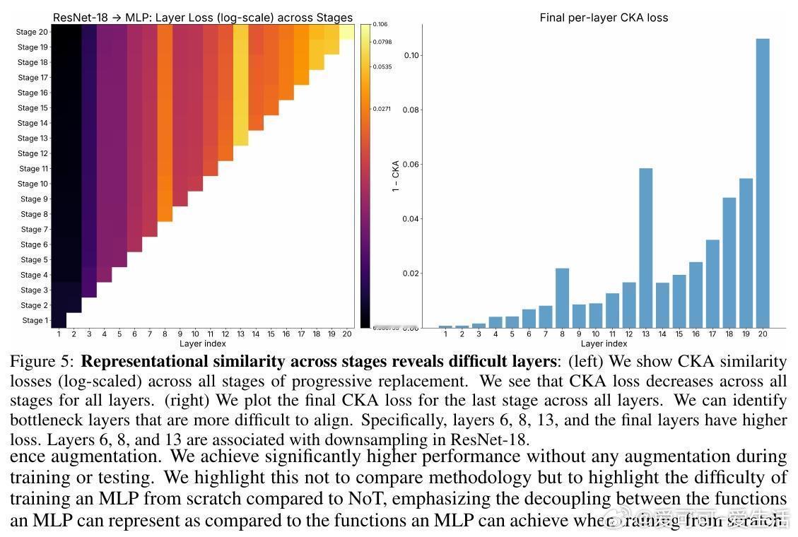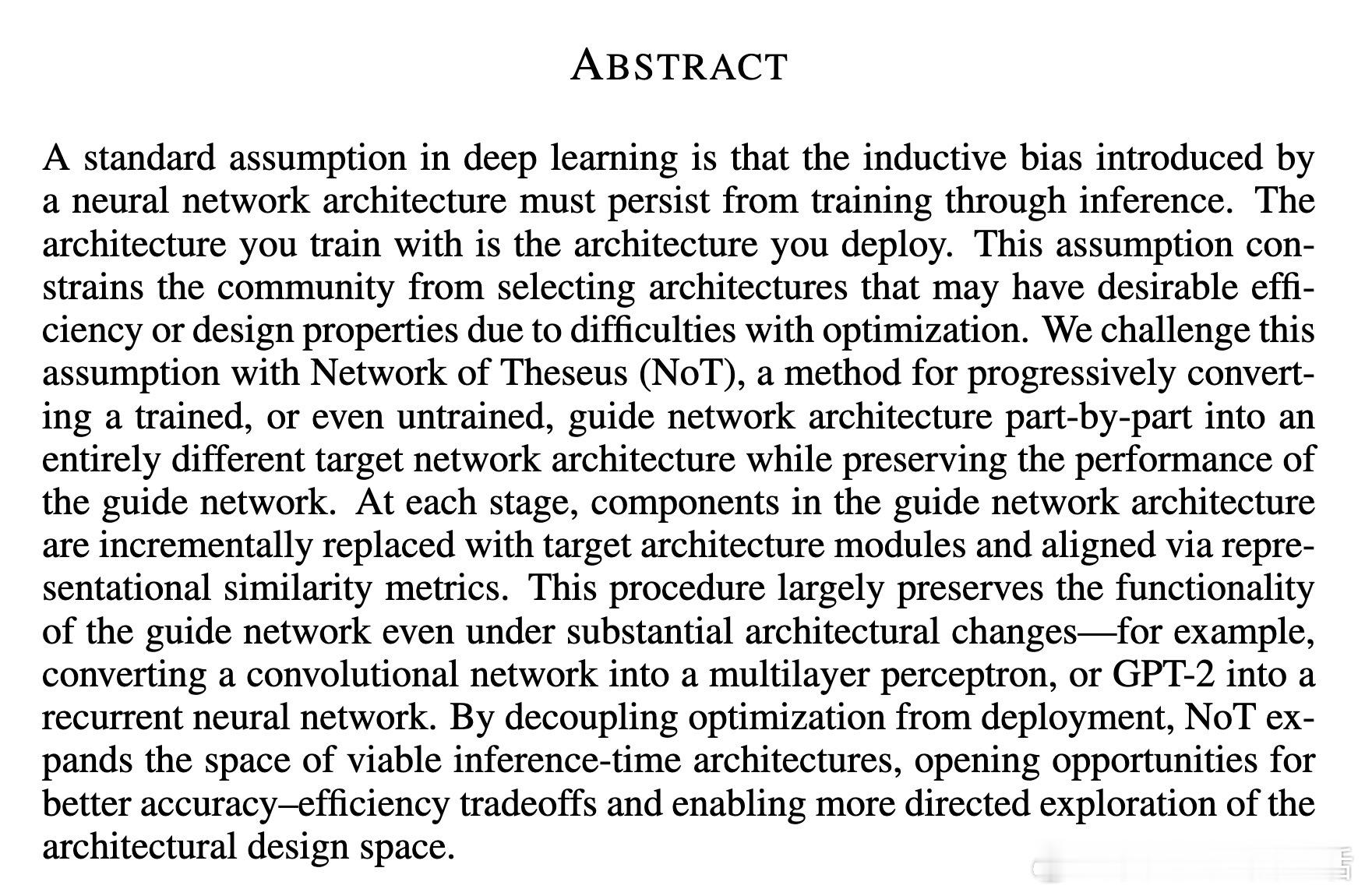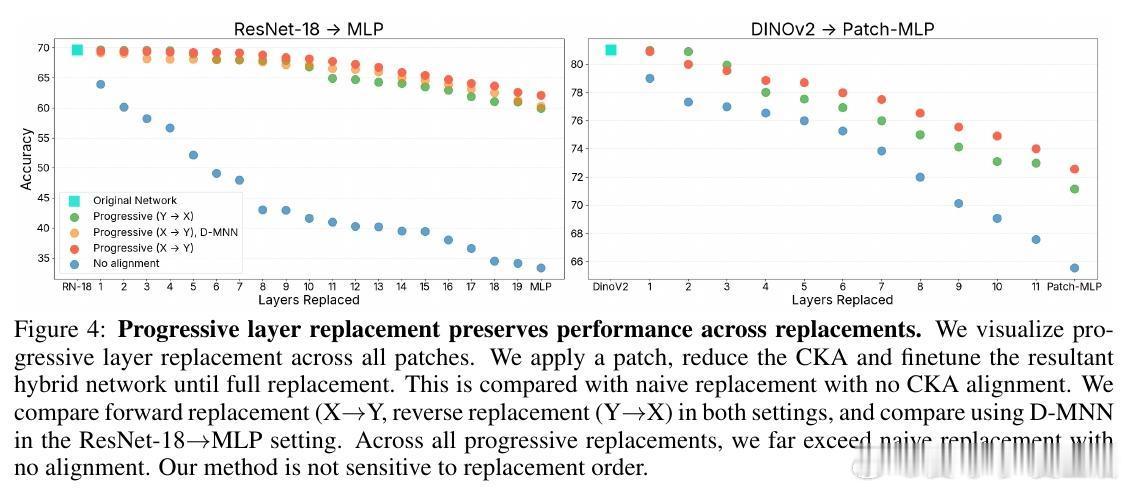 [LG]《Network of Theseus (like the ship)》V Subramaniam, C Conwell, B Katz, A Barbu... [MIT CSAIL & Johns Hopkins University] (2025) 在深度学习领域,传统观念认为训练时使用的神经网络架构必须与推理时保持一致——即“训练用什么,部署就用什么”。这一假设限制了架构设计的灵活性和效率优化的空间。本文提出了“Network of Theseus”(NoT)方法,打破了这一桎梏,实现了跨架构的渐进式转换,同时最大限度地保留了原始模型的性能。NoT灵感源自“忒修斯之船”悖论:当一艘船的所有部件都被逐一替换后,它还是原来的那艘船吗?对应神经网络,NoT通过分阶段、分部件地将“指导网络”的各层逐渐替换成“目标网络”中的模块,并利用表示相似性指标(如线性CKA和新提出的D-MNN)对替换模块的激活进行对齐训练,确保功能的连续性和性能的保持。关键亮点包括:1. 架构解耦训练与推理 NoT允许训练和推理时采用不同架构。模型可先在易于优化的架构(如深层卷积网络)上训练,再转换为更高效或更适合部署的架构(如轻量级MLP或递归网络),极大拓展了设计空间。2. 广泛的架构转换能力 实验涵盖了卷积网络到多层感知机(ResNet-18→MLP)、视觉Transformer到Patch-wise MLP(DINOv2→Patch-MLP)、Transformer语言模型到递归神经网络(GPT-2→RNN)、以及深层到浅层网络的转化(ResNet-50→ResNet-18)等多种场景,均能保持接近原网络的性能。3. 未训练网络也能传递结构先验 令人惊讶的是,NoT在未训练的指导网络上同样能有效工作,说明未训练网络本身蕴含的结构性偏置就足够传递给目标网络,拓宽了架构迁移和初始化的可能性。4. 逐层渐进替换优于一次性替换 实验对比了多种替换调度策略,发现逐层递进式替换稳定性最好,能最大程度降低误差累积,确保转换过程中的表现连续性。5. 提出新型表示相似度指标D-MNN 基于互为最近邻的思想,D-MNN在捕获局部几何结构上优于传统CKA,为表示对齐提供了更丰富的信号。6. 实际应用与理论启示 NoT不仅能挖掘更优的准确率-效率折中方案,还启发我们重新思考神经网络架构设计的目标:训练时应着重构建“可被不同架构发现”的表示,而非限定最终推理架构,真正实现训练与推理的解耦。总结来说,NoT通过代表性对齐和分阶段替换,开启了“架构灵活转换”的新时代,挑战了传统的训练部署一体化范式,为模型压缩、加速和架构搜索提供了新思路。未来研究将聚焦于提升难对齐层的转换效果、扩展至更多复杂架构以及自动化替换调度策略。详细论文见:arxiv.org/abs/2512.04198