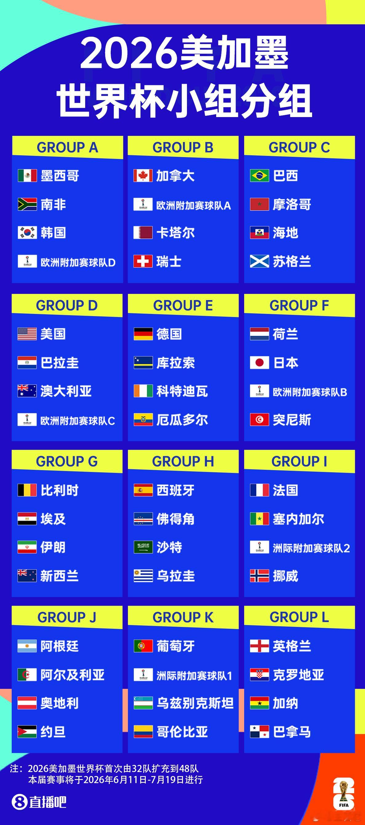 ‼️ 美加墨世界杯完整抽签分组【A组】墨西哥、南非、韩国、欧洲附加赛球队D【B组】加拿大、欧洲附加赛球队A、卡塔尔、瑞士【C组】巴西、摩洛哥、海地、苏格兰【D组】美国、巴拉圭、澳大利亚、欧洲附加赛球队C【E组】德国、库拉索、科特迪瓦、厄瓜多尔【F组】荷兰、日本、欧洲附加赛球队B、突尼斯【G组】比利时、埃及、伊朗、新西兰【H组】西班牙、佛得角、沙特、乌拉圭【I组】法国、塞内加尔、洲际附加赛球队2、挪威【J组】阿根廷、阿尔及利亚、奥地利、约旦【K组】葡萄牙、洲际附加赛球队1、乌兹别克斯坦、哥伦比亚【L组】英格兰、克罗地亚、加纳、巴拿马【附加赛球队】欧洲区A组:意大利vs北爱尔兰,威尔士vs波黑欧洲区B组:乌克兰vs瑞典,波兰vs阿尔巴尼亚欧洲区C组:土耳其vs罗马尼亚,斯洛伐克vs科索沃欧洲区D组:丹麦vs北马其顿,捷克vs爱尔兰洲际附加赛球队1:新喀里多尼亚vs牙买加,两队间的胜者与该组的种子队民主刚果对阵洲际附加赛球队2:玻利维亚vs苏里南,两队间的胜者与该组的种子队伊拉克对阵法国挪威同组 世界杯抽签2026世界杯分组出炉