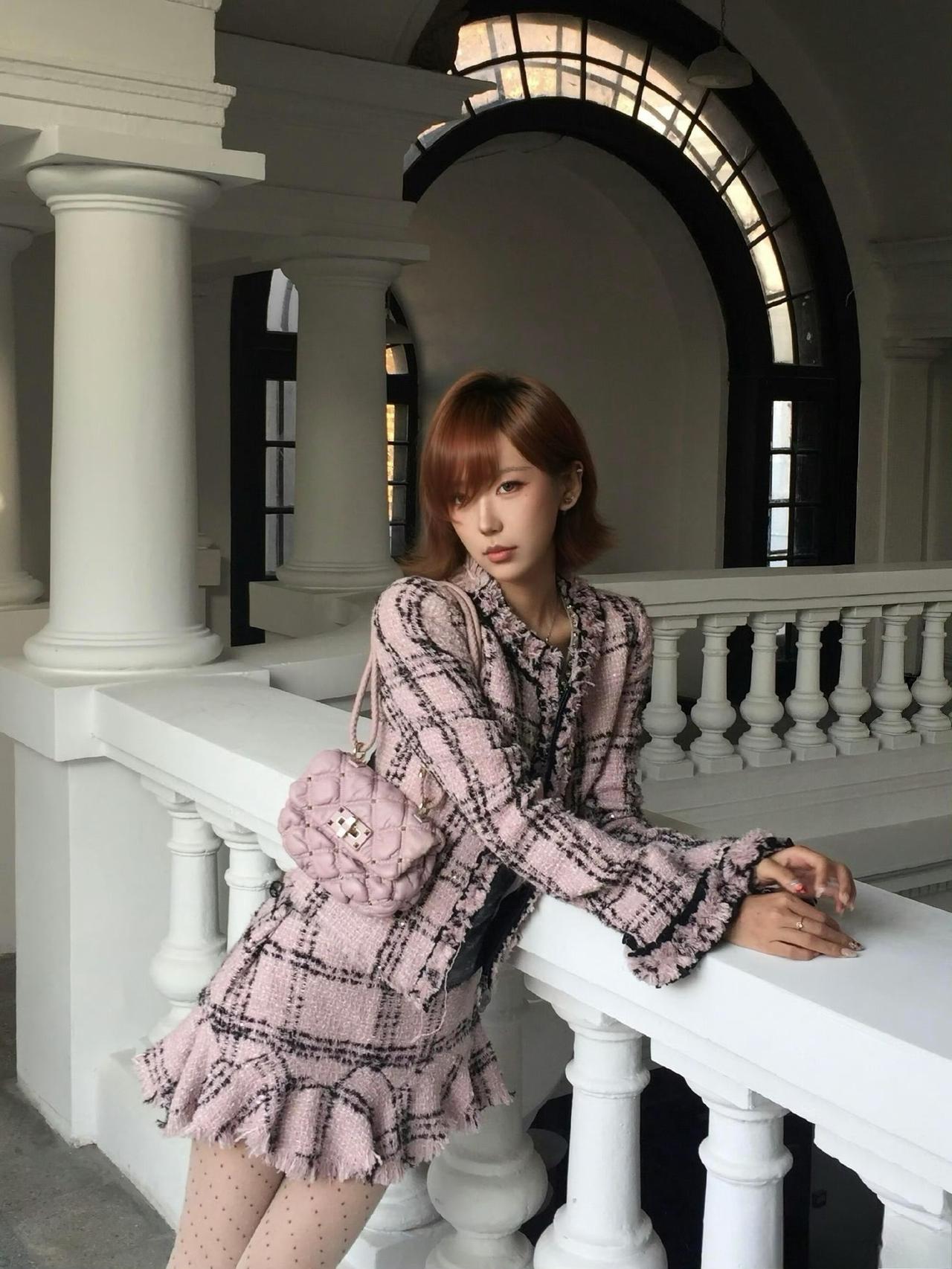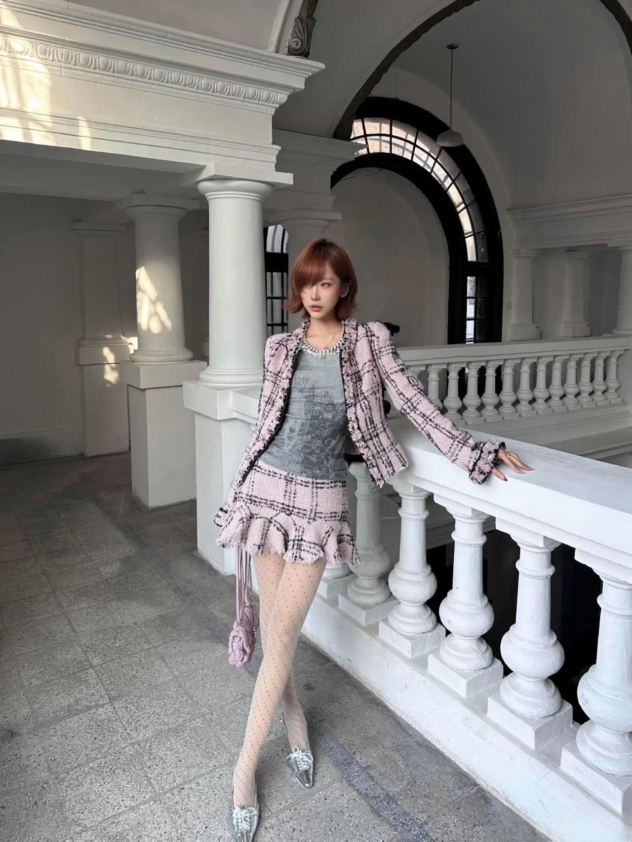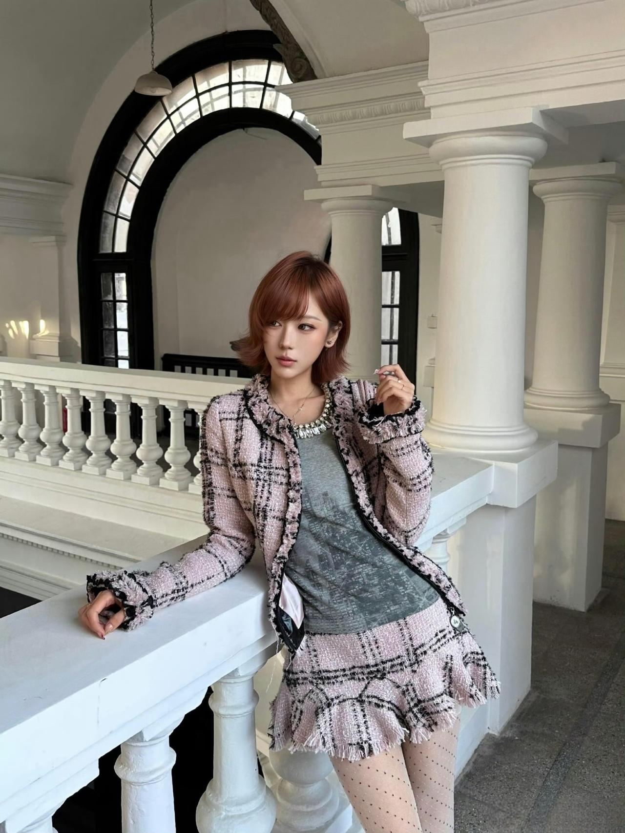 这套穿搭是甜酷复古的粉色小香风,精致又带少女俏皮感。粉黑格纹小香风套装自带复古名媛气质,外套的流苏边与短裙的荷叶边细节,注入了甜美元素,弱化了小香风的成熟感;内搭灰色做旧上衣,增添了随性酷感,平衡了套装的甜美。 搭配银色亮面高跟鞋华丽吸睛,与套装的复古感呼应,提升了造型的精致度;简约项链点缀颈部,强化了搭配的细节感。短款小香风穿搭 穿搭小香风套装