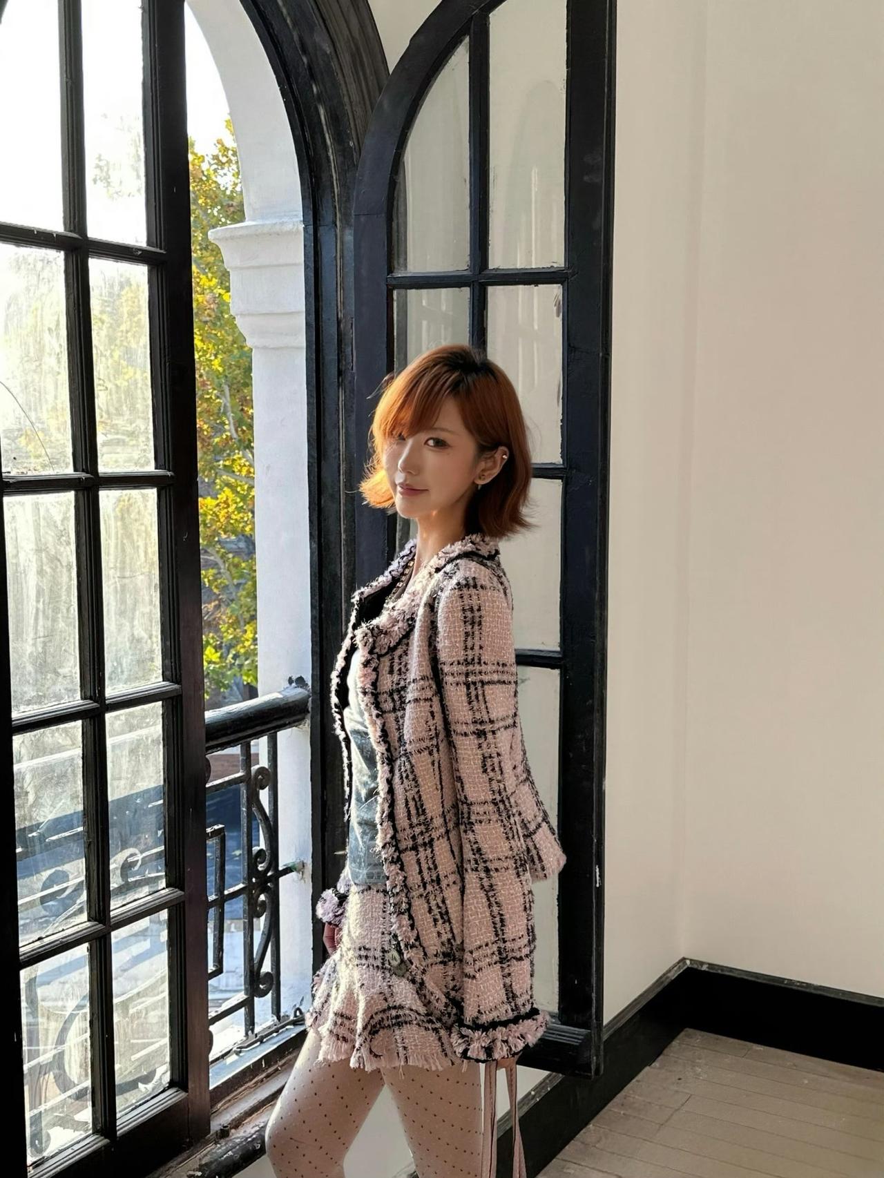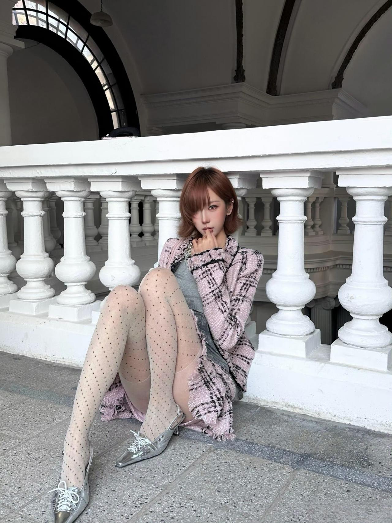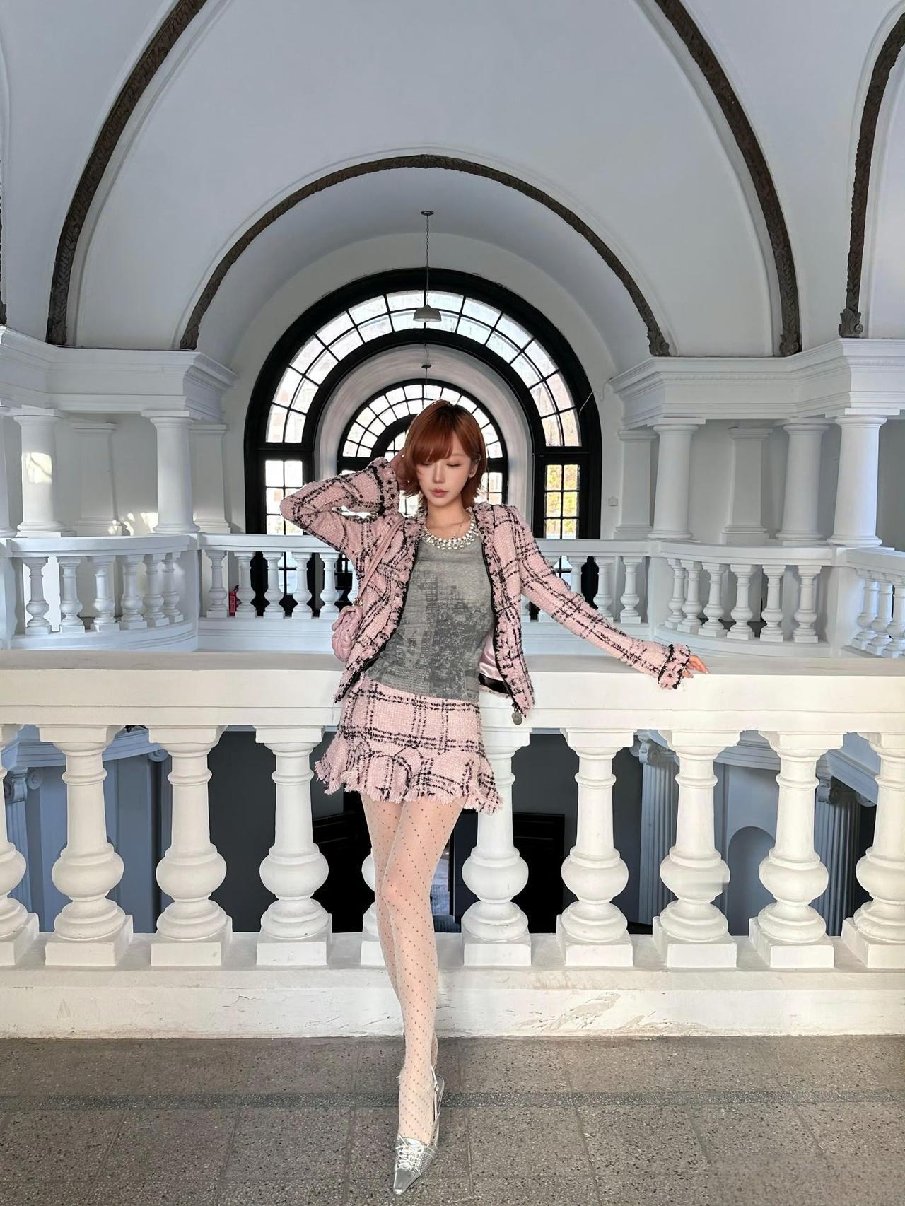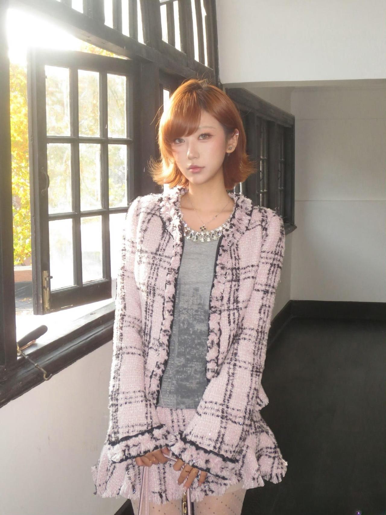 这套穿搭是甜酷复古的粉色小香风,精致又带少女俏皮感。粉黑格纹小香风套装自带复古名媛气质,外套的流苏边与短裙的荷叶边细节,注入了甜美元素,弱化了小香风的成熟感;内搭灰色做旧上衣,增添了随性酷感,平衡了套装的甜美。 搭配银色亮面高跟鞋华丽吸睛,与套装的复古感呼应,提升了造型的精致度;简约项链点缀颈部,强化了搭配的细节感。短款小香风穿搭 穿搭小香风套装