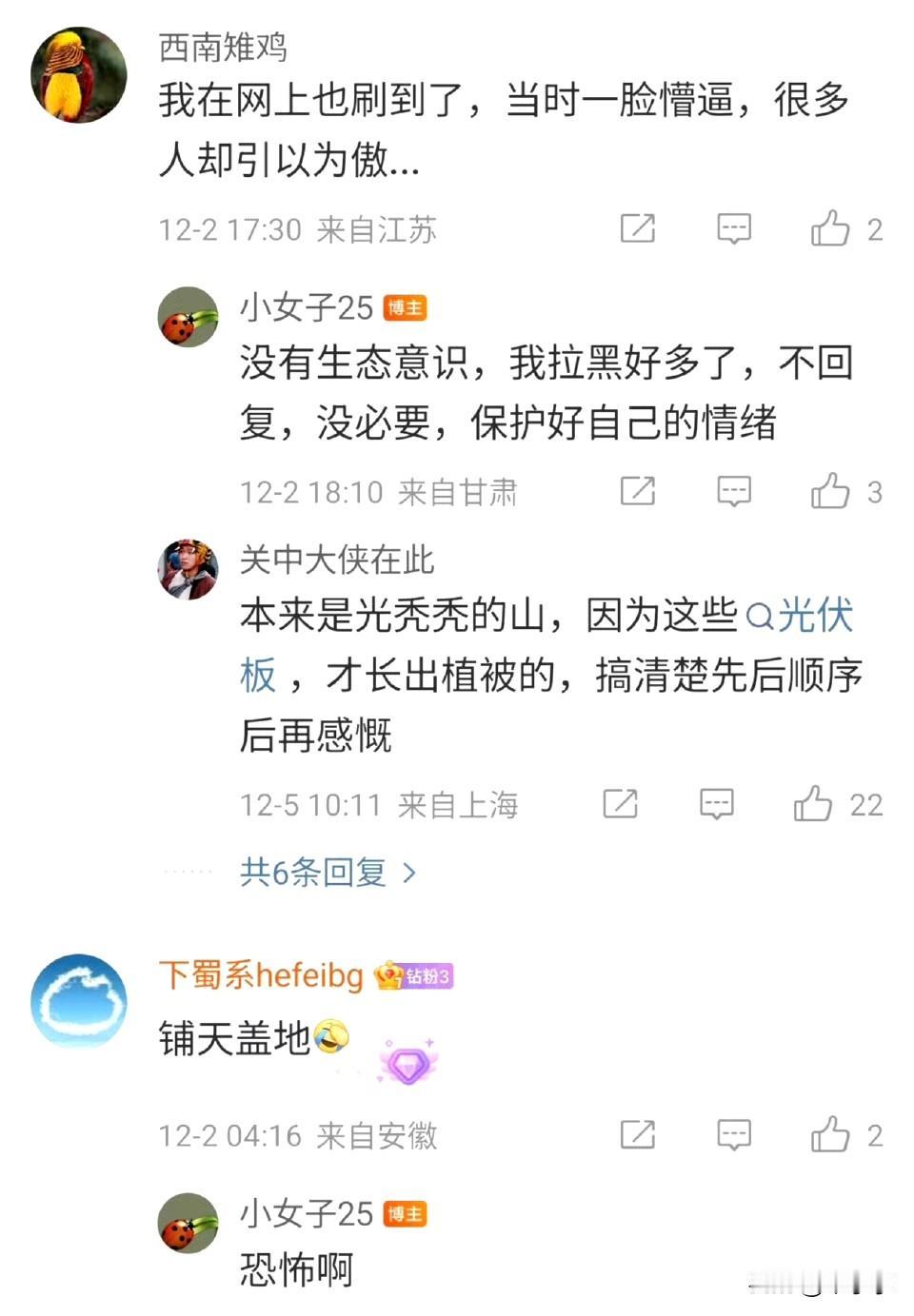 事实上贵州的山反倒是因为铺了光伏,生态才变好的[偷笑][偷笑][偷笑]还有天然气的使用有关,但总体这种植被不好的地方,光伏对当地植被有益。 那些蠢人在享受便利的同时,从不考虑这些物质条件从哪里来,到真把这些便利从它身上拿走了,它又又哭又闹发起颠来。农村光伏
