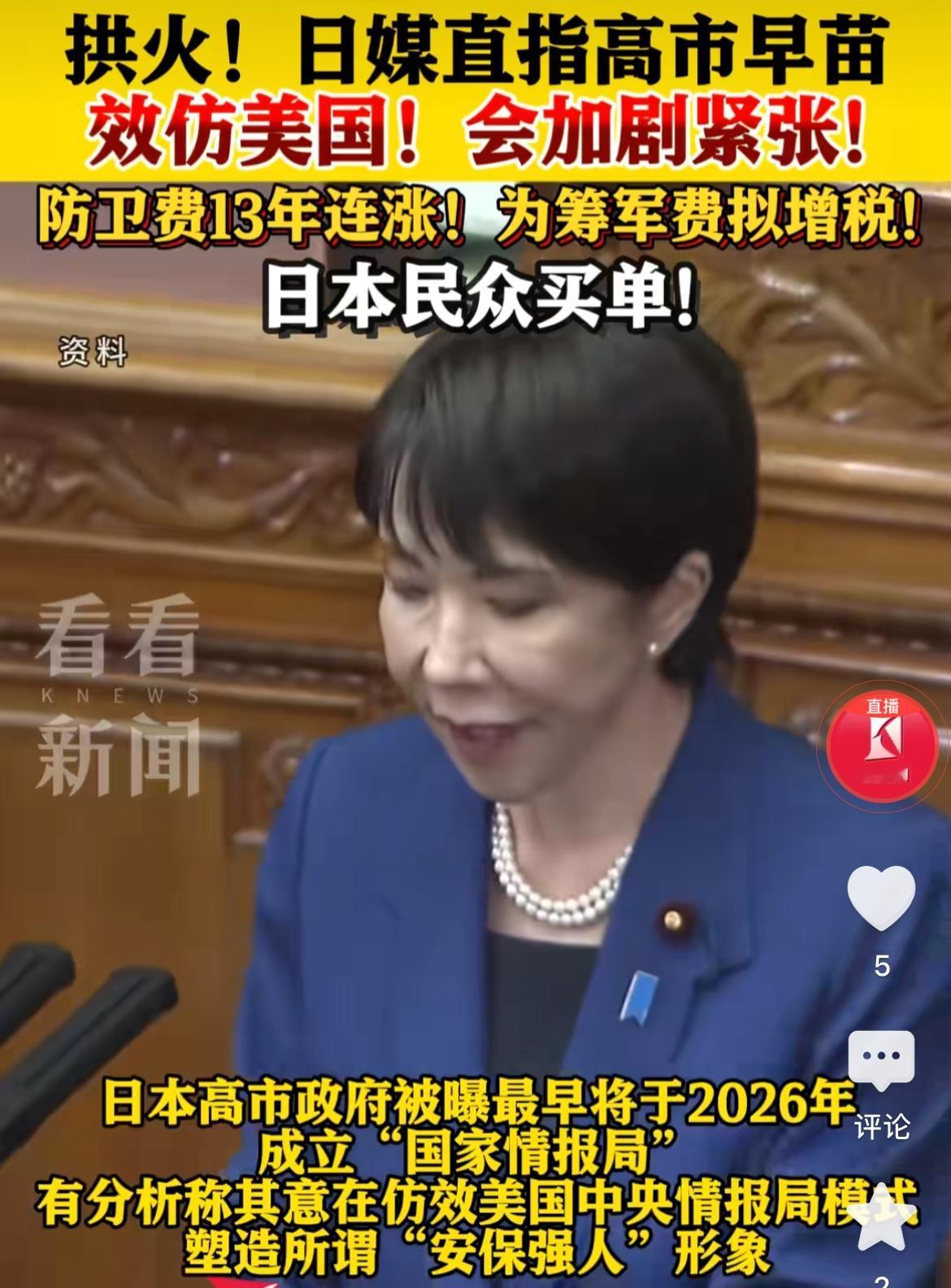 效仿美国CIA 近日,日媒爆料称,高市早苗政府计划于2026年组建国家情报局。此举措意在效仿美国中央情报局模式,旨在进一步提升日本的情报搜集与分析能力,为自卫队提供有力支援! 日本说提升情报能力给自卫队支援,其实坏心思不少。侵华战争前,据统计在日间谍有数十万之巨。这些人员为日本发动战争提供了极大帮助。这次计划组建日本CIA,明显试图突破和平宪法限制、增强军事影响力,是极其危险信号,需引起国际社会高度警惕!高市早苗内阁 日本对华情报战 高市早苗的新军国主义思想有多危险