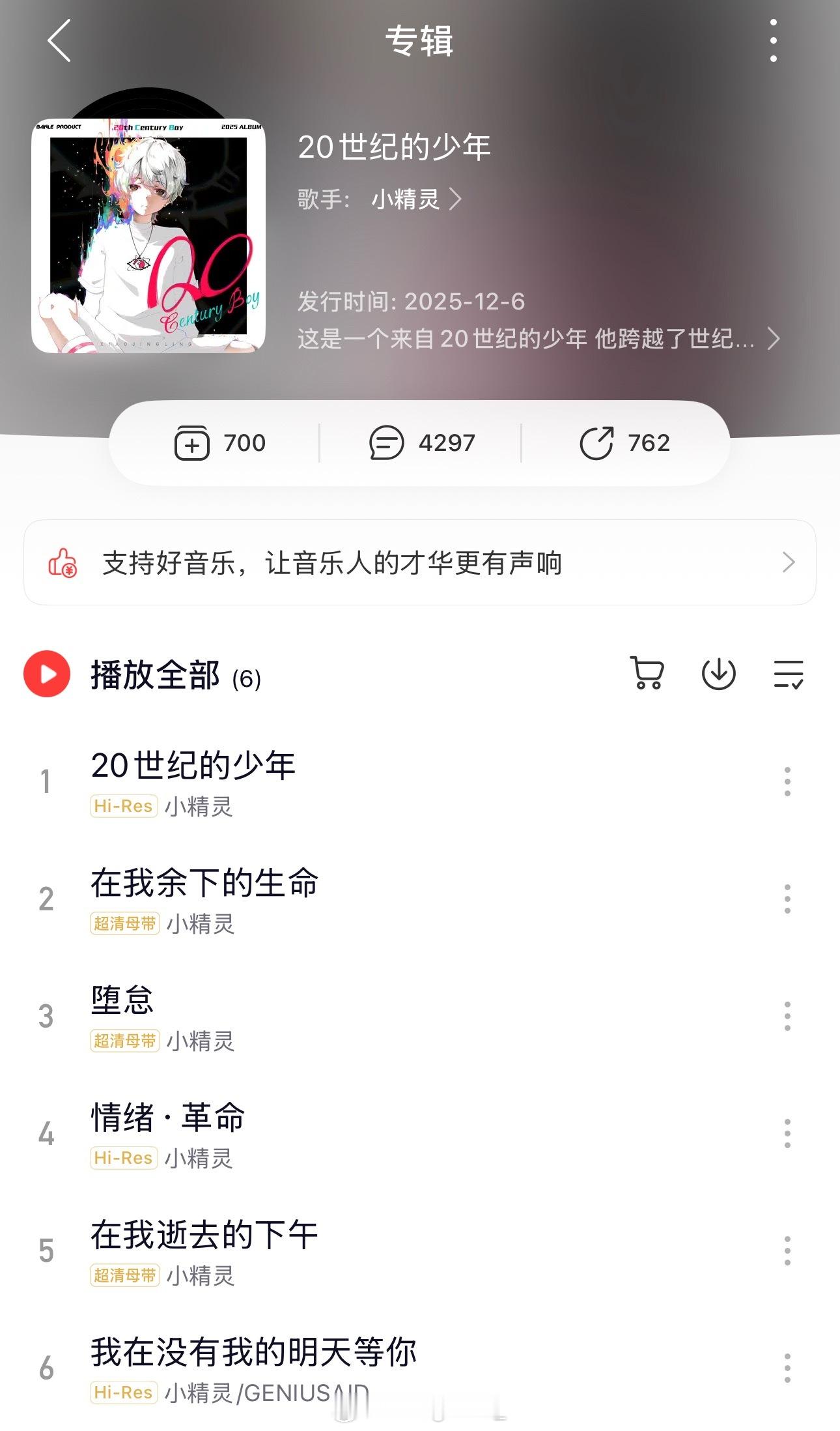 小精灵发布新专辑《20世纪的少年》,不过评论区依旧出现大量串子,评论已破4000+小精灵