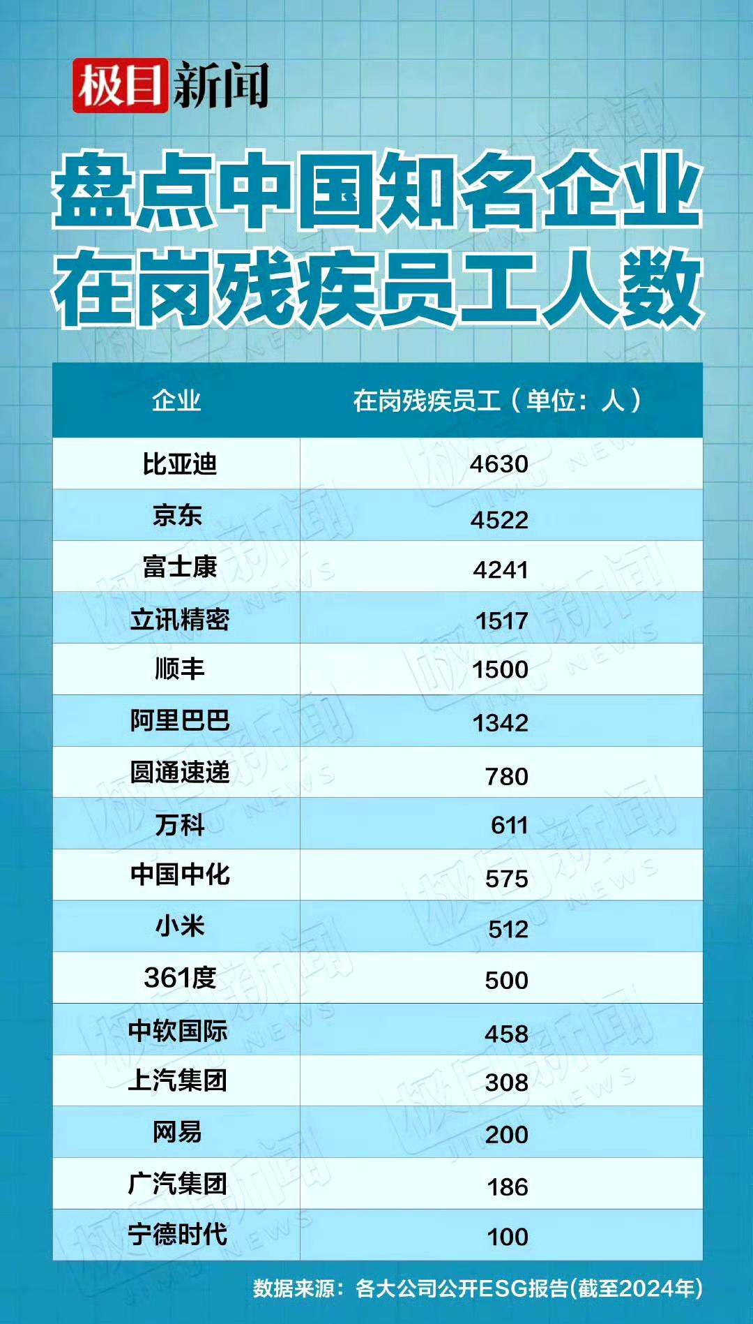盘点国内知名企业在岗残疾员工人数! 本数据由极目新闻根据各家公布的结果而发出来的,有些企业并没有公布残疾员工的人数,所以不在讨论范围。 比亚迪不愧为全国最大的汽车产销集团招收的残疾员人人数也是最多的,比亚迪的员工人数也一直是名列前茅,和很多公司喜欢用外聘不同,比亚迪更喜欢直接招聘。 第2名是全国知名的电商企业京东集团,京东集团大部分员工都是自己的员工,包括外卖小哥和快递员,这都属于京东集团自己的员工。 各位是怎么看的?欢迎评论区留言。