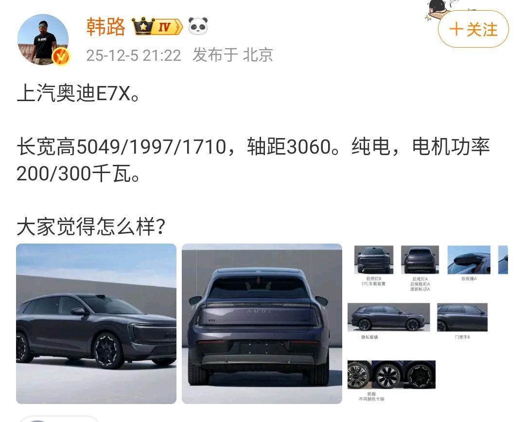 韩路:上汽奥迪E7X,大家感觉怎么样? 这个车的外观设计和上汽奥迪之前推出的车一样,不得不说,确实非常适合这个车。 现在就看售价了,如果售价非常的划算,那么购买的人群应该只多不少。上汽奥迪确实适合发展电动化车型,毕竟电动化车型现在是真的好卖。 其实也可以卖一些增程车型,增程车型在国内还是卖的比较好的,增程车型和纯电车型可以一起开发,没有什么难度。 各位是怎么看的?欢迎评论区留言。