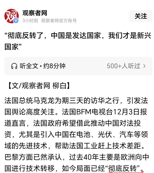 彻底反转了!法媒:中国更像发达国家! 近日,法国总统马克龙访华,法方希望引入中国在电池、光伏、汽车等领域的先进技术。法国公共投资银行行长感叹,一切都反了。如今他们才像新兴国家,而中国,已经成了发达国家的代表。 几十年前,来中国投资办厂的是法国企业,那时候法国人带着技术、标准和资本,中国在学习,也在追赶,那些年,法国的制造业站在工业化浪潮的前沿,他们的工厂在中国赚得可观,同时也帮助中国积累了工业经验。那是一个技术从西向东流动的时代,法国象征着现代化,而中国才刚刚起步。 可四十年之后,局势完全不一样了。1980年的时候,法国的GDP是6912亿美元,中国只有3065亿美元,不到法国的一半,到了2024年,中国的GDP冲上18.94万亿美元,而法国仅为3.16万亿,中国的经济体量已经是法国的近6倍。 这样的差距,让“发达国家”这个标签已经失去了原有的意义,经济实力的反转,不再只是数字的变化,更是产业结构、技术积累和影响力的全面转身。 如今的中国,不再依赖进口技术,也不再仰望西方的工业体系,从新能源汽车、电池,到光伏、风电、高铁,再到无人机、船舶和通信设备,中国的制造链几乎涵盖了所有核心环节,这种系统性优势,让法国人不得不重新审视中国。 而法国在新能源转型、高端制造这些关乎未来的行业,却明显落后,传统汽车工业的包袱、能源转型的迟缓,都让法国急于“借力中国”,这也解释了马克龙此行的真正目的——他不仅是来访问,更是来“求合作”的。 法国方面自己也不得不承认,过去几十年主要是他们在向中国转移技术,而现在的路线已经彻底倒过来了,欧洲早已没有太多通用的先进技术可以输出,反而需要中国工厂、设备和产品参与本地产业升级,从光伏电池厂的建设,到新能源汽车项目的布局,法国在等中国伸出手。 对中国企业来说,欧洲市场依旧是块肥肉,这里经济发达、消费旺盛、政策导向清晰,看起来机会很多,但机会背后,也藏着复杂的博弈。 欧洲保护主义的抬头,让中国企业“出海”变得没那么顺利,一边欢迎投资,一边又设门槛;一边喊合作,一边又担心中国技术的竞争力,这就是现实。 尤其在法国和欧盟体系下,政策审查越来越细,一旦没有准备好,很可能会陷入像安世半导体那样的不确定风险之中。 所以,中国企业走出去,不能只看眼前的市场数字,还要看欧洲政策背后的逻辑,要提前了解当地法规,评估产业环境的变化,把风险控制在可预期的范围内。 毕竟现在的国际形势下,技术输出早已不只是经济行为,更是关系到国家战略的一部分。只有做到有备而行,才能真正在海外立得住脚,把“技术出海”变成“话语权出海”。 时代的反转,总是充满戏剧性,马克龙的这次访华,不只是一次外交访问,更像是一面镜子。镜子之中,映出的是欧洲工业的焦虑,也是中国崛起的脚步声。 中国用四十年的努力走完了别人一百年的路,从被引导到被学习,这种转变背后,是完整产业体系的力量,是数亿劳动者的坚守,更是持续创新的结果,今天的中国,不再只制造产品,而是在制造标准。 世界经济的重心正在东移,中国的制造已经从“数量”向“质量”迈进。法国人惊讶于这种速度,但这种结果,其实是中国长期积累的必然。欧洲需要新的动力,而中国正是那个能提供动力的新引擎。