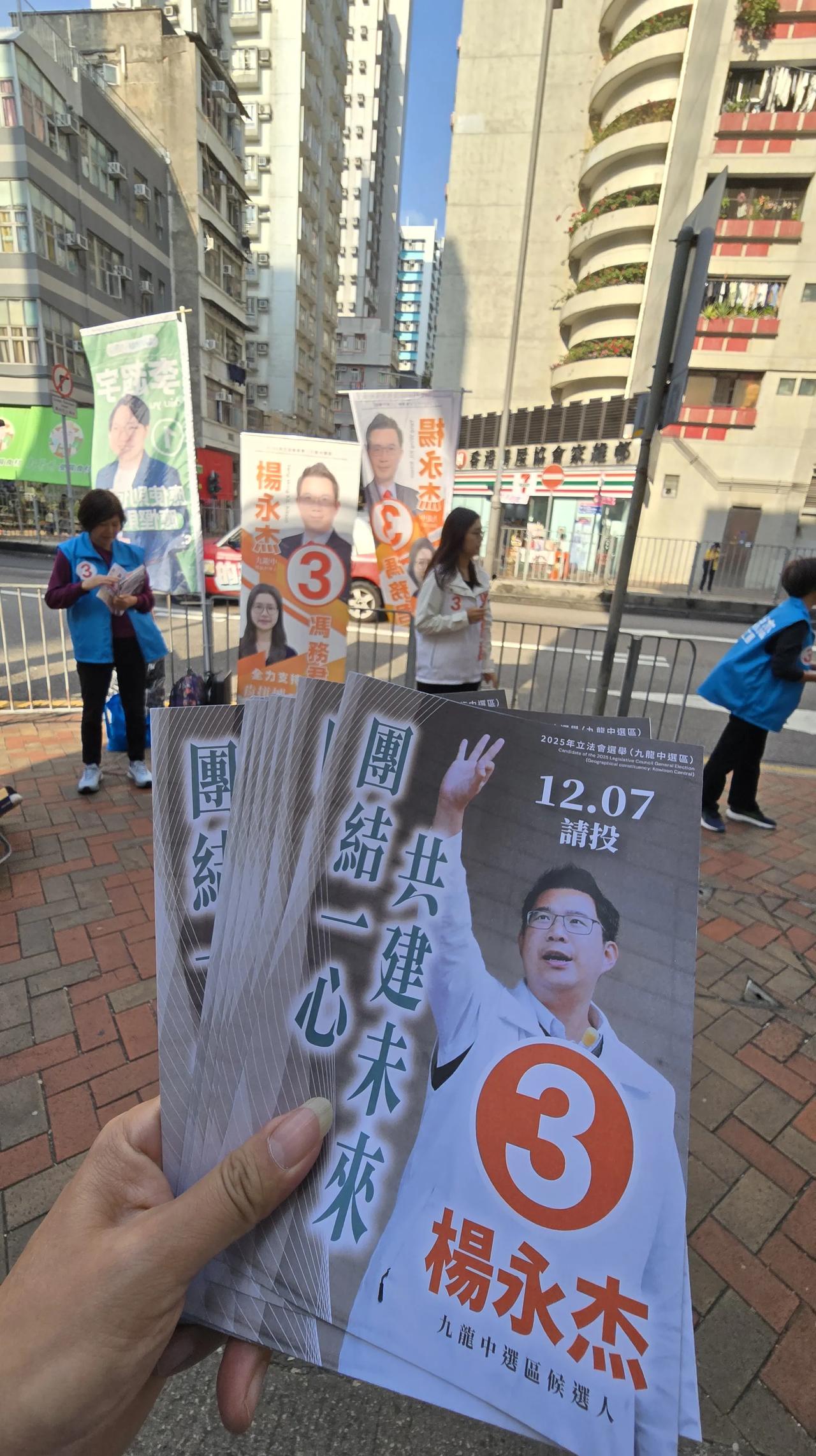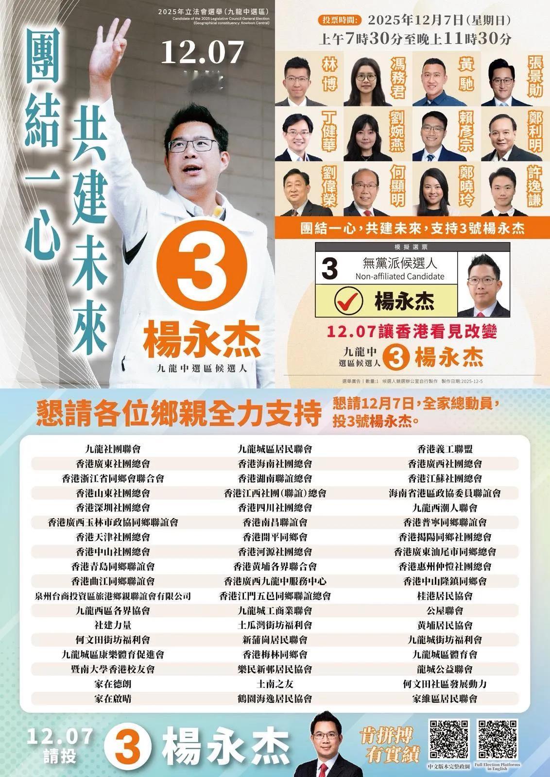 各位九龙中的朋友: 【高Sir唯一推荐 九龙中( 3 号)候选人杨永杰 | 团结一心・共建未来・暖民心】 第八届立法会换届选举将于12月7日举行,这场选举不仅是新旧交替,更是香港加速由治及兴、推动制度改革的关键一步。如期举行选举除了是对宪制秩序和法治精神的遵守和尊重,也是为了选出新一届立法会议员,与特区政府携手展开灾后重建工作,透过展开辩论、推动法例检讨和更新,推行系统性改革,让香港变得更安全,让市民生活得更安心。 多年来3号杨永杰走遍九龙中的大街小巷,透过街站宣讲、个案跟进、上门家访,倾听每一位街坊的急难愁盼。在此,也想向大家郑重介绍我心中最值得信赖的唯一推荐—— 九龙中 3 号候选人杨永杰。 我与杰哥相识多年,他是我心中「为民实干」的标杆。杰哥总是把民生事情放在心上:「街坊的事情不能等!」 杰哥的「拼搏」从不是口号,而是急市民之所急、想市民之所想的即时行动。不仅在突发事件中敢于担当,在日常地区服务裏,杰哥更是用心用情。 无论是社区设施维修、环境卫生改善,还是民生政策谘询,他总是第一时间响应街坊诉求,跑遍辖区每一个角落,把小事办实、把实事办好。过去四年杰哥在立法会重视本港医疗,优化减免机制的合资格受惠人数;改善外佣政策,优化对持牌放债行业的规管措施;通过《保护海港条例》修例后,政府将打通青洲英泥码头、翔龙湾煤气调压站和码头设施及海心公园对开的鱼尾石三个节点。关注区内十三街等大型规模的重建项目、重推启德绿色集体运输系统等等。3号杨永杰都是努力争取各项利民政策,为市民发声、为社区出力。 从颱风后的徒手移树,到数十年如一日的民生深耕;从对晚辈的倾心提携,到对街坊的赤诚相待,杰哥用点点滴滴的实绩,诠释了「肯拼搏、有实绩」的初心。在过去4年立法会议会经验中,3号杨永杰把市民的意见与诉求带入议会,聚焦解决社区长期积累的棘手议题。未来,议会更需要一位有经验、肯拼搏、有实绩的代议士,继续为市民把关、推动实事落地。 高Sir今天一早来到红磡,与冯务君区议员一起向街坊呼吁支持3 号候选人杨永杰,现在选情告急,12 月 7 日,高sir恳请大家投出您支持的一票,支持 3 号候选人杨永杰!这一票,是对一位二十多年深耕地区、默默奉献的服务者的认可,带着我们的声音,进入立法会争取权益;更是对我们团队「以民为本、实干为要」的初心的肯定。