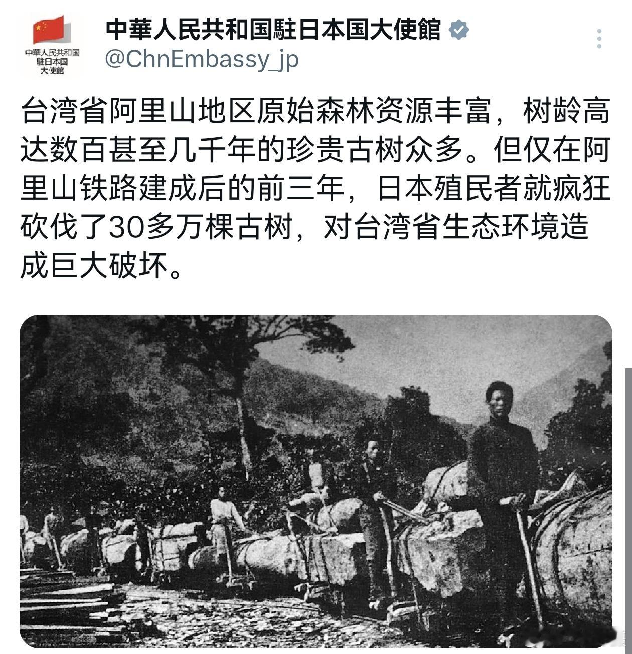 台湾省阿里山地区原始森林资源丰富,树龄高达数百甚至几千年的珍贵古树众多。但仅在阿里山铁路建成后的前三年,日本殖民者就疯狂砍伐了30多万棵古树,对台湾省生态环境造成巨大破坏。黄媒不会说的真相
