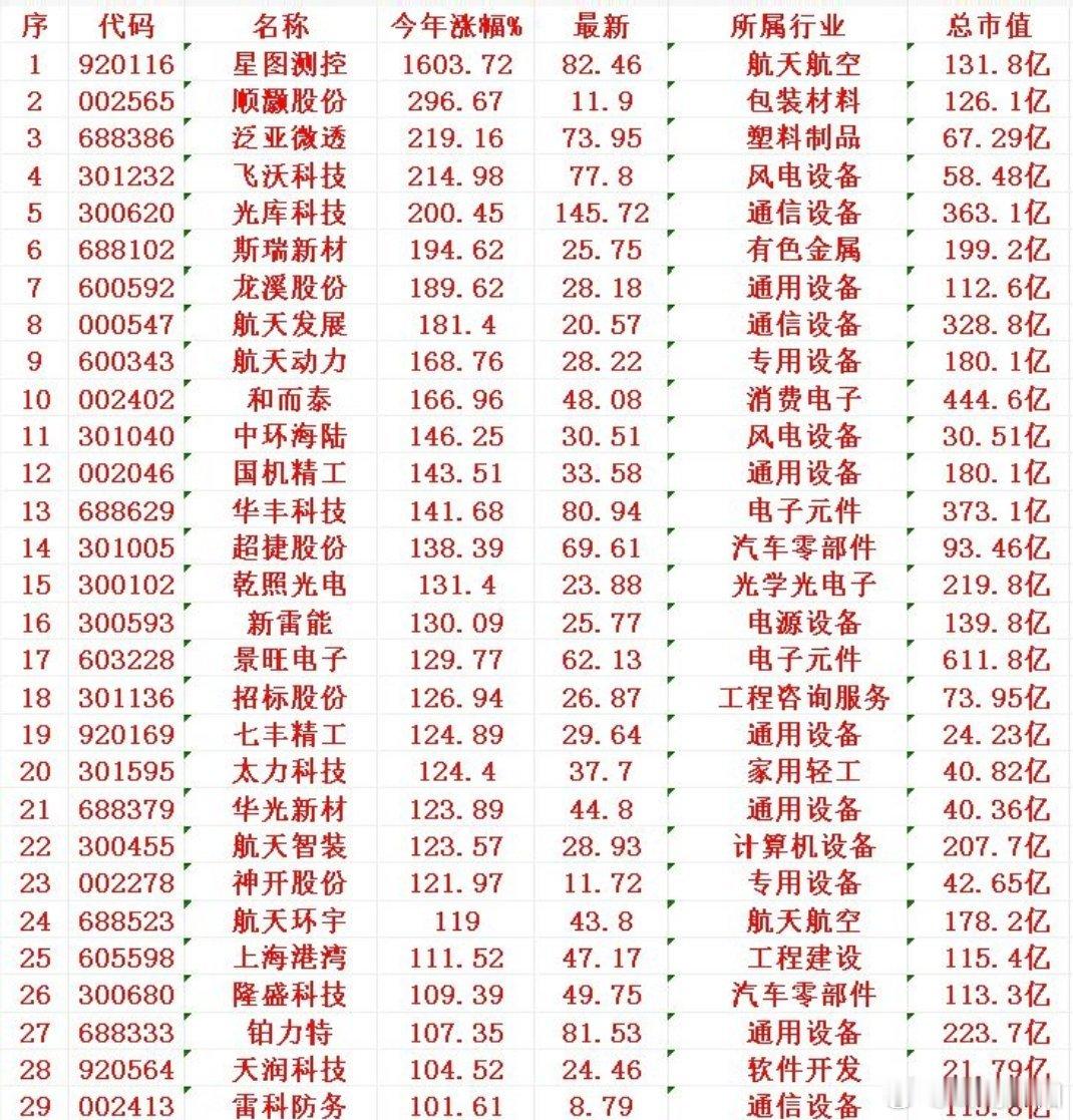 2025年商业航天概念涨幅TOP30(部分核心标的)- 星图测控:2025年以来涨幅1603.72%,总市值131.8亿元(板块涨幅冠军)- 顺灏股份:2025年以来涨幅296.67%,总市值126.1亿元- 泛亚微透:2025年以来涨幅219.16%,总市值67.29亿元- 飞沃科技:2025年以来涨幅214.98%,总市值58.48亿元- 光库科技:2025年以来涨幅200.45%,总市值363.1亿元(千亿市值梯队潜力标的)- 斯瑞新材:2025年以来涨幅194.62%,总市值199.2亿元