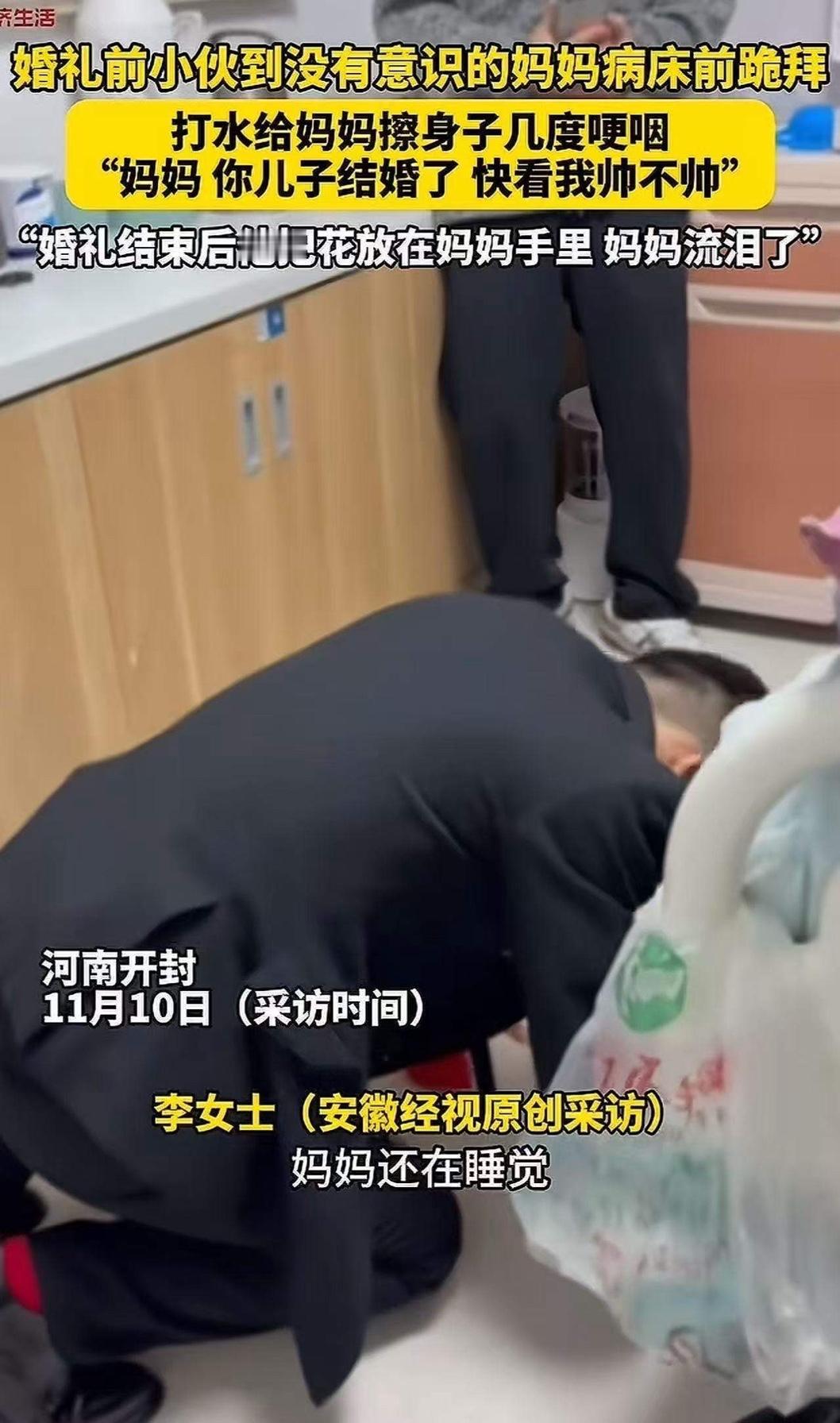河南,一个小县城的婚礼火了——不是因为排场大,也不是因为新娘美,而是因为新郎的一个“反常”举动,让无数网友红了眼眶!新郎官结婚一大早,没有急着去迎接新娘,反而先开车去了医院!对着病床上昏迷多年的妈妈,哽咽说道:“妈,我今天结婚啦,你不是一直盼着我结婚吗。你看看我,穿着西装帅不帅?” 河南小城婚礼爆红网络:新郎婚礼前先赴医院唤醒沉睡母亲 在河南某座宁静的小县城里,一场看似平凡的婚礼,却因新郎的一个温情举动,在网络上掀起了一场爱的涟漪。这日,阳光正好,微风不燥,整个县城都沉浸在喜庆的氛围中,但最引人注目的并非奢华的婚礼布置,也不是新娘的绝美容颜,而是新郎在婚礼前夕,选择先去完成一个对生命承诺的仪式。 新郎张松林一个朴实无华的青年,在人生最重要的日子里,没有急于奔向幸福的彼岸,而是驱车前往县城的医院,来到一间病房前。病床上,躺着的是他昏迷多年的母亲,一个因意外而陷入长眠,却始终是他心中最柔软牵挂的人。 推开门,张松林的脚步轻柔而坚定,他缓缓走到母亲身旁,轻轻握住那双曾经无数次抚摸自己脸颊的手,眼眶泛红,声音略带哽咽:“妈,我今天结婚啦,你不是一直盼着我结婚,想看到我成家立业吗?你看看我,穿着西装,帅不帅?”说着,他低头整理了下自己的礼服,仿佛这样就能让母亲感受到他的幸福与骄傲。 这一幕,被随行的亲友悄悄记录下来,并迅速在网络上传播开来。无数网友被这份深情所打动,纷纷留言表示:“这才是真正的孝顺,婚礼的排场再大,也不及这一刻的真心。”“新郎的举动,是对爱情与亲情最完美的诠释。” 张松林的故事,如同一股清流,在这个快节奏、高压力的社会中,提醒着我们:无论生活多么忙碌,都不应忘记那些在我们成长路上默默付出、无私奉献的亲人。他的“反常”之举,不仅是对母亲深沉爱意的表达,更是对“百善孝为先”这一传统美德的生动践行。 在这场没有奢华排场,却充满温情与感动的婚礼上,张松林用自己的行动,诠释了何为真正的幸福——那不仅仅是两个人的相濡以沫,更是对家人无尽的牵挂与回馈。一个小县城的婚礼火了 新郎"反常"婚礼前去医院 生命承诺形式