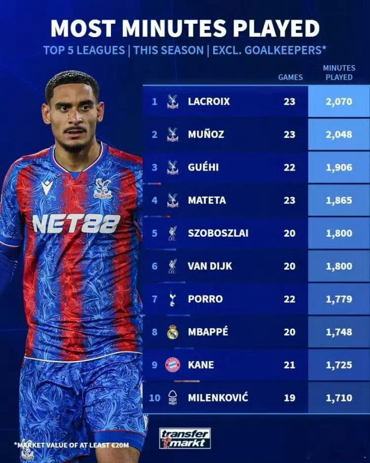德转统计,本赛季五大联赛非门将球员出场时间前十排名,索博斯洛伊、姆巴佩、凯恩、范戴克、波罗等球员在列。拉克鲁瓦(水晶宫)--2070分钟穆尼奥斯(水晶宫)-2048分钟格伊(水晶宫)--1906分钟马特塔(水晶宫)--1865分钟索博斯洛伊(利物浦)--1800分钟范戴克(利物浦)-1800分钟波罗(热刺)--1779分钟姆巴佩(皇马)--1748分钟凯恩(拜仁)--1725分钟米伦科维奇(森林)--1710分钟(所有赛事,身价至少2000万欧球员)