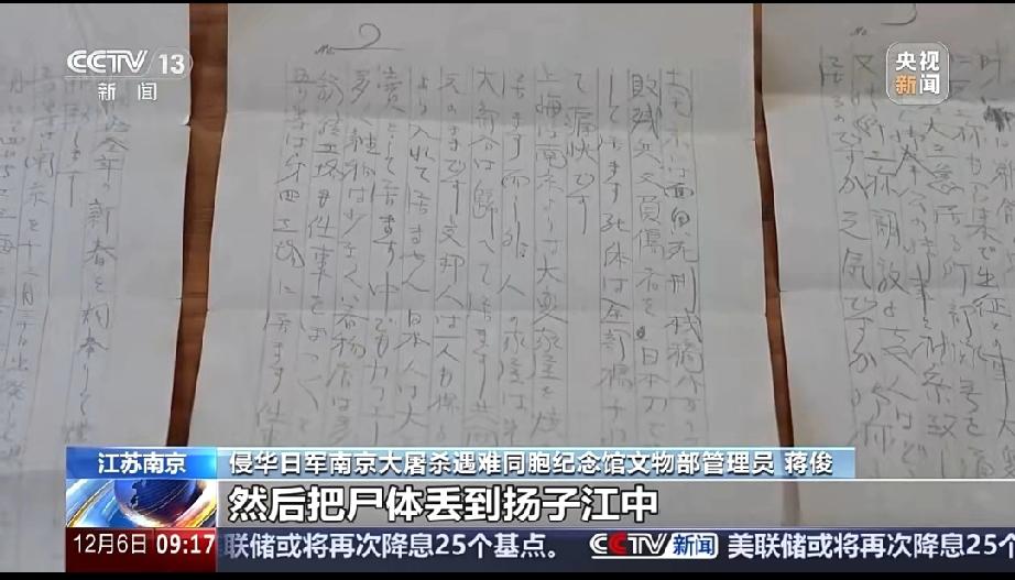 央视刚发的新闻,看得人牙根发痒! 南京大屠杀88周年,13件新史料曝光,日军士兵村田芳夫的家信字字带血:把中国人尸体堆进扬子江当桥走,南京有“死刑栈桥”,天天刀砍枪射抛尸,竟写“真痛快”! 这是侵略者自记的兽行,还有英法刊物、日军相册当旁证,铁证如山!88年过去,文物不会说谎,亡魂不会沉默。 我们铭记不是记恨,是怕历史重演!转发让更多人看见,罪证永远不能抹!