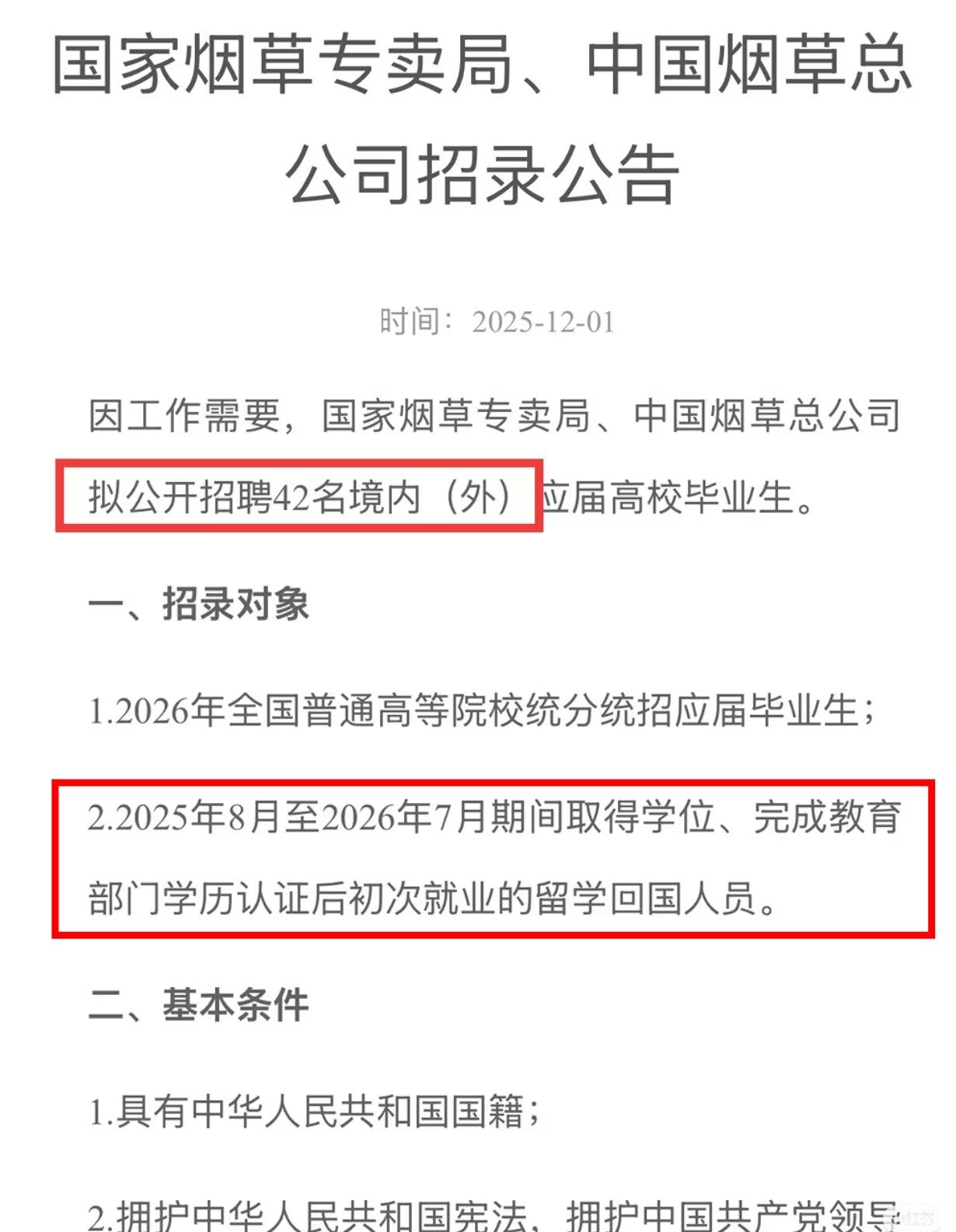 刚刷到一则信息 烟草公司招人了,你还招啥人啊 具体咱看第二条,2025年8月至2026年7月期间取得学位、完成育部门学历认证后初次就业的留学回国人员。 你直接写名整个寻人启事呗 再不就去三顾茅庐得了吧 久闻先生大名 文能提笔安天下 武能上马定乾坤 天下烟民盼先生大才久矣 你这真是把既要又要还要 既要招人 又要招到你想招的人 还要显得公开公平公正 展现的淋漓尽致啊!