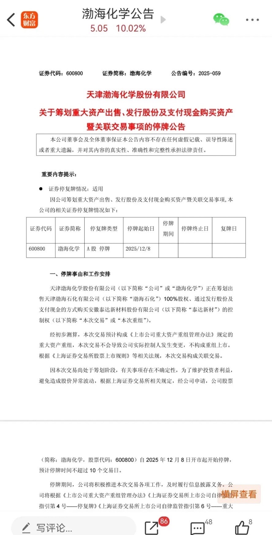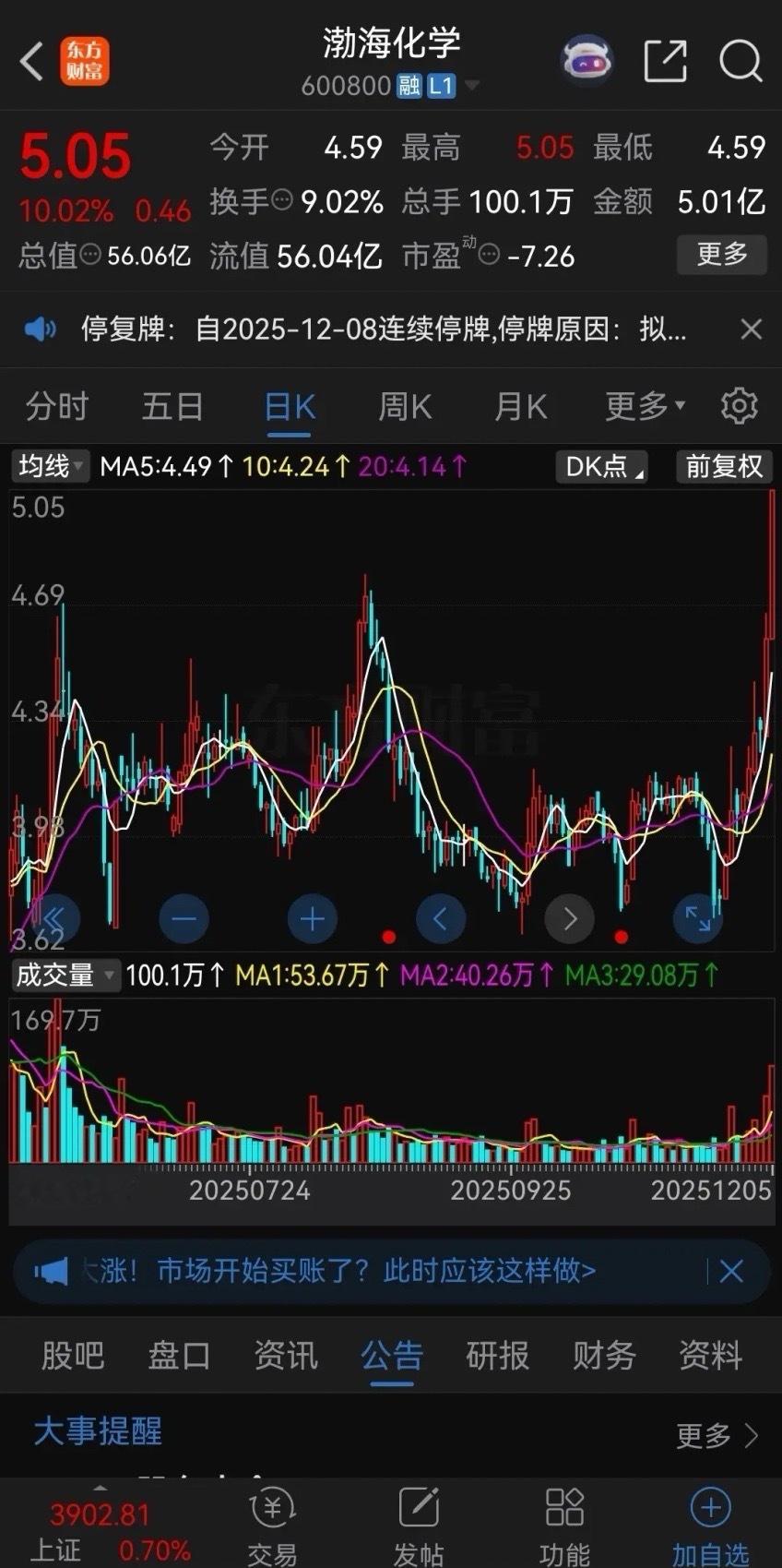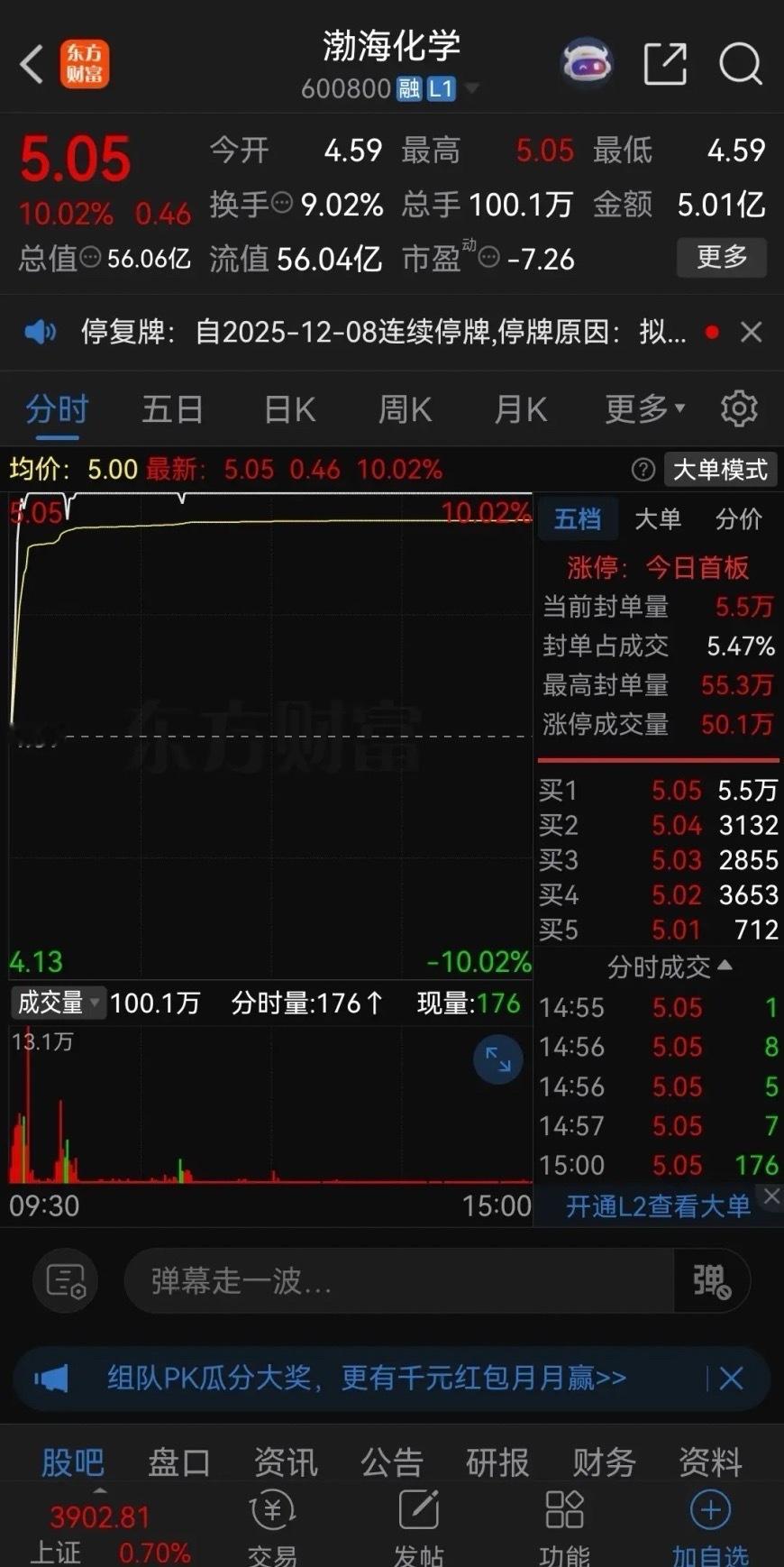 真绝!白天强势涨停,晚上发布重大资产重组!昨天渤海化学开盘直线拉升,几分钟就强势涨停封板了,直到收盘时涨停板上仍有封单5.5万手。而昨晚公司就发布重大资产重组,下周一起,开始连续停牌。从渤海化学最近两周的走势看,股价连续大涨,明显强于大盘,周四大涨6.5%,周五强势涨停封板,盘后立马公布重大资产重组。这个点,踩的非常精准,要说没有内幕,鬼都不信!