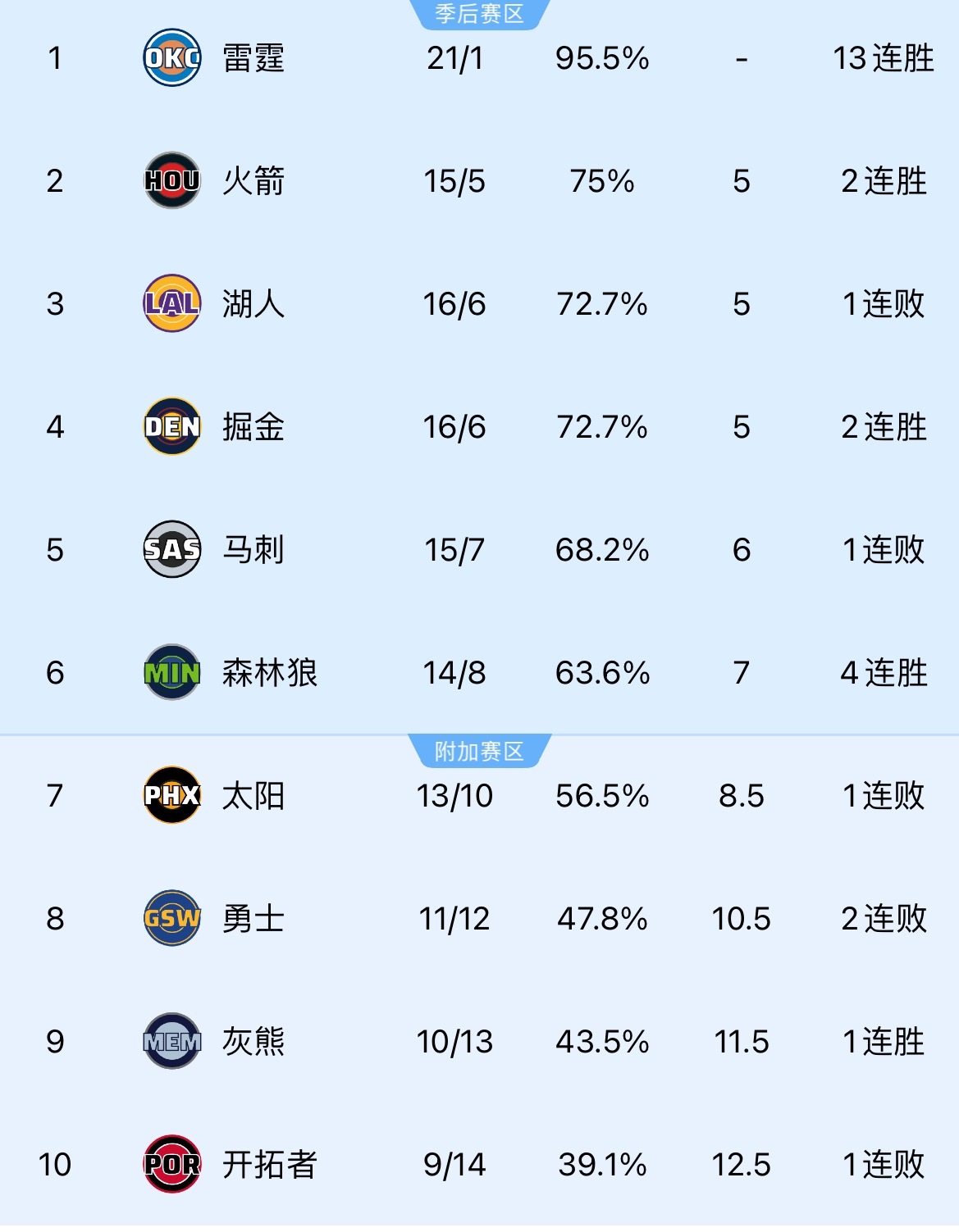 雷霆豪取14连胜、火箭升至西部第2、掘金升至西部第4、凯尔特人斩获4连胜、湖人西