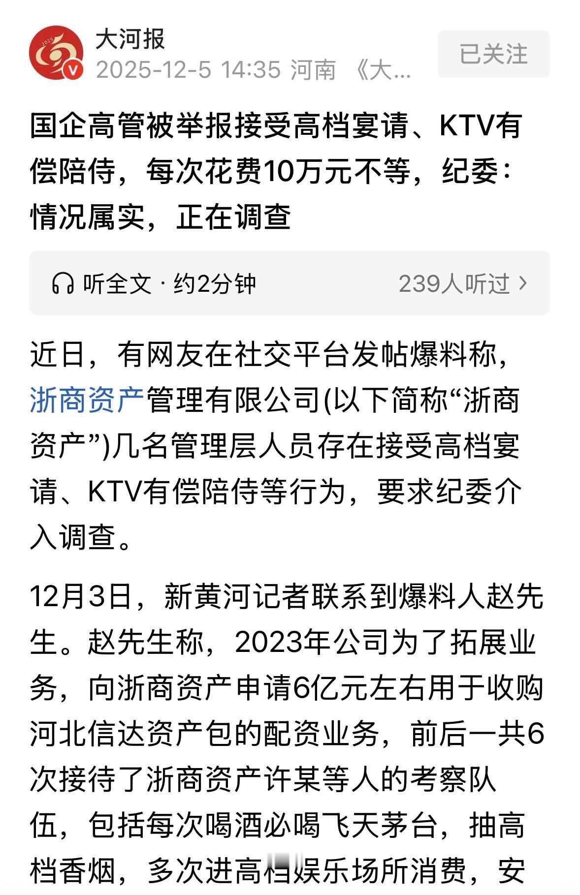 浙江,男子公司需要促成一个6亿的项目,他们前后6次接待一国企的考察队,对方上来就要住五星酒店的套房,还得吃香喝辣,茅台配高档烟是最基本的,不仅如此,几人还要玩儿好,去足浴店按完摩,再转场KTV点漂亮姑娘进行有偿陪侍,一天就消费十几万,几个月花了50多万,然而,考察队还不满足,其中一人暗示要再给他们一笔巨额好处费,男子他们拒绝了,没想到这一拒,竟让之前的努力全部功亏一篑。 2023,赵某所在公司手握一份6亿的资产收购计划,就等着另一家国企配资到位后启动了。 为了拿下这笔业务,他们前前后后接待了6次对方的考察队,其中就包括许某、胡某、张某。 这么大一个业务,大家自然是非常重视,于他们而言,整个考察队都是贵客,必须让这些人吃好喝好,诚意到位了,后面的事才好谈,这些人情世故他们都懂。 头一回见面,赵某就安排在一家五星级酒店的中餐厅,点了一桌山珍海味,茅台这种好酒自然也少不了。 饭桌上,赵某陪着笑脸轮番给几人倒酒敬酒,好一顿忙活。 等吃饱喝足,几人就开口暗示了,说小赵啊,我们这舟车劳顿的,必须得住好才行啊! 赵某一听,说住宿问题我都安排妥当了,必须让大家休息好! 接着,赵某就把几人安排进五星级酒店的套房,一晚上价格是相当昂贵。 除了吃好住好,几人还得玩好不是?在众人的一次次暗示下,赵某又带着他们来到足浴店按摩。 进了店,几人专点那些漂亮技师给他们按摩放松,赵某心里都懂,安排好他就退场,留几人在那里消遣。 接下来的5个月,考察队每月都飞河北。每次行程都一样,上午考察项目,下午住进五星套房,晚上必是茅台配高档烟,最后转场KTV。 最让赵某他们肉疼的是4月那次,仨人带了俩朋友来,这次依旧是飞天茅台和软中华的高档配置,KTV包厢里还叫了几个陪酒姑娘。 那许某左拥右抱,胡某的手搭在陪唱姑娘腿上,张某举着话筒唱歌,旁边姑娘凑过去耳语。 光这一晚的消费,就十几万了,更别说这几个月下来,那可真是花钱如流水,直接花出去50多万。 直到有次饭局上,许某喝到脸红,凑过来拍赵某肩膀,说咱这项目这么大,弟兄们跑前跑后的,总得有点辛苦费吧? 赵某知道对方是想要一大笔好处费,但他们每次的豪华接待,已经砸进去不少钱了,哪还有那闲钱? 赵某面露难色,拒绝了,许某脸色一沉,说那咱这项目只能搁置了。 这言下之意就是,不给钱,那这项目也没法再推进下去。 拒绝行贿的后果比想象中来得更快。原本说好的审批流程,硬生生拖了好久,赵某每次打电话催,许某总是有理由推脱。 眼看着项目要黄,之前做的所有努力都要功亏一篑,赵某终于下了决心举报。他翻出6次接待的发票、KTV监控视频,还有和许某的通话录音作为证据。 12月2号,纪委工作人员表示:许某、胡某、张某已经承认违规接受高档宴请和有偿陪侍,其他问题还在核实。 现在,许某、胡某、张某已经被停职,纪委还在调查他们是否涉嫌索贿。 赵某觉得,他举报不是为了报复,而是不想让这种风气继续害其他企业。做企业的,巴结不起这些大爷,但也不能让他们这么欺负人。 纪委的工作人员透露,现在调查重点除了已经查实的高消费和陪侍问题,还在核实许某是否真的索要过好处费。 如果属实,这可能涉及受贿罪,到时候就不是停职那么简单了。 如今,纪委的调查还在继续,许某等人的最终处理结果还没出来。 回顾这件事,无非就是权力滥用搞腐败。许某等人借着项目审批的权力,又是吃十万一顿的饭,又是KTV找陪侍,还敢直接要好处费,这哪是谈生意,分明是拿公权力当摇钱树啊!实在可恶。 那么,从法律角度,怎么看待这件事? 《刑法》第385条规定:国家工作人员利用职务上的便利,索取他人财物的,或者非法收受他人财物为他人谋取利益的,是受贿罪。 几人利用项目审批权实施的行为,直接关联国有资产监管职责,符合受贿罪的主要条件。 许某多次暗示需要打点费才能推进项目,构成索取他人财物。在被拒后故意拖延审批导致项目流产,形成为他人谋取利益的因果链条。 六次接待中单次消费超10万元,涉及飞天茅台、五星套房、KTV有偿陪侍等,属于“非法收受他人财物”。 根据最高检《关于办理受贿刑事案件适用法律若干问题的意见》,这类变相利益输送应计入受贿数额。 即使这件事没有达到刑事立案标准,根据《公职人员政务处分法》第35条,违规接受宴请、娱乐活动及收受礼品礼金,应视情节给予警告直至开除处分。 目前纪委已确认三人承认违规事实,后续调查若坐实索贿,将面临纪律处分以及司法追责。 对此,你怎么看? 关注@运良说法. 学法律知识不迷路