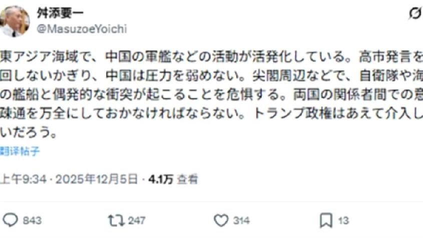 前东京都知事:高市赶紧撤回不当言论,否则失去美国支持的日本要吃大亏! 12月6日,日本共同社报道:“前东京都知事舛添要一在X平台严厉批评首相高市早苗涉台言论,敦促其尽快撤回,他指出中国在东亚海域活动频繁,日方坚持错误立场将加剧压力,且特朗普政府难以为日本武力干预,呼吁恢复中日沟通渠道避免误判,这并非其首次发声,此前他就直言中日国力消长的事实,痛斥日媒导致‘一亿总白痴化’,批评政客缺乏国际大局观,作为对中国有好感、具平衡感的资深政要,舛添的警示,或将给高市政府敲响清醒的警钟。” [机智]清醒者的怒吼难醒赌徒,日本政客倚美谋独的死局或难以改变!舛添要一的痛斥堪称日本政坛的清流惊雷,戳破了高市之流的危险迷梦,一边是中日国力消长的铁律,一边是特朗普靠不住的现实,高市却抱着台湾有事即日本有事的妄念,妄图绑上台独战车!所谓不当言论本质是挑衅中国红线的赌徒行径,日媒纵容下的“一亿总白痴化”,让政客连基本的风险认知都已丧失,美国从未将日本安危真正放在心上,一旦局势失控,日本只会沦为霸权弃子。 舛添的警示不是危言耸听,而是亡国预警——再执迷不悟,日本终将为政客的短视与狂妄,付出万劫不复的代价!