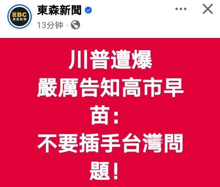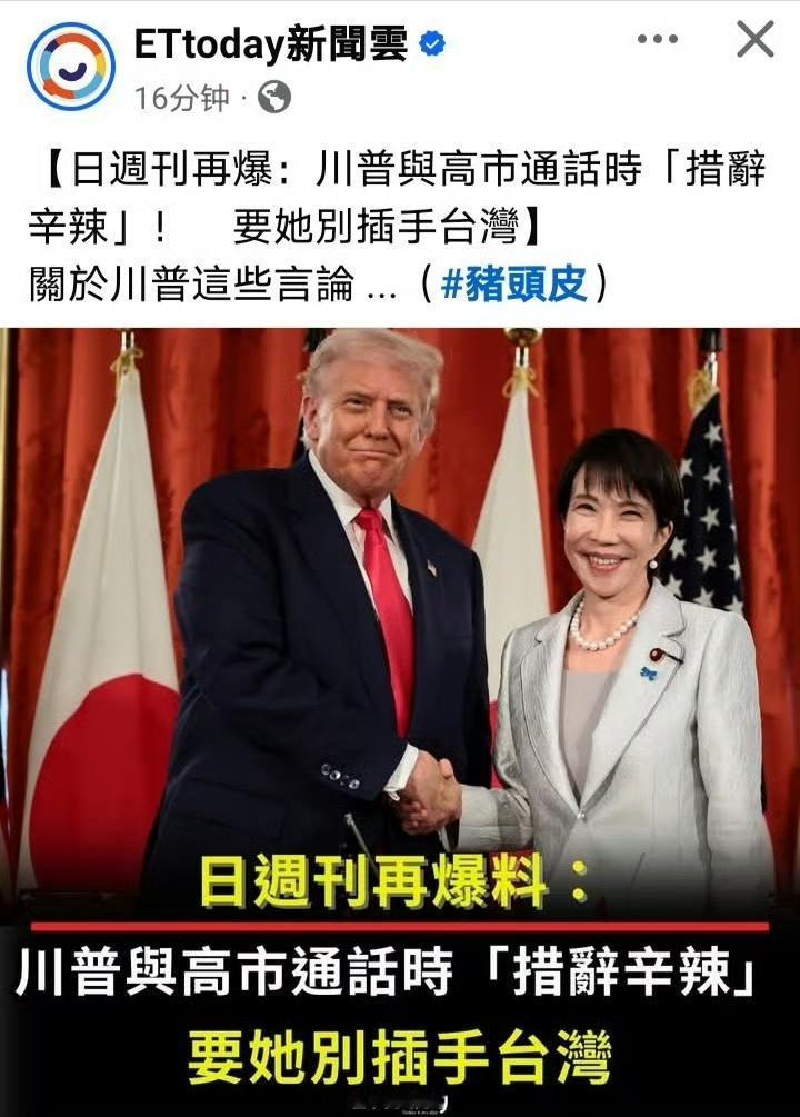 台媒:日本首相高市早苗与美国总统特朗普11月25日通话,《华尔街日报》曾独家报道称,特朗普要高市不要在台湾问题上挑衅中国,不过随即被日方驳斥。然而日本《周刊文春》杂志却在12月5日于X上爆料,“实际上,特朗普当时的措辞相当辛辣,甚至还说了“不要插手台湾问题”。