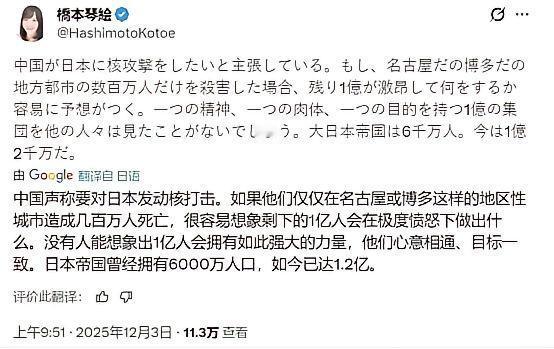 日本右翼一语惊人:若中国核弹造成日本几百万人死亡,那剩下的1亿日本人将开始反击。 不得不说,日本右翼是真的很敢说!当地时间12月3日,日本右翼核心人物桥本琴绘在社交媒体上发文,声称要是中国对日本发动核打击造成几百万人死亡,剩下的1亿多日本人就会团结起来反击。 1945年,美军在广岛和长崎投下的两颗原子弹,瞬间将两座繁华城市化为废墟,超过20万人死伤,无数家庭支离破碎。 那些幸存者,在辐射的折磨下,身体和精神遭受着双重创伤,痛苦余生,核战争一旦爆发,其影响绝不仅仅是人员伤亡,还会摧毁整个国家的基础设施,让交通、通信、能源等系统陷入瘫痪。 破坏生态系统,导致土地荒芜、水源污染,生物多样性遭受灭顶之灾,甚至可能让一个国家的文明体系倒退数十年。 桥本琴绘的言论,是对战争和人命的极度轻视,更是对历史惨痛教训的彻底遗忘。 桥本琴绘的“1亿人反击”论调,与二战时期日本军国主义的陈词滥调如出一辙。 二战前,日本军国主义在国内大肆鼓吹民族团结、军国荣耀,将侵略战争美化为“解放亚洲”的正义之举,蛊惑无数日本民众投身战争。 然而,历史的车轮不会因谎言而停滞,日本最终在战争中遭受惨败,付出了沉重的代价,国家经济崩溃,社会满目疮痍。 如今,桥本琴绘之流试图复活军国主义旧梦,这不仅是对历史的曲解,更是对现实的逃避。 他们企图通过极端言论制造“精神胜利法”,掩盖日本在外交、军事和社会层面逐渐边缘化的现实。 从军事角度看,尽管近年来日本在美国的支持下不断扩军,但其作战半径和投送能力依旧有限,难以支撑跨国远程打击。 而中国在区域防空、反导系统、远程打击能力等方面取得了长足进步,技术早已今非昔比。 一旦冲突爆发,日本根本不具备“反攻”的能力,所谓的“反击”不过是自欺欺人的幻想。 日本面临着严重的人口老龄化问题,年轻人数量锐减,社会对战争的接受度极低,权威民调显示,仅有9%的日本人愿意为国家而战,这一比例在全球处于最低水平。 所谓的“1亿愤怒国民”,在现实中可能更多是“1亿普通人”,他们更关心的是养老金、房价、医疗保障和生活质量等实际问题,而非拿着武器去打仗。 从外交方面看,日本虽然在亚太地区依旧保持一定影响力,但其对中国的战略主动权几乎为零。 一旦军事冲突爆发,中国不仅拥有压倒性的常规军力优势,还拥有更广泛的国际政治支持,亚洲多个曾被日本侵略的国家,对其军国主义回潮极为敏感。 一旦日本越界,可能面对的不只是中国的反制,而是一场多国联手的全面围堵。 桥本琴绘的“核战狂想”,暴露了日本右翼的极端思维与战略困境,这种言论不仅无法掩盖日本当下的现实问题,反而会加剧地区紧张局势,让日本在国际上愈发孤立。 真正的国家强大,不是靠喊口号或制造幻想,而是靠实打实的能力与对历史的尊重。 日本右翼若执意在错误的道路上狂奔,不仅难以破解当前的困局,更可能成为地区和平的破坏者。 对于国际社会而言,应高度警惕日本右翼的极端言论与行为,推动日本正视历史、尊重现实,坚定不移地走和平发展之路。 同时,各国应加强沟通与合作,共同维护地区和平与稳定,避免历史悲剧重演。 毕竟,和平与发展才是时代的主流,任何试图破坏这一趋势的行为,都将遭到历史的无情审判。