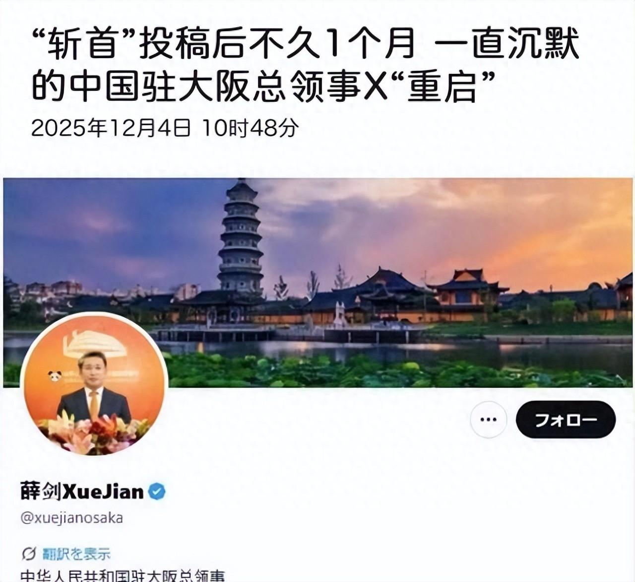 沉默1个月后,中国驻大阪总领事再度发文,没威胁高市。薛剑作为中国驻大阪总领事,却遭到了日本民众的围攻,这已经不是一件单纯的政治外交事件,而是日本右翼有意对中国的围攻。此前薛剑的“斩首”发言让其遭到了日本的围攻,薛剑并未指名道姓,只是说了想说的话,但是有些人却对号入座十分生气,日本右翼借此炒作,直接把薛剑列入了不受欢迎名单。   谁能想到,一条社交平台的帖文能搅动中日关系的波澜,更让国际社会看清了某些势力借题发挥的真实面目。   薛剑那句被日本右翼爆炒的 “擅自闯入的肮脏头颅应毫不犹豫斩掉”,乍听之下言辞尖锐,可放在日本首相高市早苗公然宣称 “台湾有事,日本可以使用武力” 的背景下,更像是对突破外交底线行为的严正警示。   更何况,薛剑随后提及的 “敌国条款” 并非空穴来风,而是《联合国宪章》中至今未被废除的明确条文,赋予二战战胜国在特定条件下的合法权利,他不过是用历史法理提醒日方正视现实,却被硬生生扣上了 “威胁” 的帽子。   这场风波的起点,本是高市早苗对中日关系政治基础的公然挑衅。中日四个政治文件早已白纸黑字明确,台湾是中国领土不可分割的一部分,日本政府多次作出郑重承诺,这具有国际法效力,不存在任何模糊空间。   可高市早苗却在国会答辩中将台湾问题与日本集体自卫权挂钩,这被人民日报 “钟声” 文章点出是三个 “首次”。   战后日本领导人首次在正式场合将台湾有事与集体自卫权绑定、首次明说想武装插手台湾事务、首次直接对中国发出武力威胁。   这种突破底线的言论,本质上是对中国内政的粗暴干涉,也是对战后国际秩序的公然挑战,薛剑作为中国外交官,站出来维护国家主权,本是职责所在,何错之有?   日本右翼对薛剑的围攻,更像是一场精心策划的舆论闹剧。从自民党外交小组递交决议书要求赶走薛剑,到大阪府议会全票通过决议逼其道歉,再到部分议员提议将其列为 “不受欢迎人物”,一系列操作层层加码,试图将一场外交争端个人化、情绪化。   更离谱的是,网上还出现了针对薛剑的死亡威胁,迫使中国驻日使馆发布安全提示,让外交人员加强防护。   可这背后,是右翼势力想通过炒作对华矛盾,转移国内的经济压力和政治分歧,同时推动军事扩张的议程。   他们选择性遗忘了日本历届政府的承诺,却对薛剑基于历史法理的提醒大动肝火,这种双重标准,暴露了其不愿正视历史、不愿尊重他国主权的真实面目。   中方的回应始终保持着理性与克制,却也坚守着原则底线,中国外交部多次召见日本驻华大使严正交涉,发言人林剑明确指出薛剑的言论针对的是日本政客的错误言论和军国主义思潮,并非个人攻击。   国防部发言人也毫不含糊地表示,中国军队有能力捍卫国家主权,若日方武力插手台海,就是侵略行为,中方必将反击。   薛剑在沉默一个月后再度发文,没有延续之前的尖锐措辞,而是转发吴江浩的相关内容,强调日本历届政府承认一个中国原则的事实,分享中日科技合作、新能源项目的利好消息。   国际社会的反应也颇能说明问题。日本外相茂木敏充兴冲冲地跑到 G7 外长会上 “告状”,想拉西方盟友给中国施压,结果却遭遇了 “社交死亡”,没有任何一个国家公开发声支持,甚至连象征性的 “理解” 都没有。   这足以说明,台湾问题是中国内政,任何企图干涉的行为都不得人心,国际社会普遍尊重一个中国原则,也不愿被日本右翼拖入不必要的纷争。   而日本国内,野田佳彦、小泽一郎等老牌政客也公开反对驱逐薛剑,认为高市早苗的言论本身就不负责任,普通民众更是走上街头反对军国主义抬头,这些都说明右翼势力的炒作并没有得到广泛认同。   中日关系能走到今天,靠的是双方对历史的正视和对原则的恪守,四个政治文件是两国关系的压舱石,任何试图动摇这块基石的行为,都只会让双边关系陷入危险境地。   薛剑的遭遇,不过是这种危险倾向的一个缩影,他用历史法理作为武器,戳破了右翼势力的虚伪面具,也让更多人看清了谁在真正维护地区和平,谁在肆意制造紧张。   外交博弈从来不是靠嗓门大小定胜负,而是靠历史正义和法理依据。   薛剑的发言或许尖锐,但句句站在维护国家主权和战后秩序的立场上;中方的回应或许克制,但始终坚守着不可逾越的原则底线。   日本右翼的炒作虽然喧嚣一时,却改变不了台湾是中国领土的事实,也动摇不了国际社会对一个中国原则的认同。   尊重历史承诺、恪守国际法准则,才是国与国相处的正道,任何试图越线玩火、炒作对立的行为,最终只会引火烧身,这是历史早已证明的真理。
