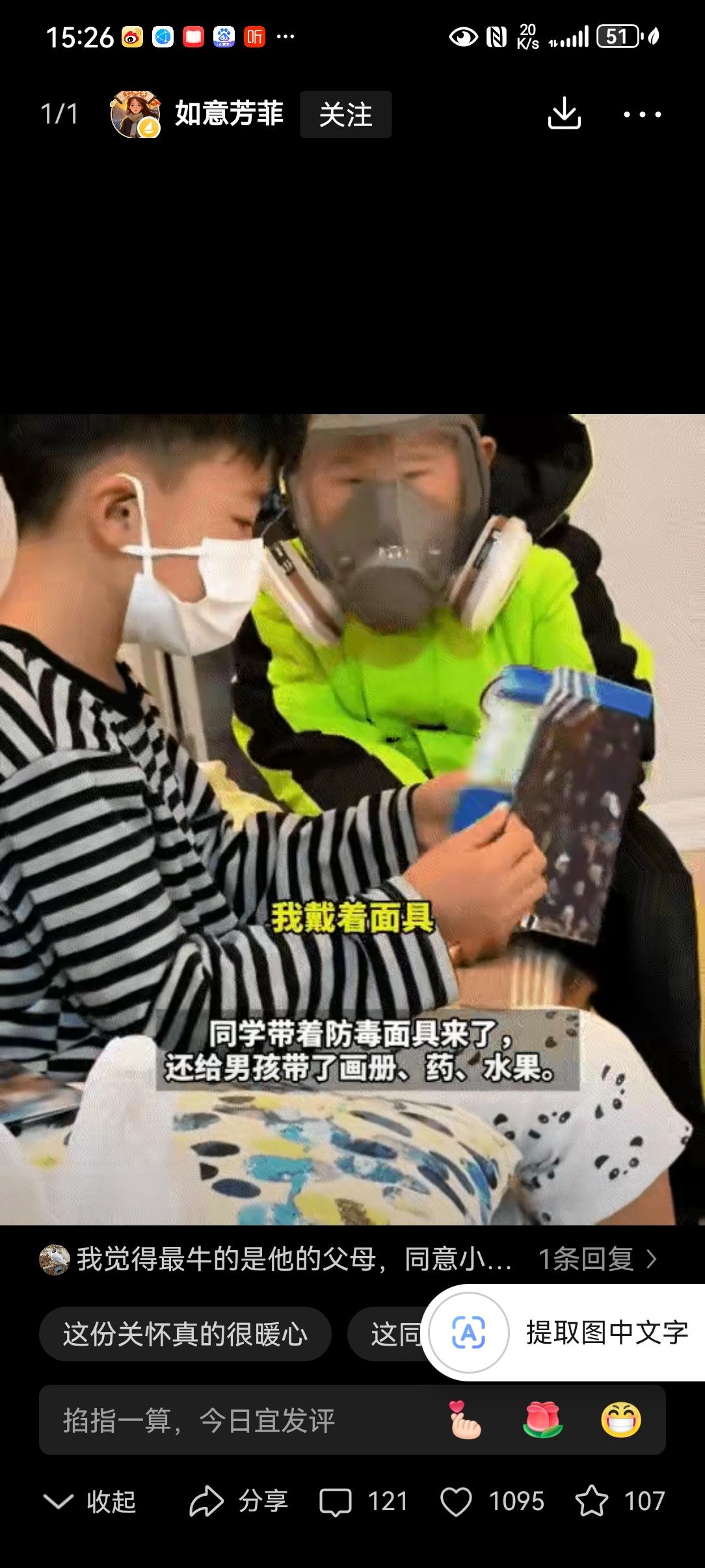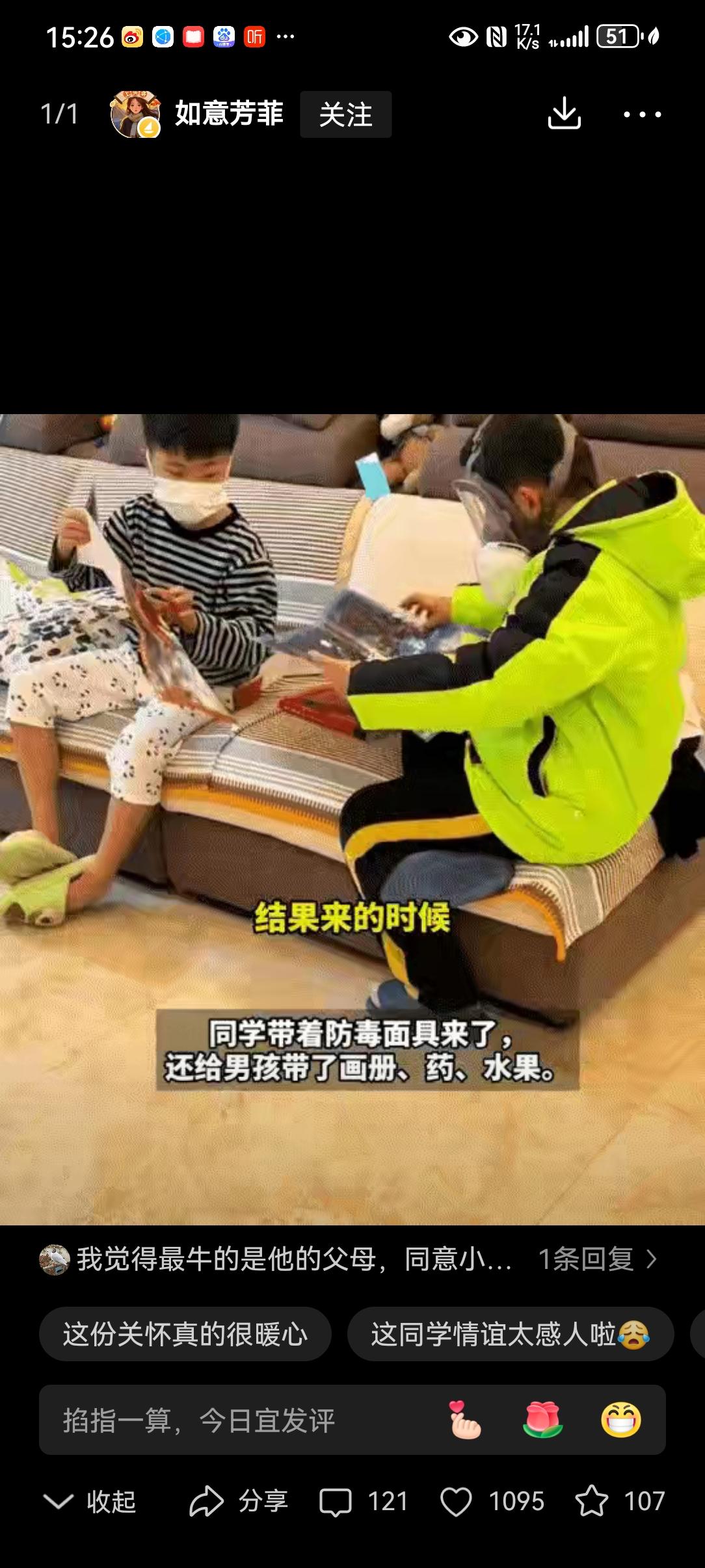 万万没想到!山东,一小男孩因为流感发烧没去上学,在家休养时,打电话和同学说自己烧的难受,有点想他了,结果同学听完,直接戴着防毒面罩到男孩家探望。 小男孩流感发烧在家歇着,闲得难受,给同班好友打了个电话,随口说自己烧得浑身无力,还挺想他。 没曾想,电话那头的小伙伴急了,当即就说要上门来看他。男孩妈妈怕传染,赶紧在电话里劝,让他别来。 可那孩子偏不依,语气认真得很:“阿姨,我有办法,戴上个面具就不会被传染了。” 等男孩妈妈开门接人时,当场就笑了——那孩子真戴着个防毒面具,从头到脚捂得严严实实,手里还拎着退烧药、一袋水果,还有一本男孩最爱的课外书。 小男孩一见好友,原本蔫蔫的模样瞬间精神了,笑着说自己病都好了一半,拉着他就往沙发上坐,叽叽喳喳聊个不停。 男孩妈妈说,俩孩子平时总一起打球、一起看书,感情好得像亲兄弟。看着眼前这“全副武装”的小身影,心里又好笑,又暖得发慌。 网友看了都忍不住调侃:这才是“过命的交情”,防护拉满,心意更满。 也有人说,成年人的友情总掺着顾虑,可孩子的世界很简单,一句“我想你”,就值得全力以赴奔赴。 难得的是,好友家长也默许了这份善意,既护着孩子,又没浇灭这份真诚。 这份不掺杂质的关心,不刻意、不敷衍,比任何安慰都治愈,也让我们看清:最动人的友情,从来都藏在主动奔赴里。