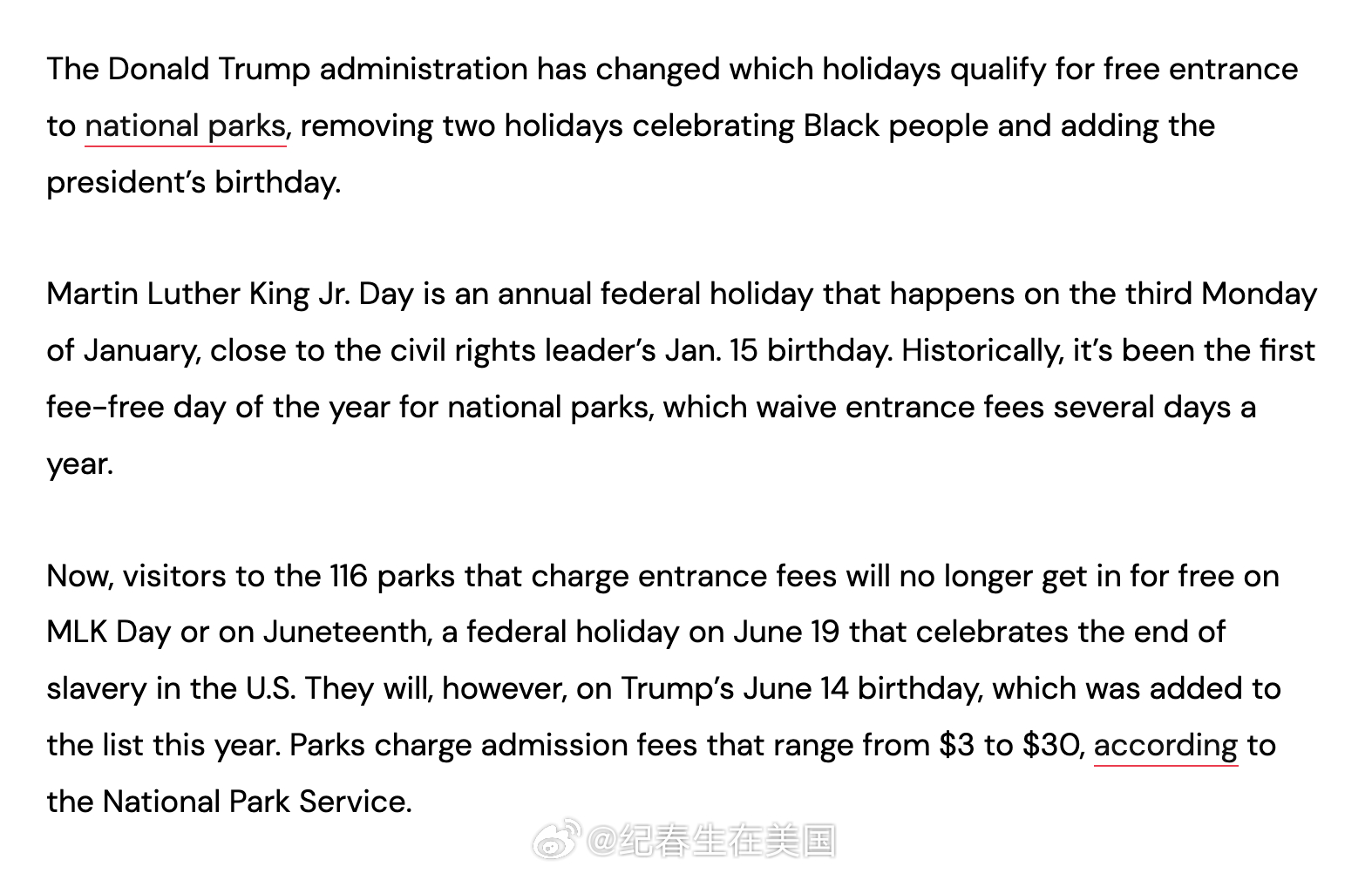 川普政府把两个联邦假日:马丁·路德·金纪念日和六月节从国家公园的免费入园日名单中移除,换成把他的生日/国旗日设为免费入园日。(在美国国家公园管理局的网站上特别注明了6月14日既是国旗日也是川普生日)