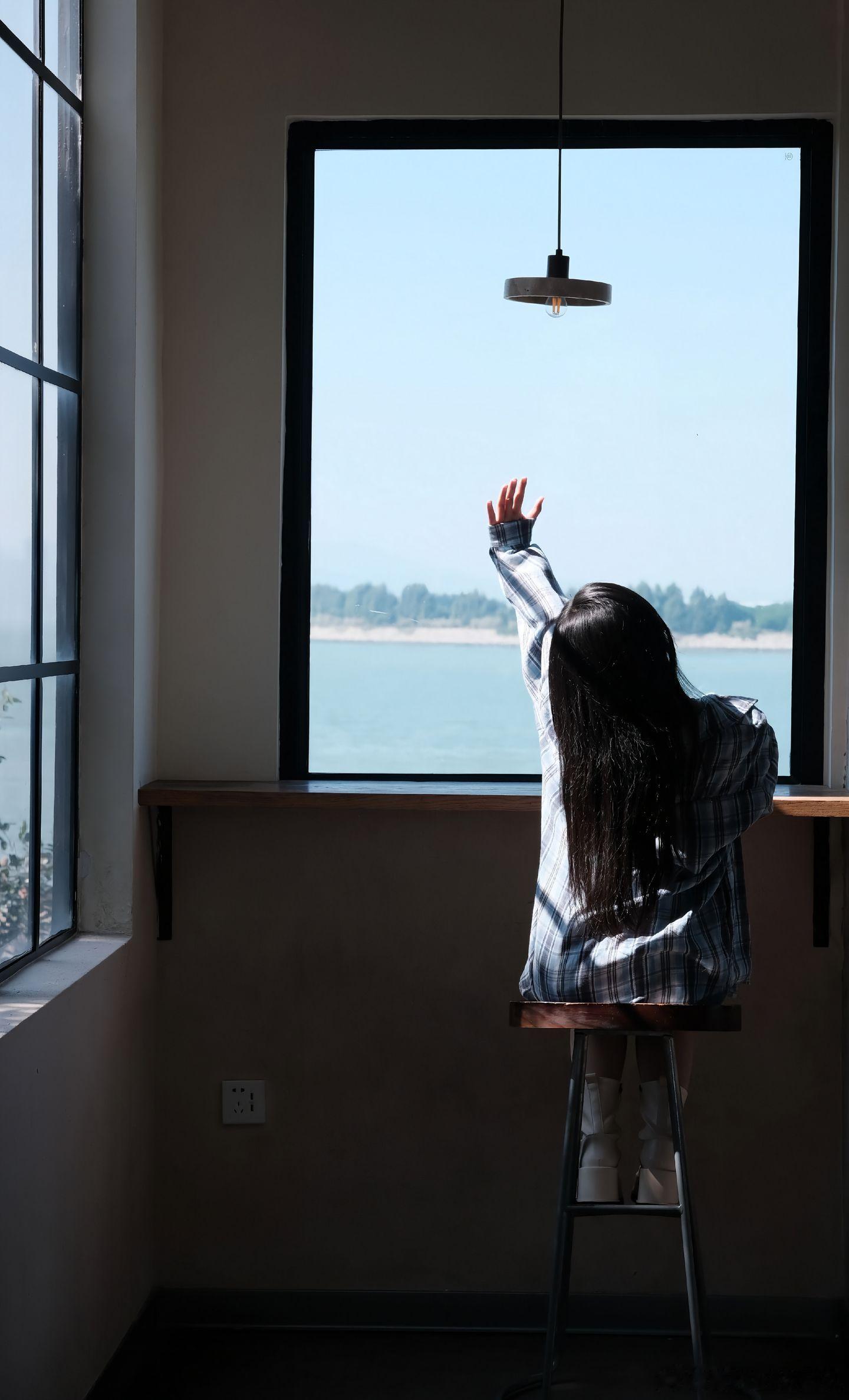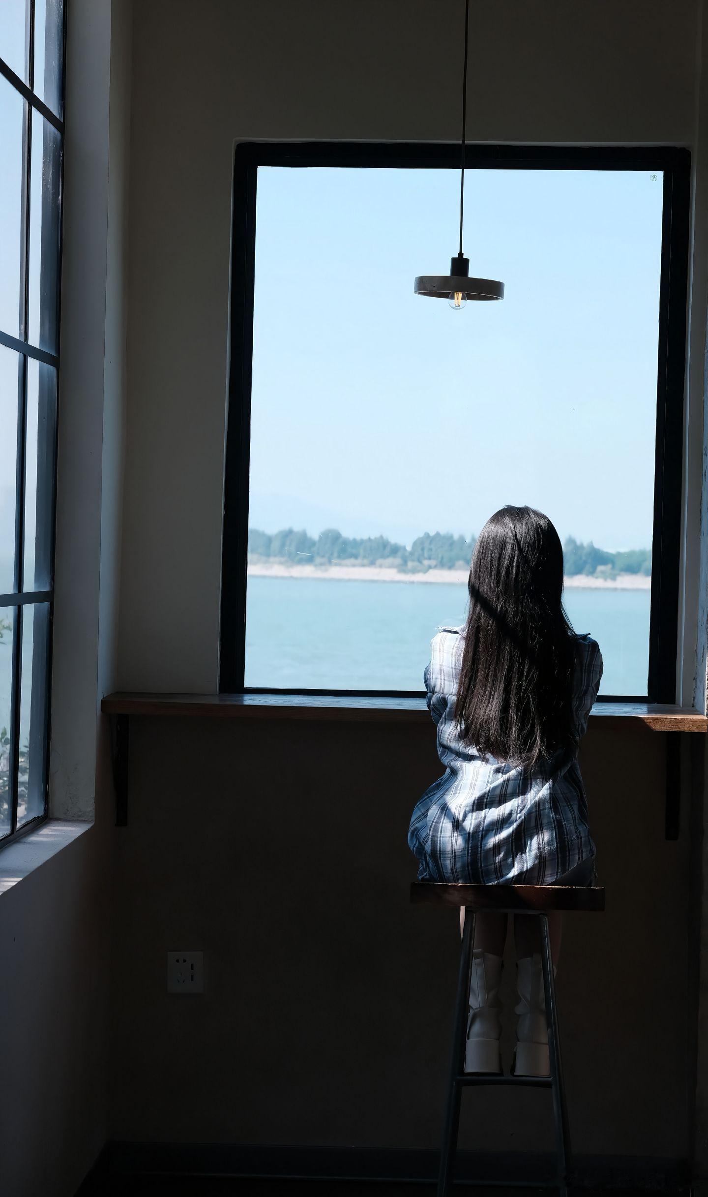 悠闲午后,少女在阳台轻倚栏杆,微笑如花。花树上的小憩窗边静谧写真秋日小憩照
