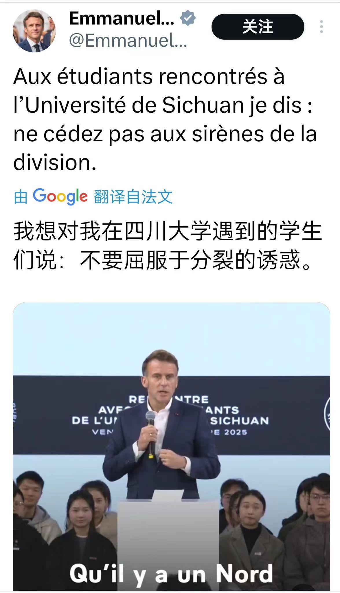 我相信马克龙是真心话! 马克龙离开中国后的发文说:不要屈服于分裂的诱惑。 我相信他是真诚的。毕竟,我们是五常中唯一尚未完成统一的国家。我想,他应该是想要表达对中国统一大业的支持。 就算有几个苍蝇碰壁,嗡嗡叫,几声凄厉,几声抽泣。全世界华人,没有100%,也有95%以上是支持中国统一的,这一点自信,我们还是相当有的。 Source: X