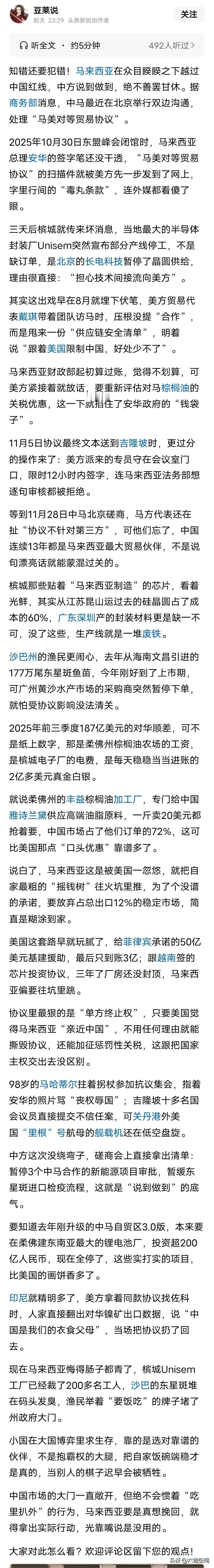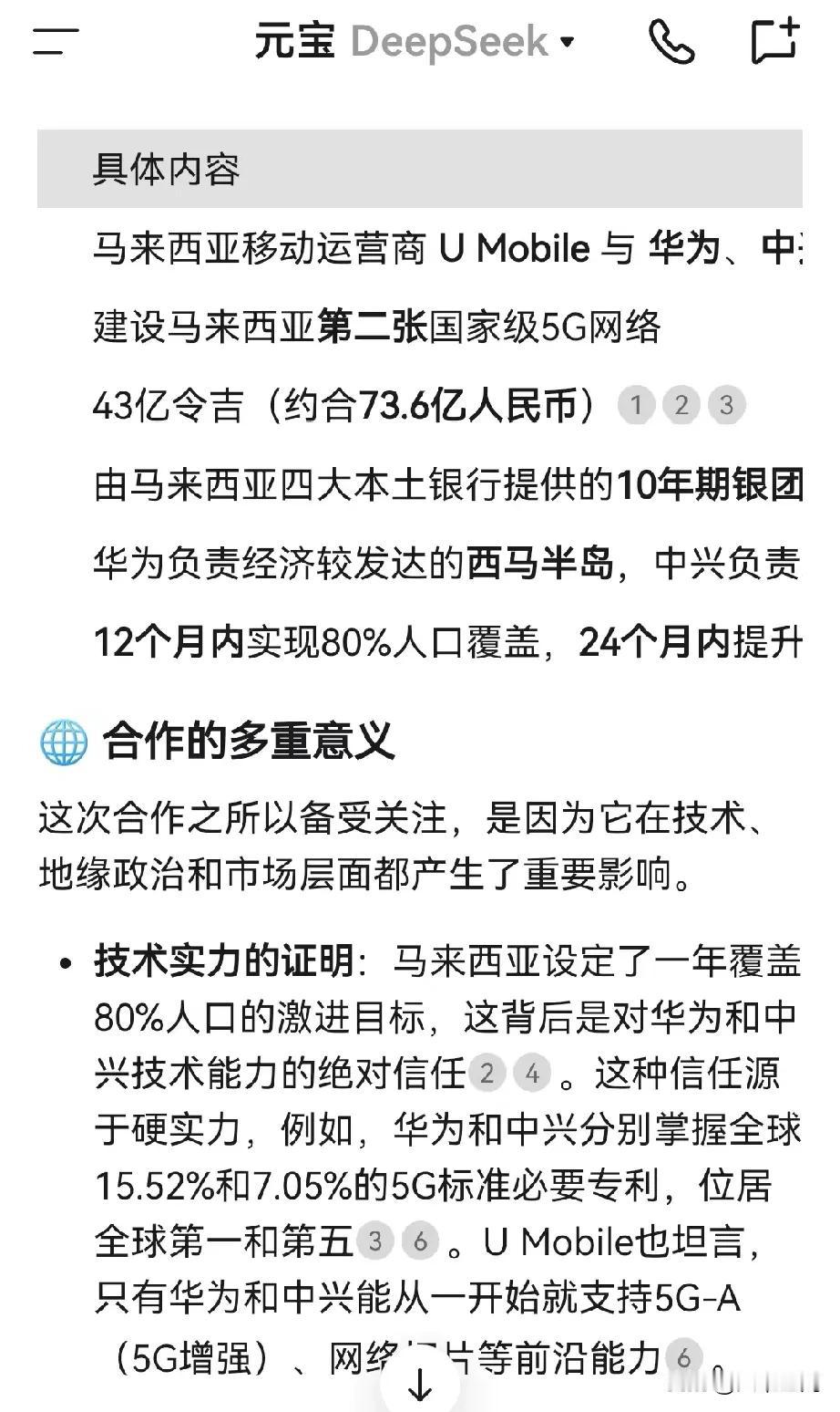 马来西亚被敲打后,把整个国家的5G订单给了华为中兴?刚刚看到网上说马来西亚下血本,凑了73.6亿,下单华为中兴的5G设备,不知道真假,因为没有看到权威媒体报道,所以我问了deepseek,好像有这回事,马来西亚前阵子因为好像跟美国签了协议,居然同意配合美国针对我们,然后被敲打了,叫停了好几个合作的项目和订单,然后就有马来西亚下单华为中兴的消息出来,我觉得会不会是马来西亚认错的表现,就两边都平衡,就把5G订单给我们,这是美国人最不喜欢的,但是马来西亚已经签了协议了,美国也不好说什么!