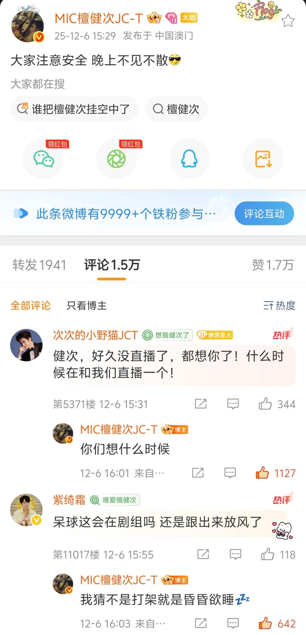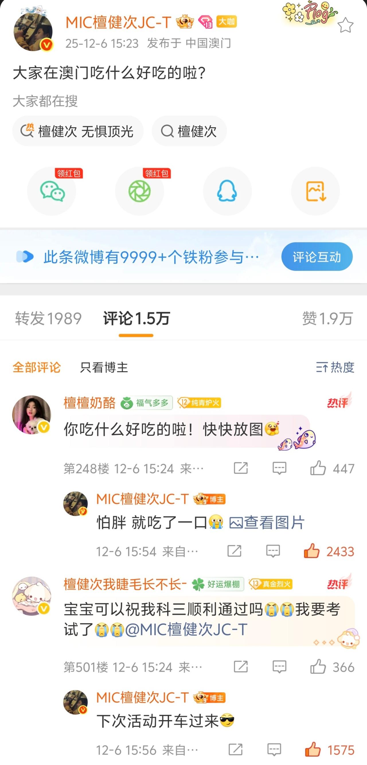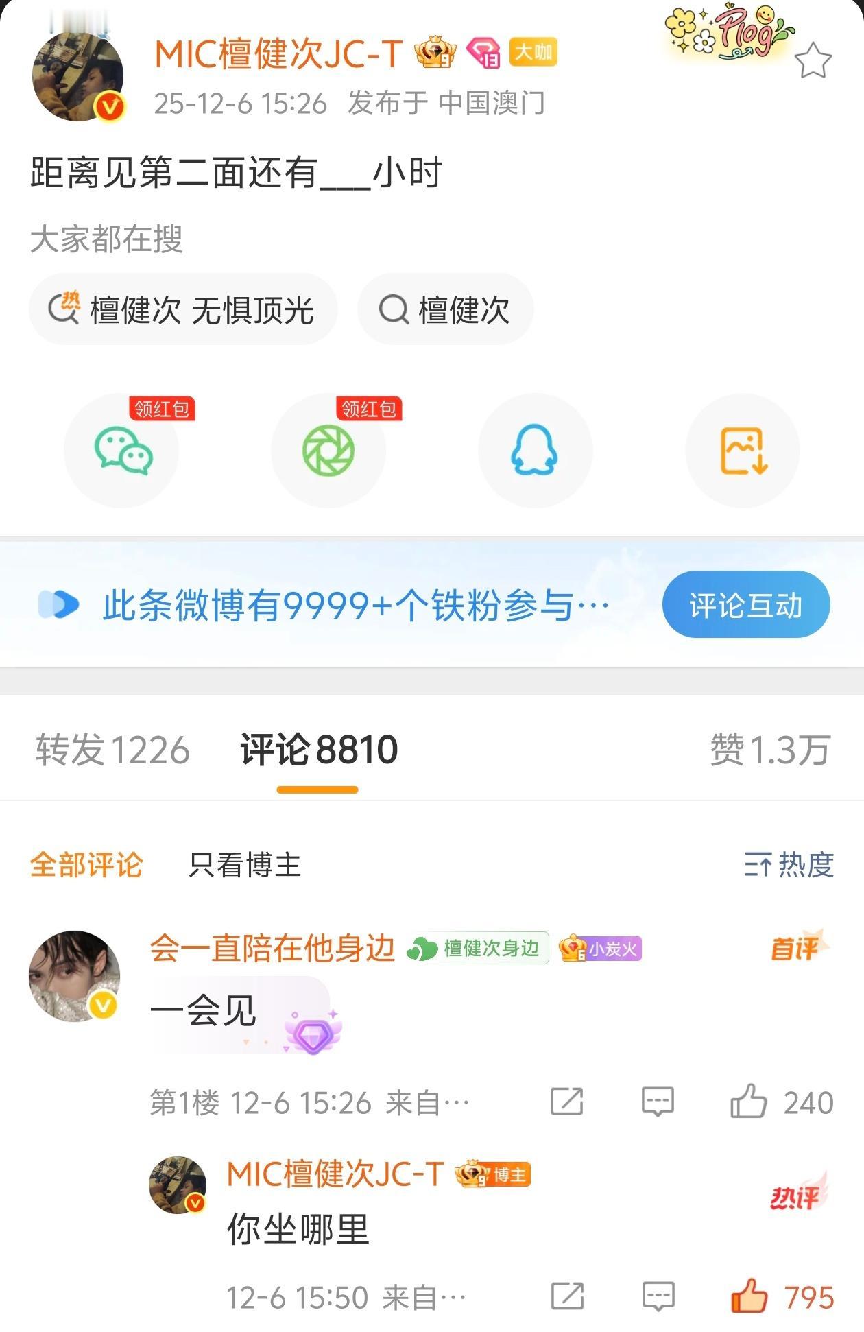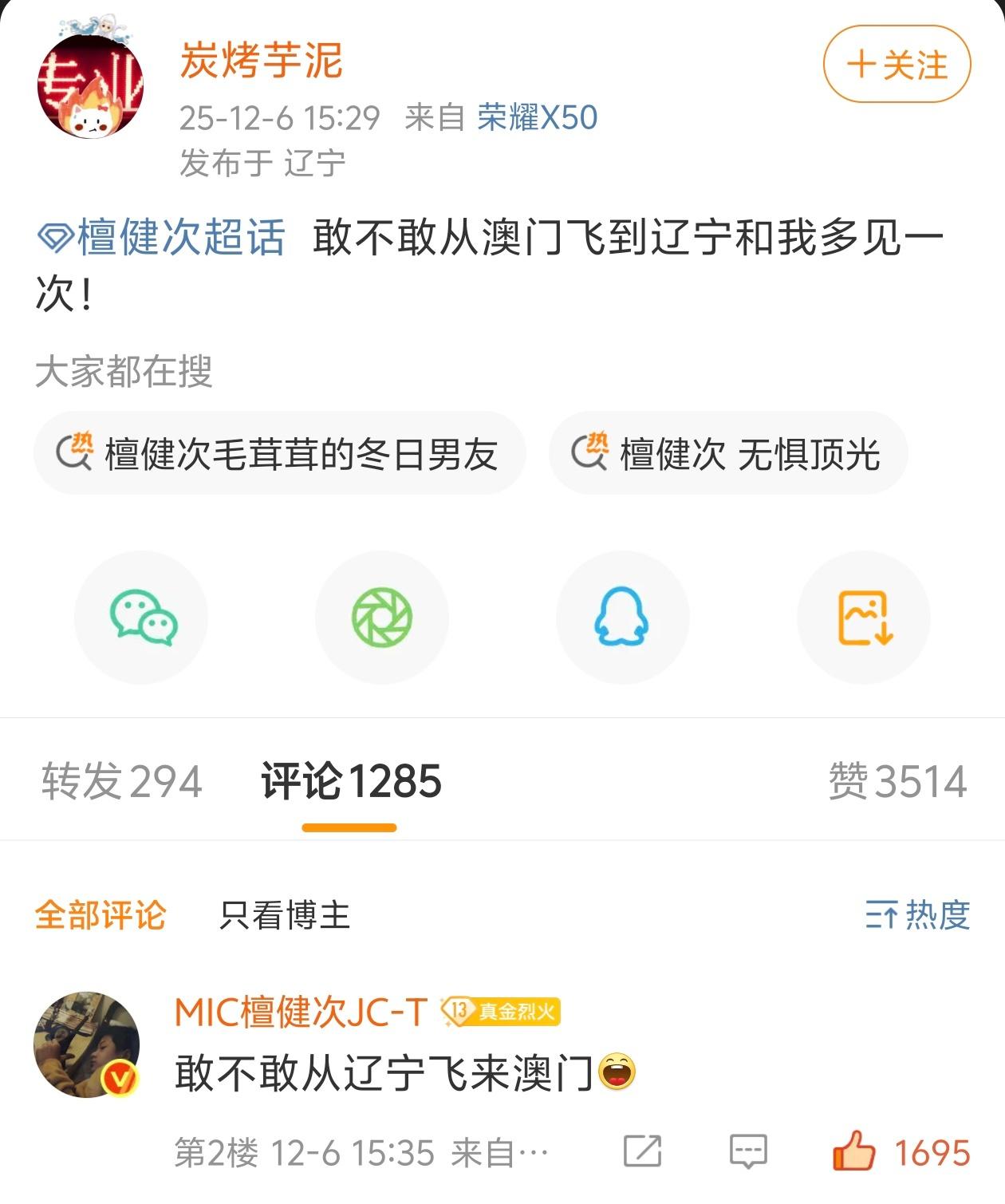 檀健次真的是好爱粉丝的一个人,短暂的休息时间用来和我们聊了这么长时间的天,刚刚结束和小炭火的见面,回去就趁着爱奇艺候场中空降超话和大家有烟火气的聊天,特别宠溺特别温柔,简直是有问必答! 每次大哥『面对面』和我们聊天,总是忍不住爱意泛滥,秒变大漏勺,让大家收获满满!时而幽默时而温暖,感觉在哄我们一样的,好甜蜜好亲近好感动就说这内娱怎么可能爱谁都一样! 1️⃣檀健次:大家都在做什么呢? 小炭火:在去银河的路上! 檀健次:我也在准备了! 2️⃣檀健次:大家在澳门吃什么好吃的啦? 小炭火:你吃什么好吃的啦!快快放图! 檀健次发了个蛋挞图片:怕胖,怕就吃了一口! 3️⃣健次:可以祝我科三顺利通过吗?我要考试了! 檀健次:下次活动开车过来[酷]! 4️⃣小炭火:马上要考试了,现在特别焦虑紧张! 檀健次化身心理委员说:每天默念你是最棒的! 5️⃣小炭火:工作室呢?快点把这个檀健次的手机收了,我不得劲! 檀健次:怎么还学会告状了,他们不敢! 6️⃣呆球这会在剧组吗?还是跟出来放风了? 檀健次:我猜不是打架就是昏昏欲睡! 小炭火:檀老师怎么越来越嫩了? 檀健次:我装的! 7️⃣小炭火向他撒娇:健次,好久没直播了,都想你了,什么时候和我们直播一个? 檀健次:你们想什么时候? 小炭火:现在立刻马上!择日不如撞日就今天,天气那么好! 小炭火:要不咱开几分钟直播唠呗,这样下去受不住,我不得劲我不得劲,除非开直播! 檀健次:忙完,晚点考虑一下直个播! 8️⃣三公主里的新歌有望首秀在跨年舞台! 9️⃣檀健次:很多新角色在路上 剧组工作被安排到9月了 期待 不知道为什么看到这句有点泪目了,谁懂我?檀健次真的在很努力的在让所有人安心! 最后:健次对大家说,大家注意安全,晚上不见不散! 一家人的感觉就是这样,有任何开心的事情都会忍不住与大家一起分享!檀健次真的是句句有回应,我也为有这么一个偶像而感到骄傲!