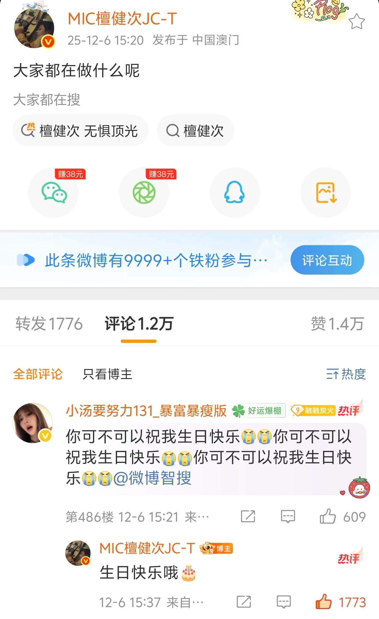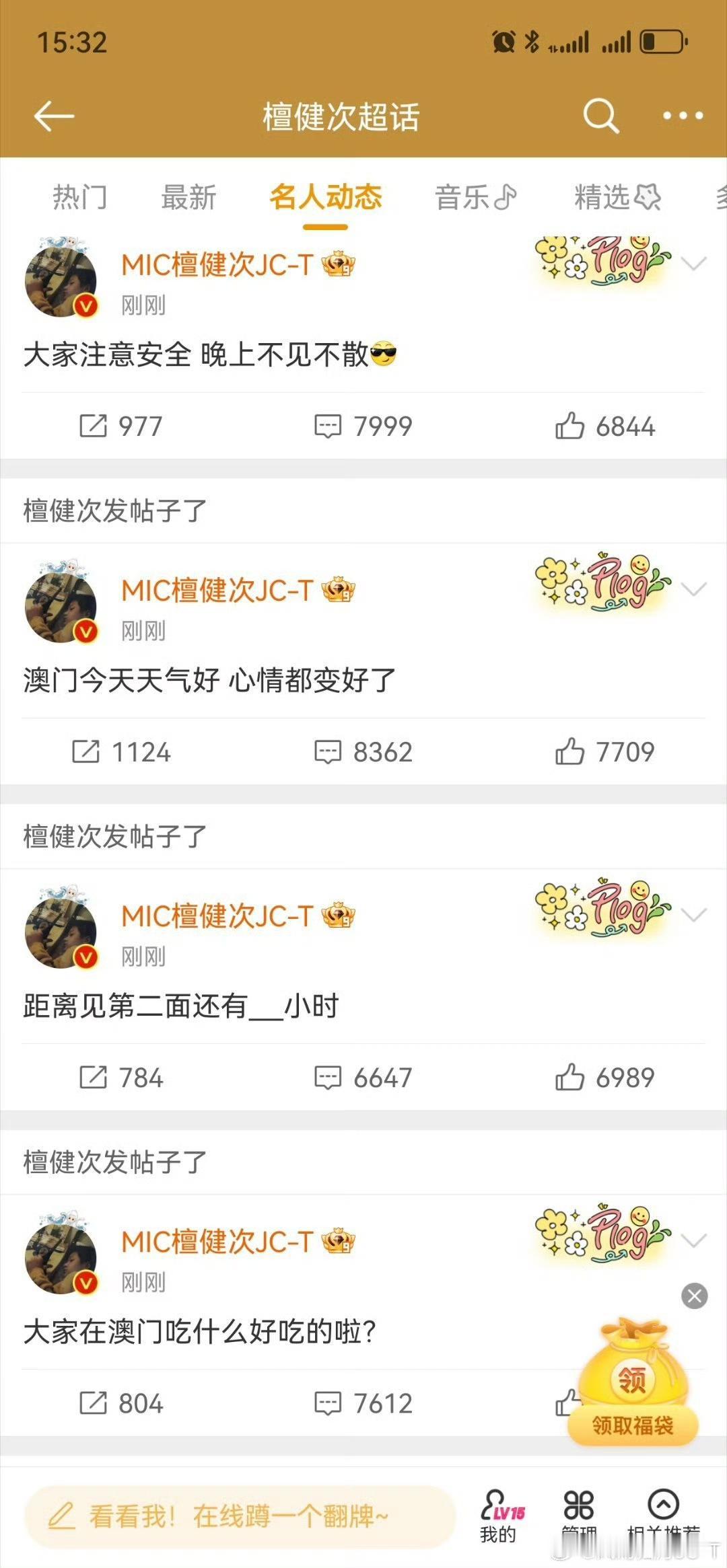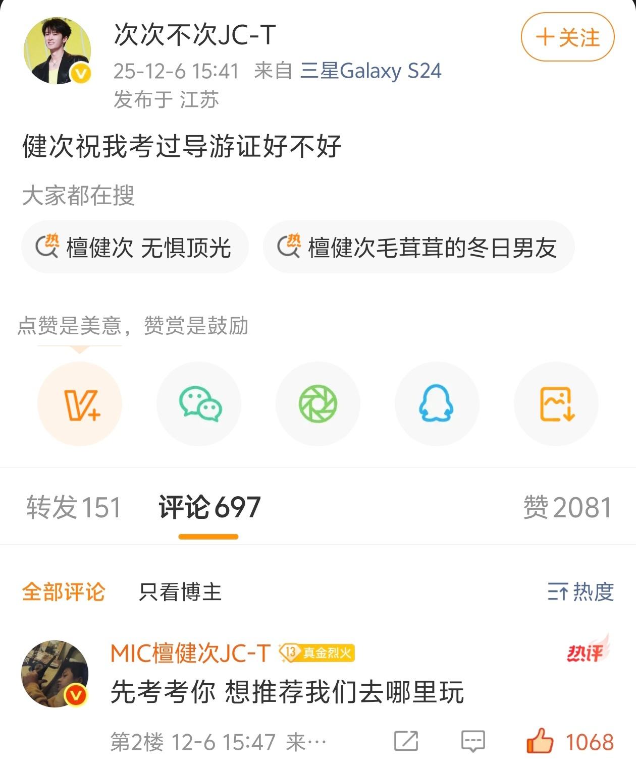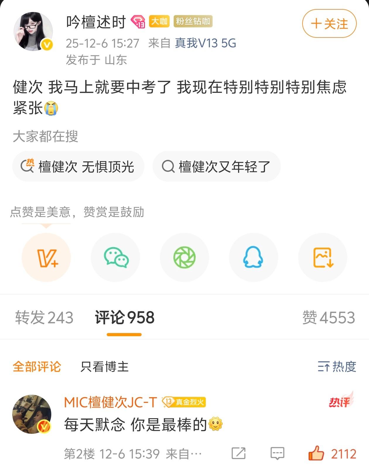 檀健次真的是好爱粉丝的一个人,短暂的休息时间用来和我们聊了这么长时间的天,刚刚结束和小炭火的见面,回去就趁着爱奇艺候场中空降超话和大家有烟火气的聊天,特别宠溺特别温柔,简直是有问必答! 每次大哥『面对面』和我们聊天,总是忍不住爱意泛滥,秒变大漏勺,让大家收获满满!时而幽默时而温暖,感觉在哄我们一样的,好甜蜜好亲近好感动就说这内娱怎么可能爱谁都一样! 1️⃣檀健次:大家都在做什么呢? 小炭火:在去银河的路上! 檀健次:我也在准备了! 2️⃣檀健次:大家在澳门吃什么好吃的啦? 小炭火:你吃什么好吃的啦!快快放图! 檀健次发了个蛋挞图片:怕胖,怕就吃了一口! 3️⃣健次:可以祝我科三顺利通过吗?我要考试了! 檀健次:下次活动开车过来[酷]! 4️⃣小炭火:马上要考试了,现在特别焦虑紧张! 檀健次化身心理委员说:每天默念你是最棒的! 5️⃣小炭火:工作室呢?快点把这个檀健次的手机收了,我不得劲! 檀健次:怎么还学会告状了,他们不敢! 6️⃣呆球这会在剧组吗?还是跟出来放风了? 檀健次:我猜不是打架就是昏昏欲睡! 小炭火:檀老师怎么越来越嫩了? 檀健次:我装的! 7️⃣小炭火向他撒娇:健次,好久没直播了,都想你了,什么时候和我们直播一个? 檀健次:你们想什么时候? 小炭火:现在立刻马上!择日不如撞日就今天,天气那么好! 小炭火:要不咱开几分钟直播唠呗,这样下去受不住,我不得劲我不得劲,除非开直播! 檀健次:忙完,晚点考虑一下直个播! 8️⃣三公主里的新歌有望首秀在跨年舞台! 9️⃣檀健次:很多新角色在路上 剧组工作被安排到9月了 期待 不知道为什么看到这句有点泪目了,谁懂我?檀健次真的在很努力的在让所有人安心! 最后:健次对大家说,大家注意安全,晚上不见不散! 一家人的感觉就是这样,有任何开心的事情都会忍不住与大家一起分享!檀健次真的是句句有回应,我也为有这么一个偶像而感到骄傲!