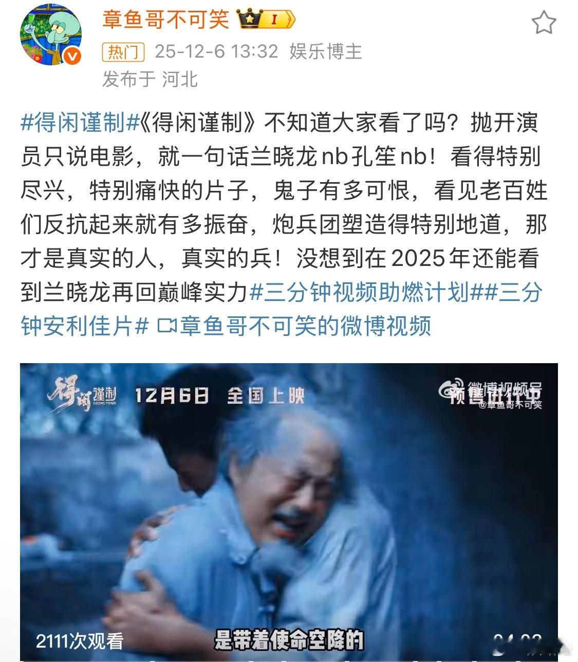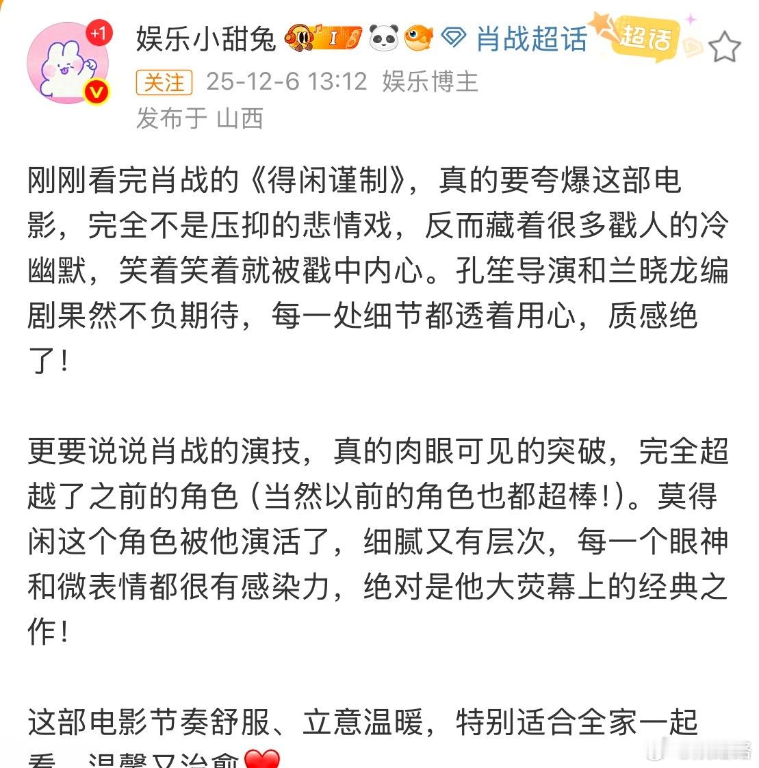 得闲谨制得闲谨制今天终于上映了,看得我好想哭制作方选在这个时间段上映(前有鬼灭之刃,后有疯狂动物城),本身就是一种自信与力量的象征不愧是是正午阳光,中国电视剧品质的保证现在电影的质量也打响了,不愧是十年磨一剑他们真的好真诚肖战也好真诚啊,作为顶流的他,本可以演一些轻松的剧或者参加一些又挣钱又轻松的综艺,他都没有。就是一直在潜心创作、努力做好演员,从陈情令到斗罗大陆到余生请多指教再到藏海传再到得闲谨制,能看到肖战演技的巨大进步。其他演员也很真诚,尹正演技也很炸裂。整个电影让我看到了电影美好的未来,现在票房也非常好,口碑也特别好。未来会越来越好的肖战电视剧 得闲谨制