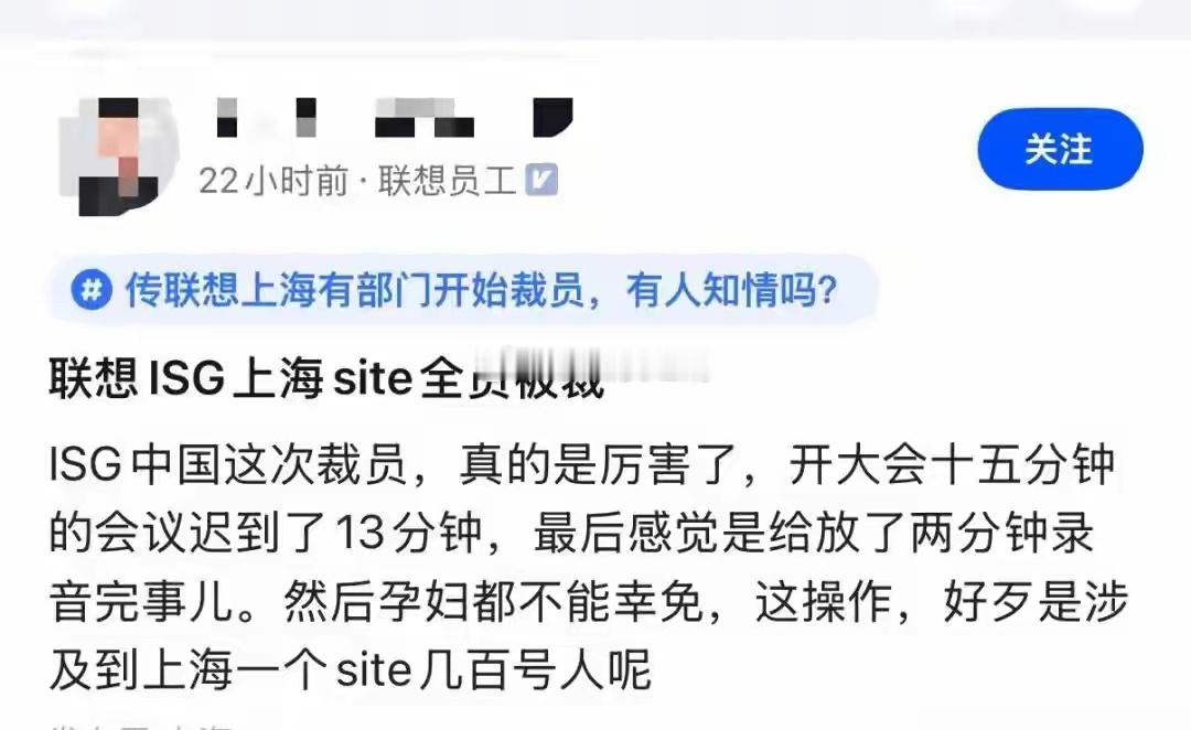 曝:联想上海,两分钟光速裁员数百人!孕妇也裁!近日,据多名认证信息为联想员工的网友爆料,联想ISG上海全员被裁。该员工称,联想ISG中国此次裁员沟通会仅开了15分钟,且会议迟到了13分钟,播放了两分钟录音即宣布裁员事宜,孕妇都不能幸免另有员工称,不仅上海,北京也会干掉,中国区软件,固件,OS全部裁撤,涉及北京、上海、天津和深圳等地。