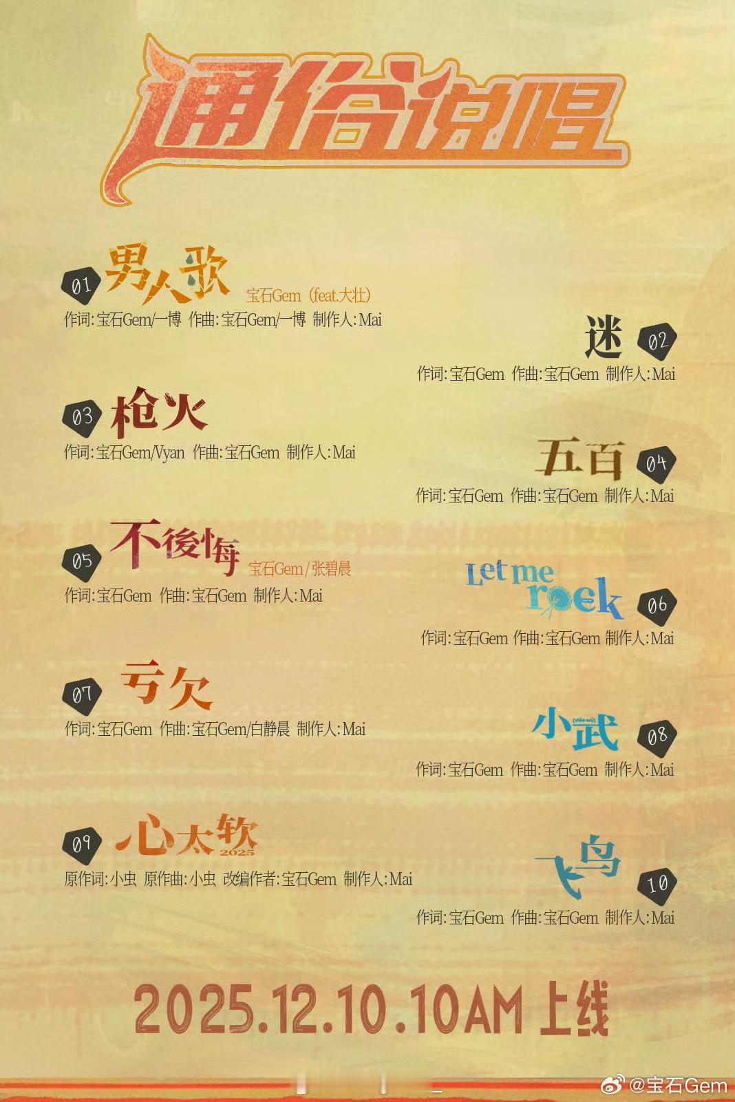 来了!宝石老舅公开《通俗说唱》曲目🔥10号发布!此前老舅曾表态这是一张“去说唱化”的说唱专辑!