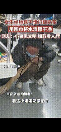 小事见文明,细节看人品!女子坐地铁不慎打翻奶茶,用仅剩的卫生纸没擦干净后,女孩又拿自己的围脖又仔细擦干净。地铁工作人员得知后,联系上了女孩,给她送了新的围巾和文创产品。 视频发到网上后,网友纷纷赞扬女孩的素质很高,毕竟多数人遇到这种情况,如果用卫生纸擦不干净后都会选择不管,而女孩却选择继续用围巾擦干净,这样还得搭上一条自己的围巾,而女孩却毫不犹豫。 女孩文明的行为被地铁工作人员看见了,工作人员非常感动,于是地铁相关部门联系到了女孩,并对其公开表扬,还给女孩送了一条新围巾和地铁的相关文创产品。 女孩的地铁相关人员的行为,都是在弘扬社会正能量,为大家做了一个好榜样。老话说小事见文明,细节看人品。这个女孩是我们的榜样,值得赞扬,更要向她学习!