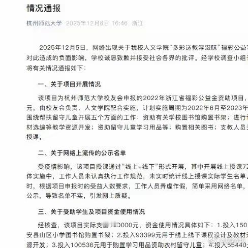 杭州师范大学通报调查结果从校方通报来看,将问题归咎于“工作人员弄虚作假”,工作人员肯定是有责任,但不能出了问题,总是工作人员背锅吧?主要负责人不用担责吗?换句话说,工作人员弄虚作假是啥动机?领导发现不了吗?领导不签字,能通过吗?还有资金明细更引发质疑:15万元的书架采购单价是否虚高?9.3万元的课程开发成果何在?物资是否真实送达?公众追问的,已不只是一份假名单,而是公益资金是否真正用在孩子们身上。热点观点