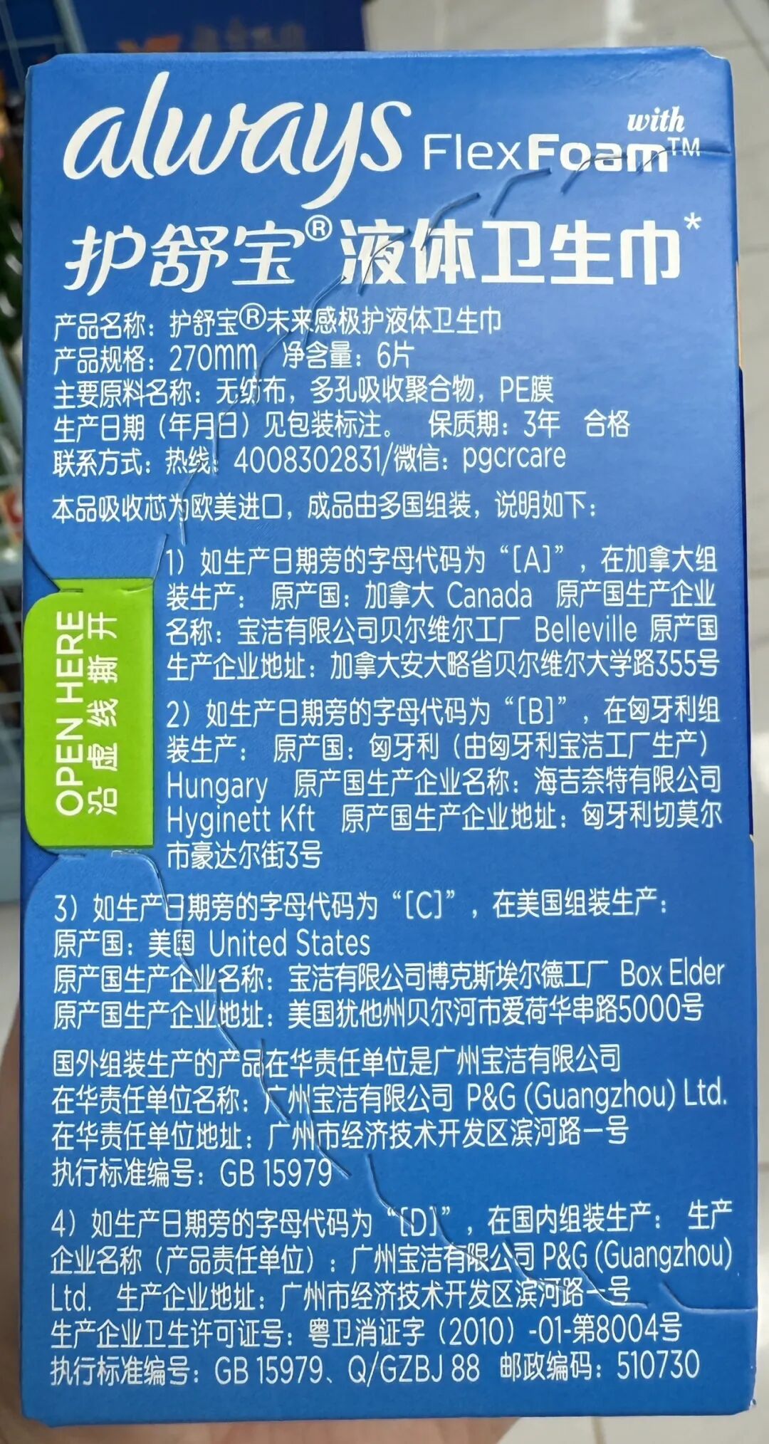 液体卫生巾的外包装信息明确显示,其吸收芯为欧美进口,成品由多国组装,包括中国、加拿大、美国、匈牙利等。官方旗舰店客服也告诉《消费者报道》记者,四个组装地的产品为随机发货。