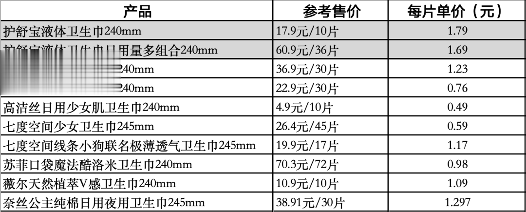 不同于常规卫生巾,护舒宝液体卫生巾的市场定价也更“高端”。近日,《消费者报道》记者对比电商平台产品发现,同规格240mm-250mm的日用型产品,护舒宝液体卫生巾的售价不仅高于其他主流品牌,也比护舒宝旗下其他卫生巾产品更贵。粗略计算,护舒宝液体卫生巾的单价已接近2元/片。