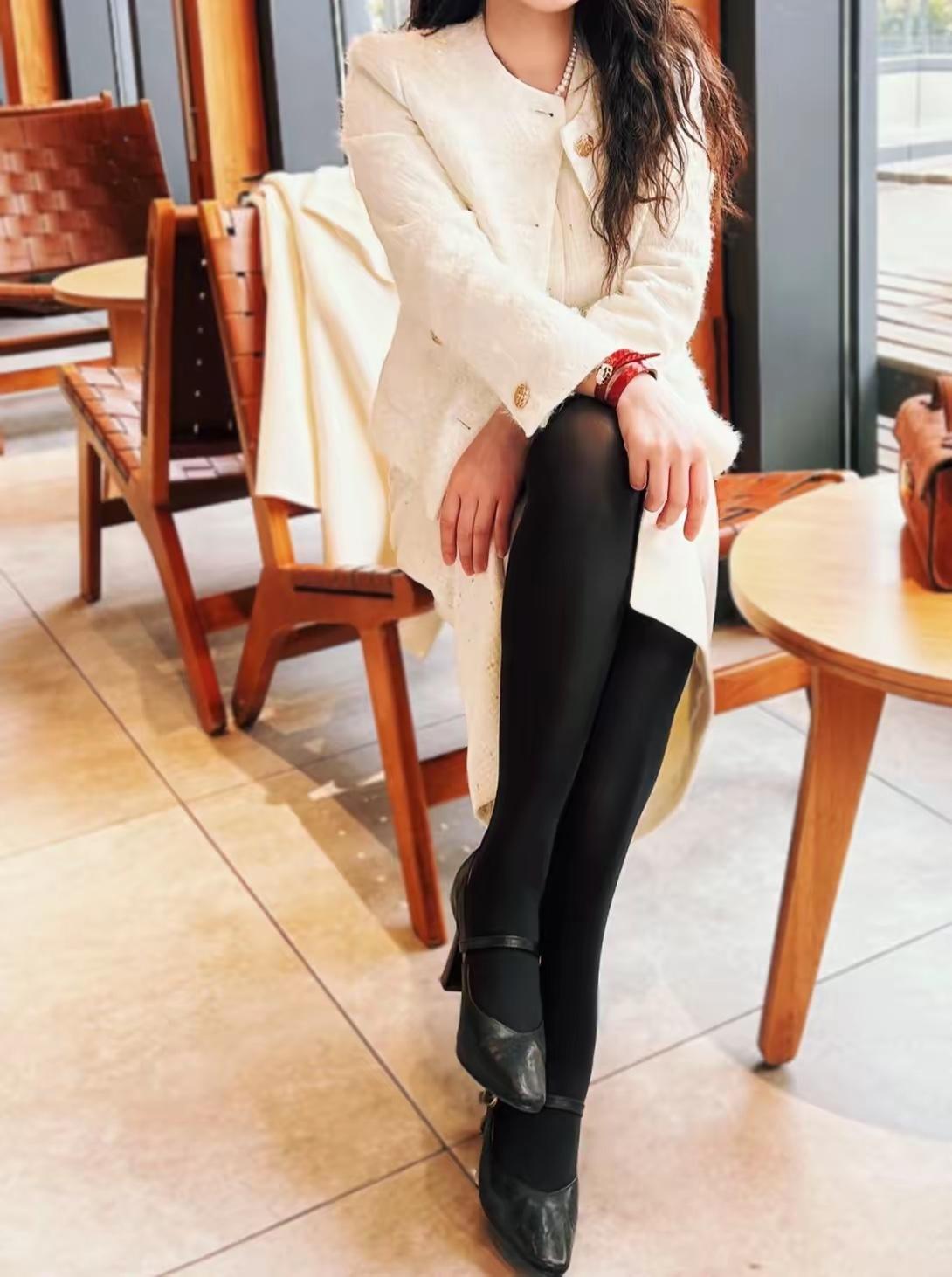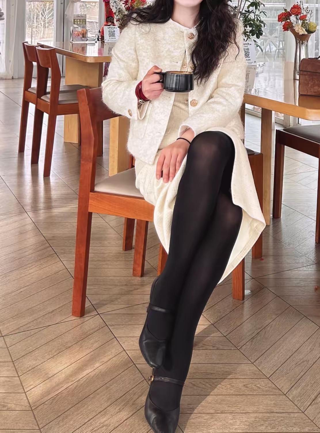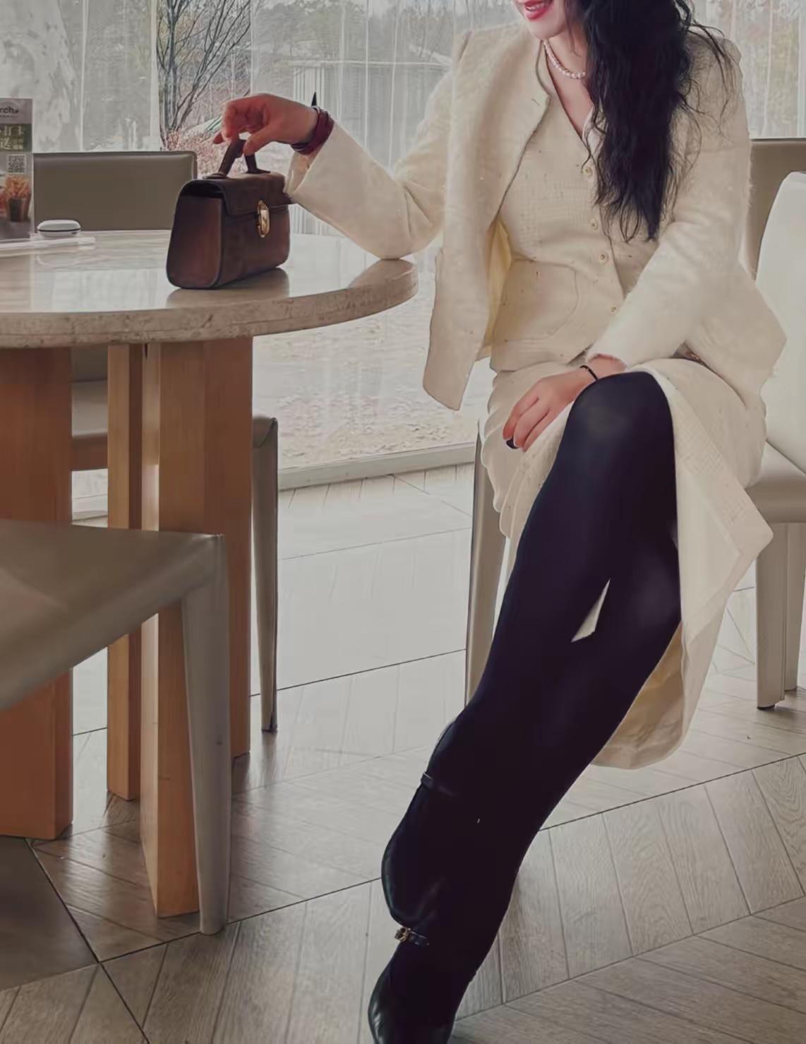 做一个气质又优雅的女子。 充满优雅与正式感的白色小香风套装,彰显贵族气质。 黑色不透肉的连裤袜庄重而不性感。 踩着黑色高跟鞋,整体风格气质十足。