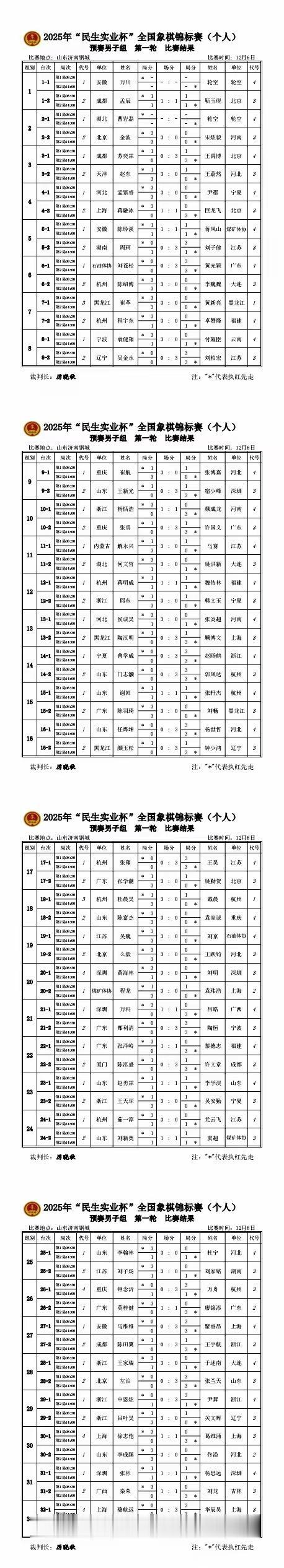 全国象棋2025个人赛第一天结果:孟繁睿、王禹博、刘柏宏、杨世哲、许文章、尹昇等取得了胜利。 比较引人瞩目的是: 许文章战胜陈泓盛, 顾博文胜前全国冠军陶汉明特大。 孟辰在劣势局面下追平靳玉砚,也保留了晋级希望。 曹岩磊、万川两人轮空。