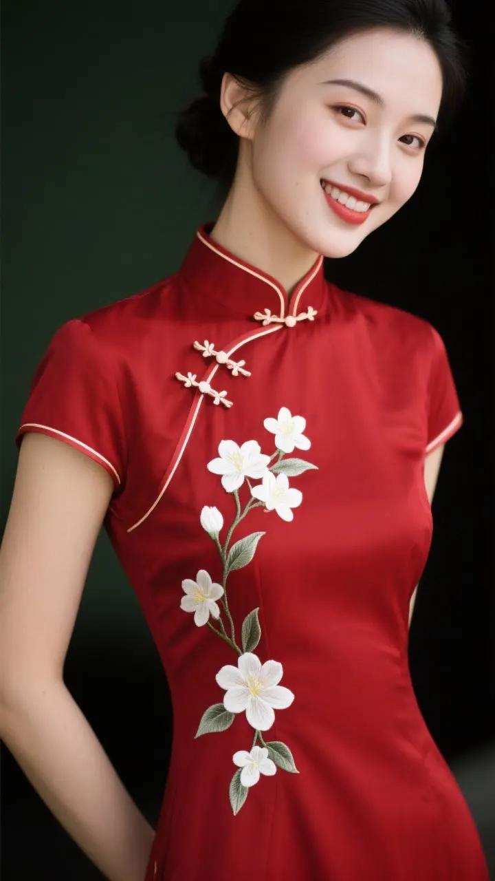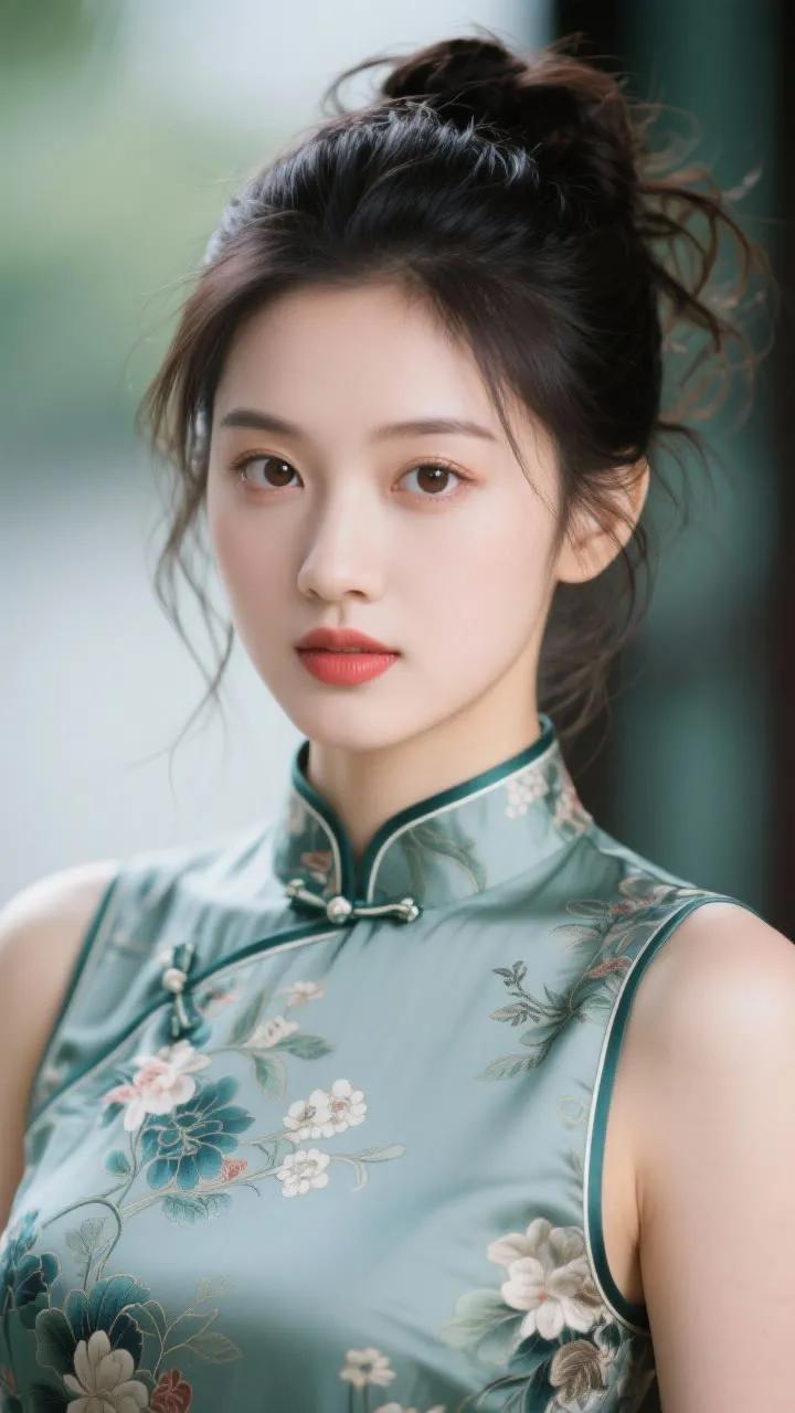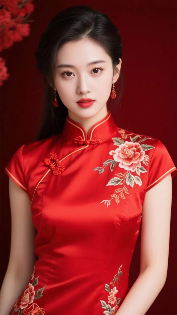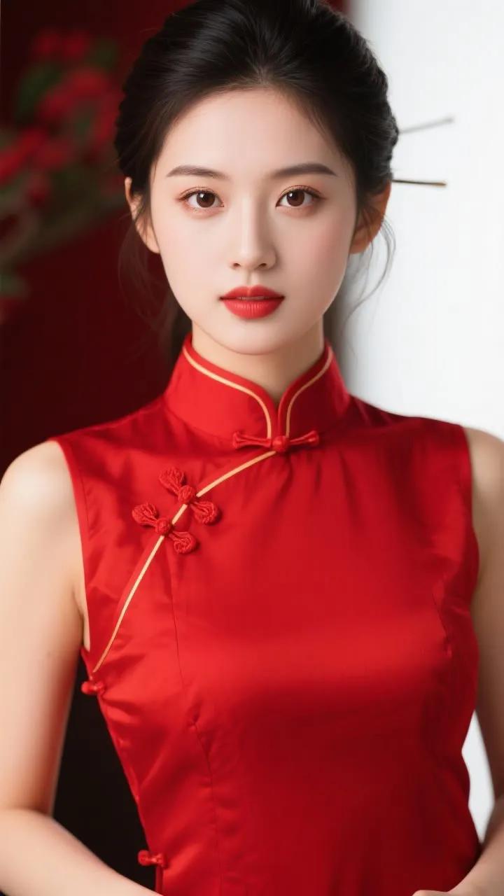 优雅旗袍少女,红唇与黑发相映成趣,古典韵味十足。